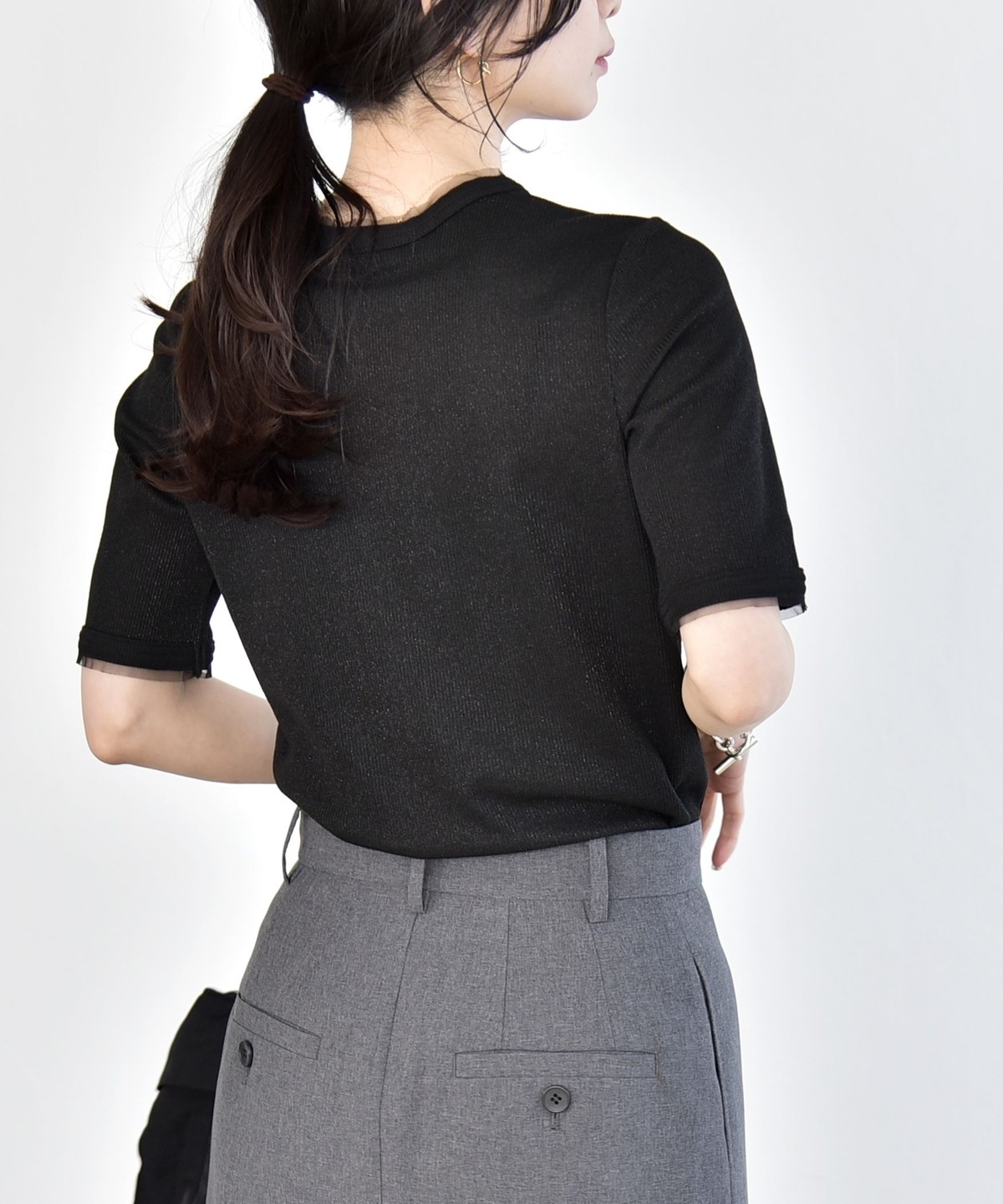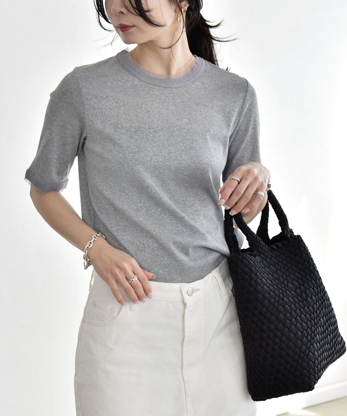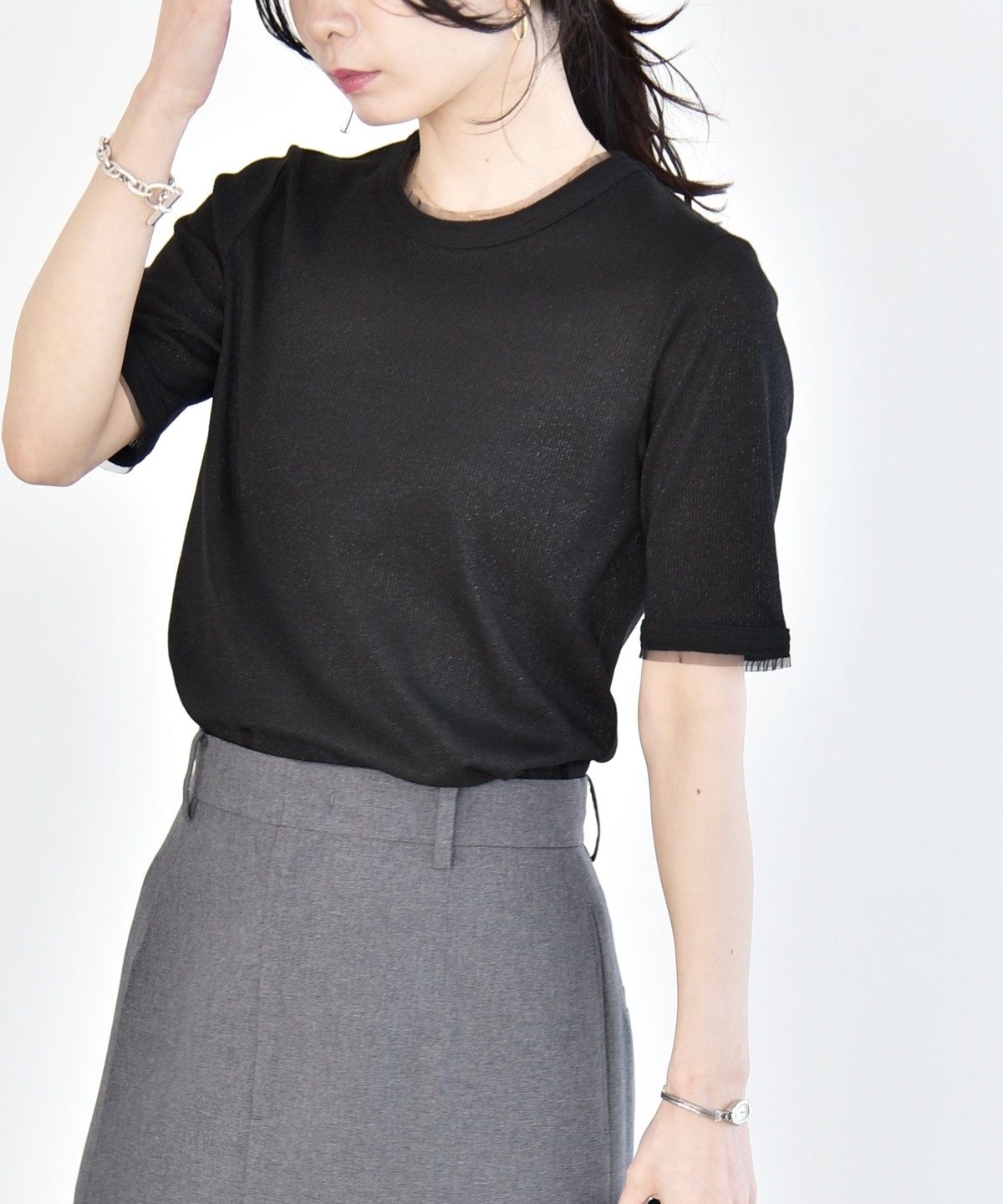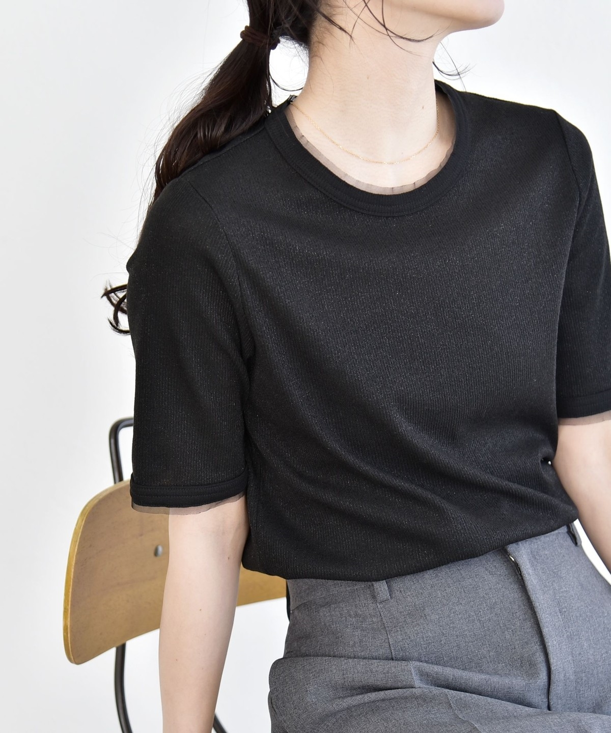 《予約》quaranciel:〈手洗い可能〉ラメ リブ ハーフスリーブ クルーネック TEE