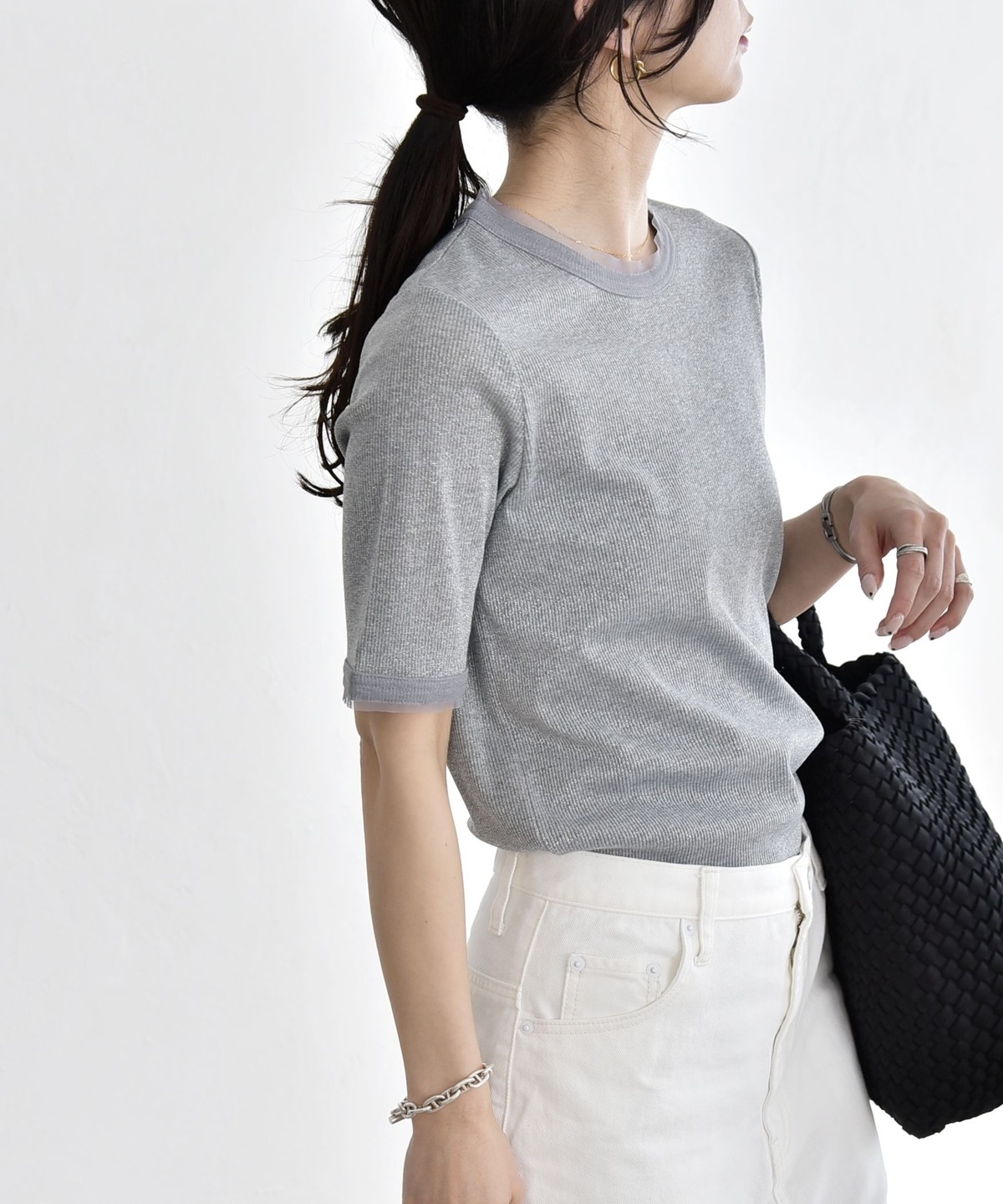 首元と袖口にはさりげなくチュールを施し、カジュアルになりがちなリブTにフェミニン要素をプラス。