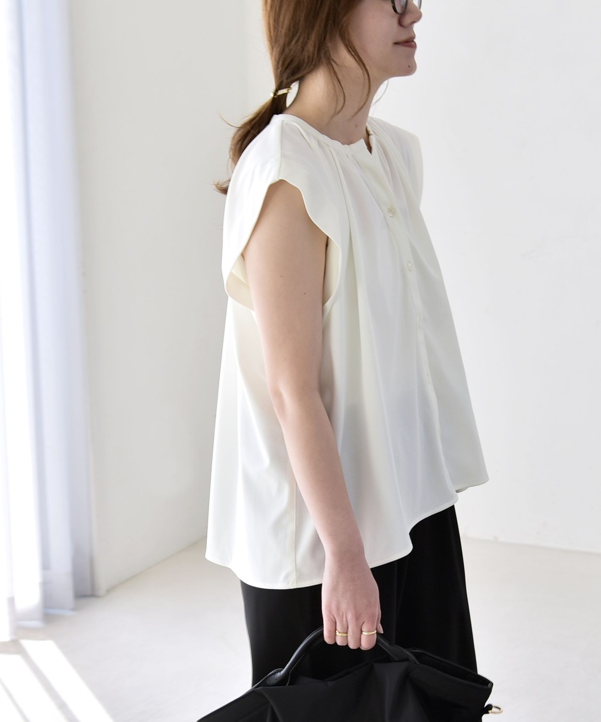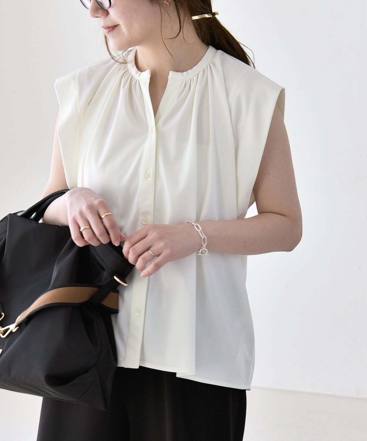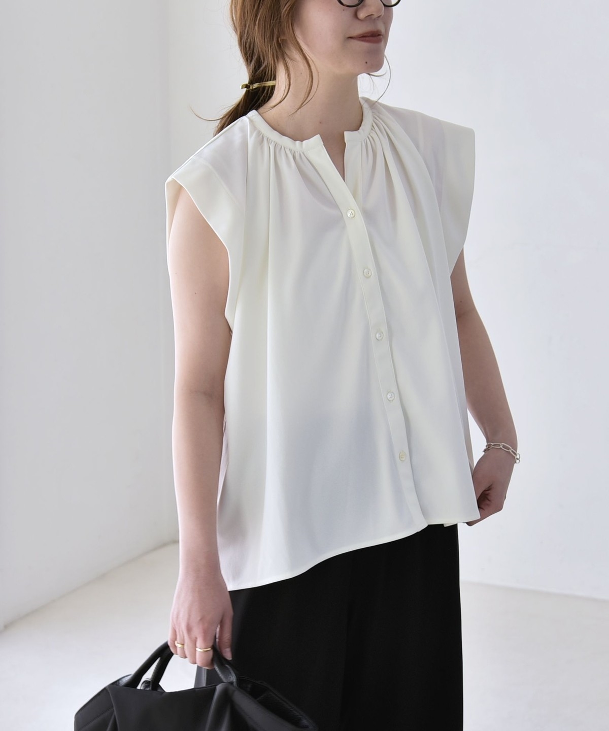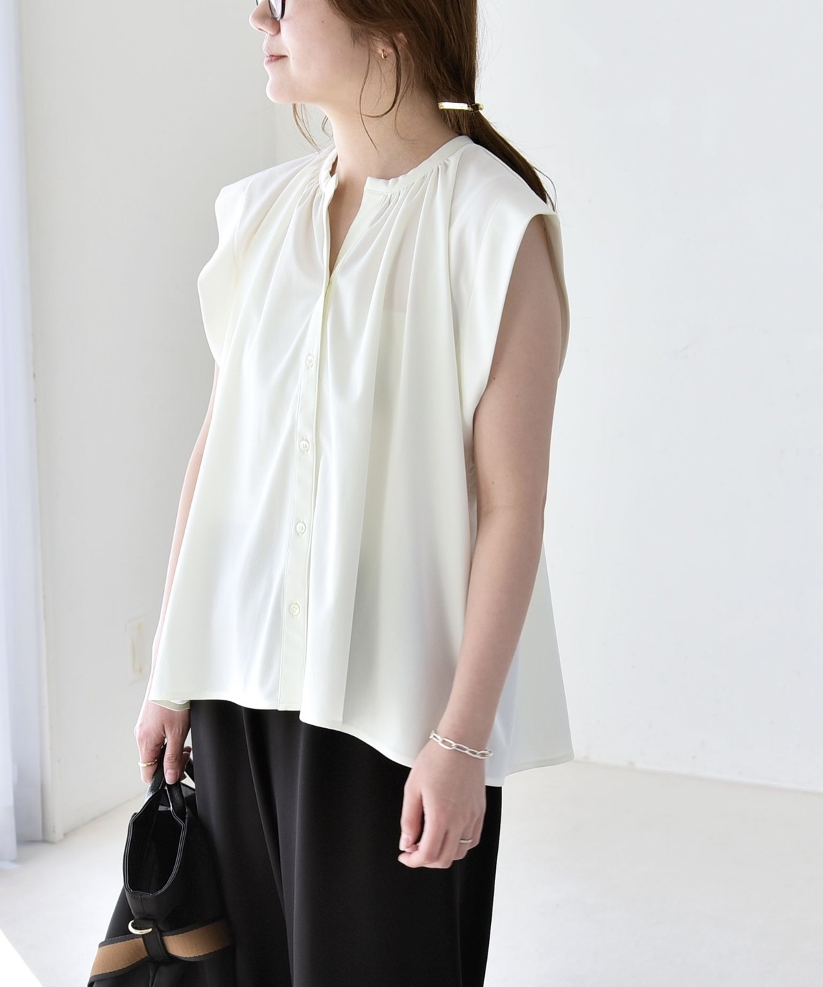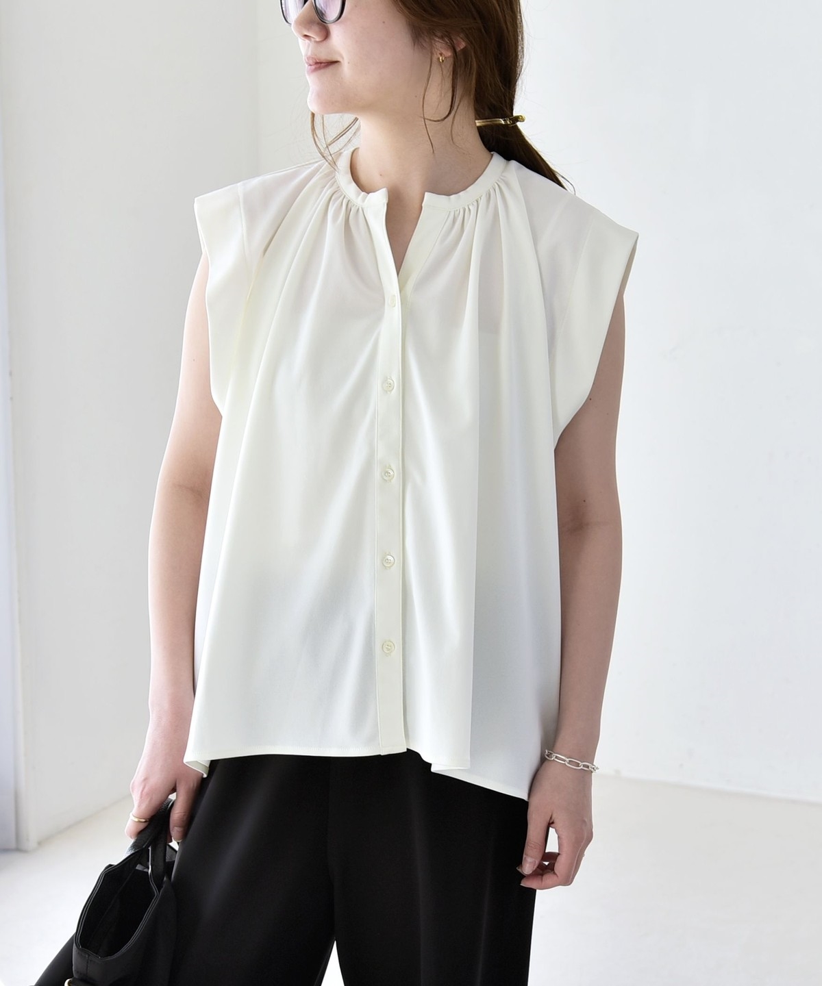 オンオフで使える、多機能ギャザーシャツ