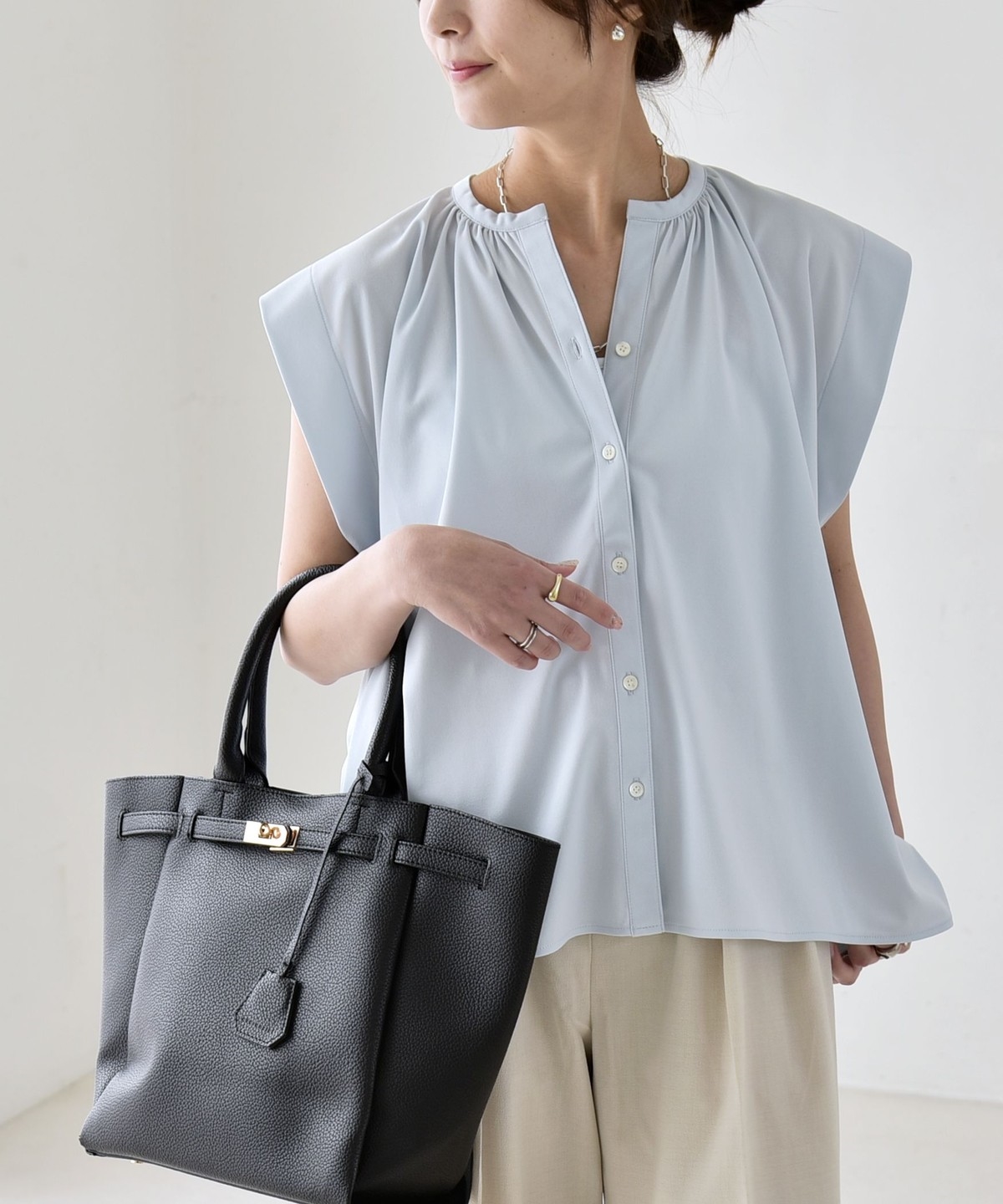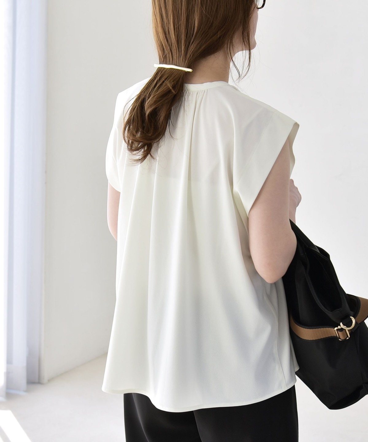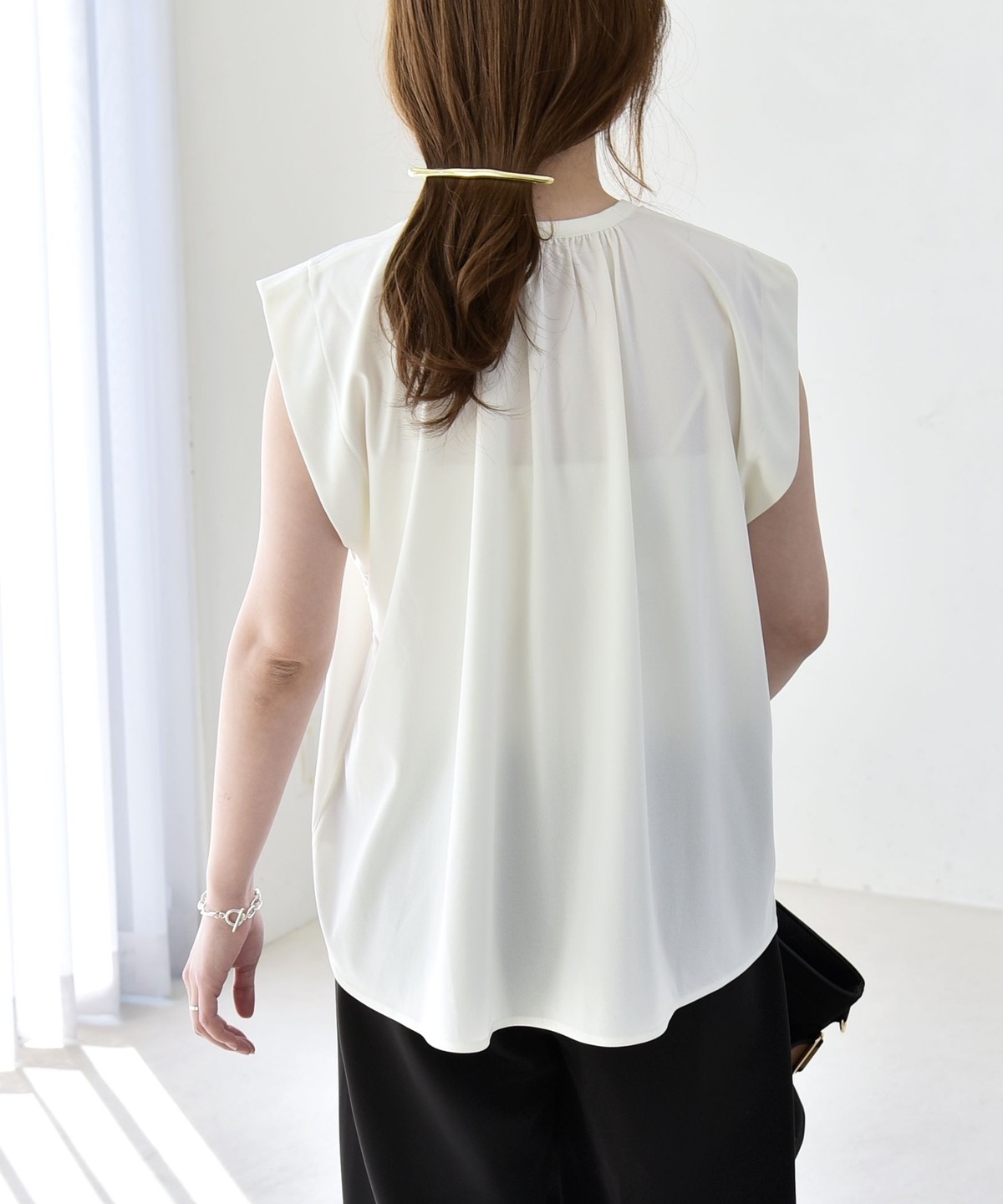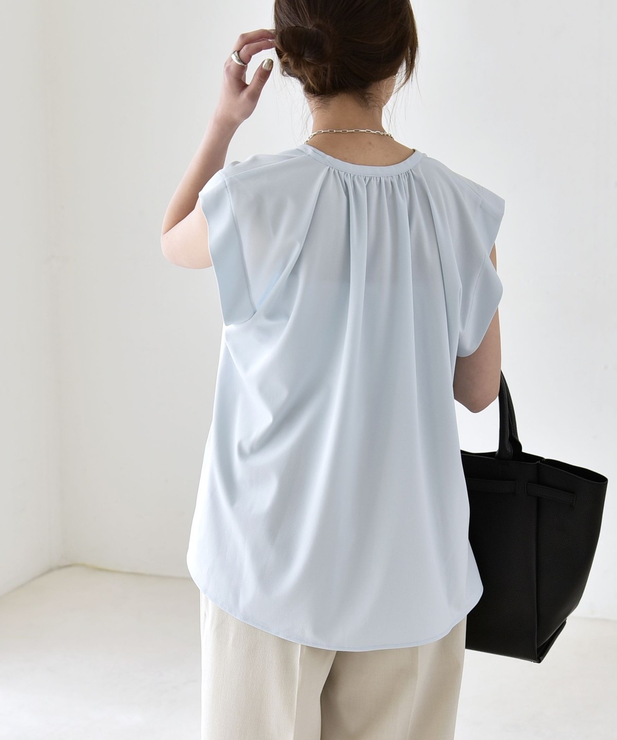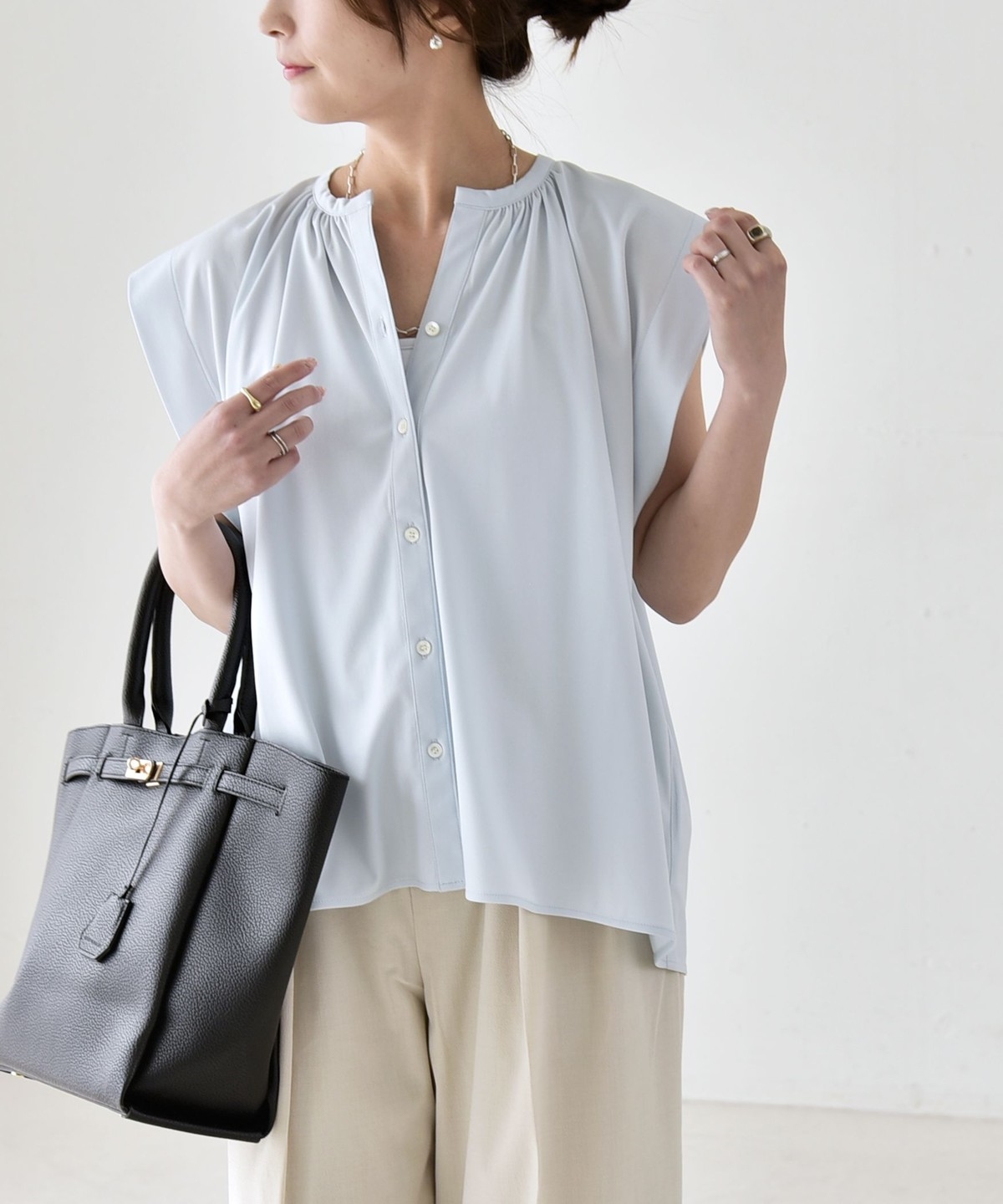 オンオフで使える、多機能ギャザーシャツ