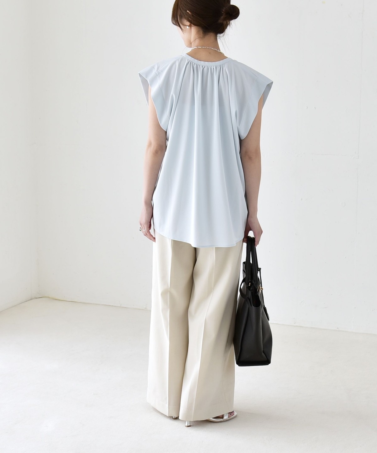首元はスキッパー襟と繊細なギャザーがアクセントになり、ゆったり感がありながらものっぺりせず立体感があって◎
