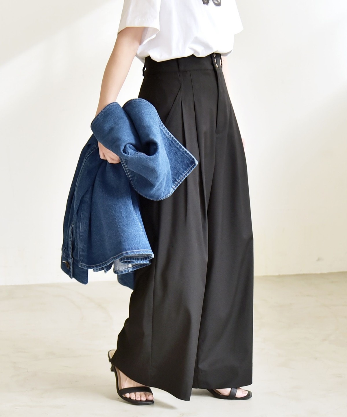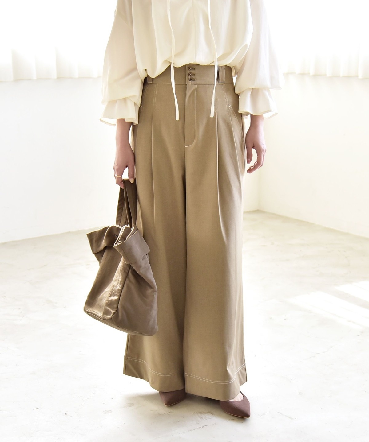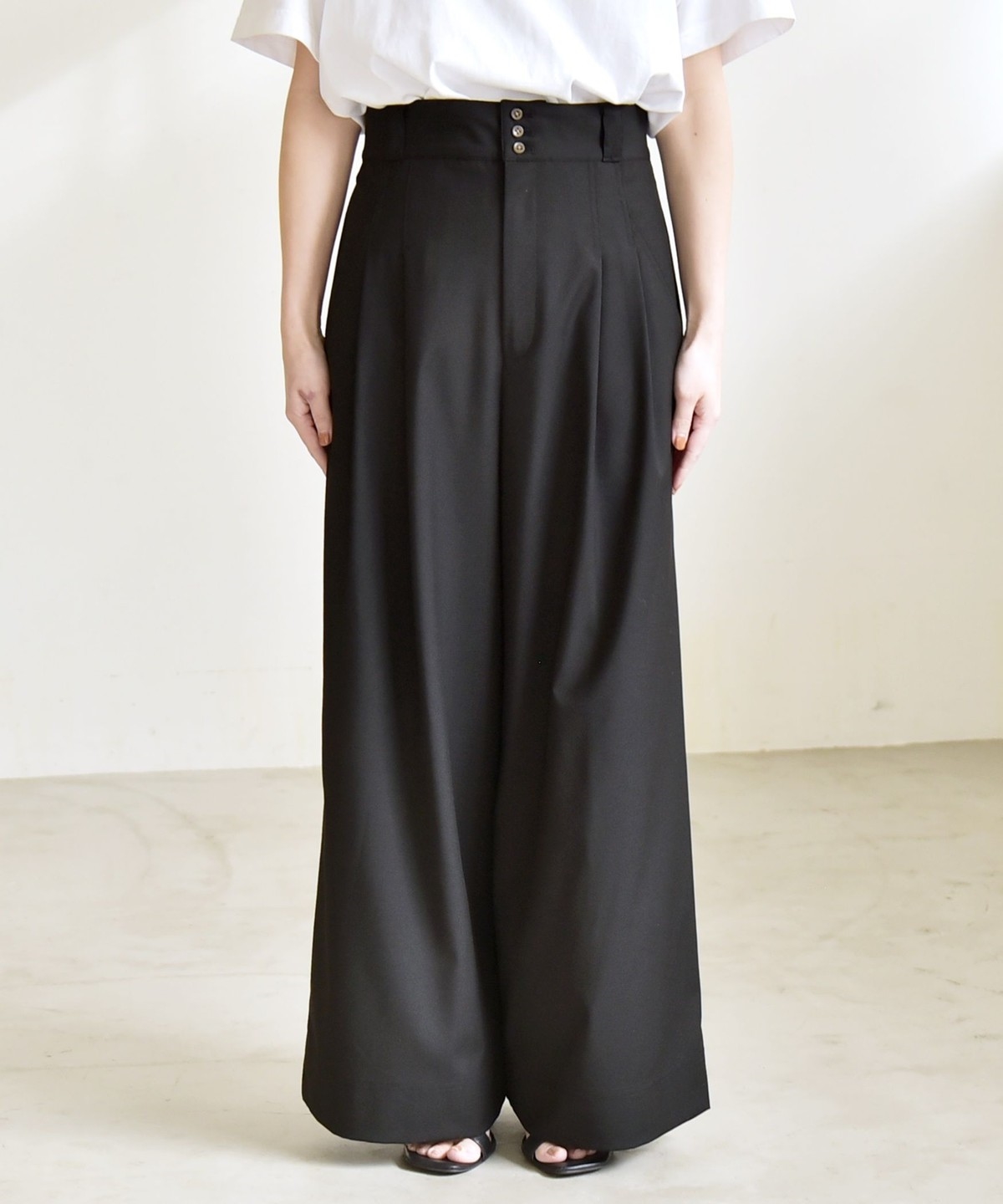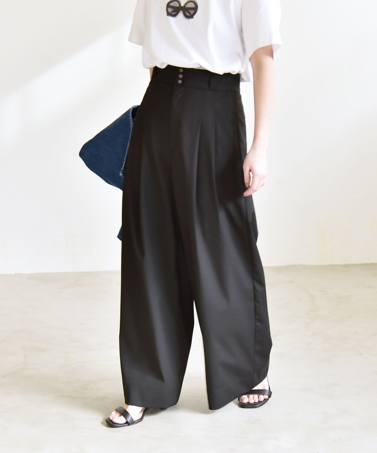 ウエストのボタンディテールがモードな雰囲気のある、ハイウエストのワイドパンツ。