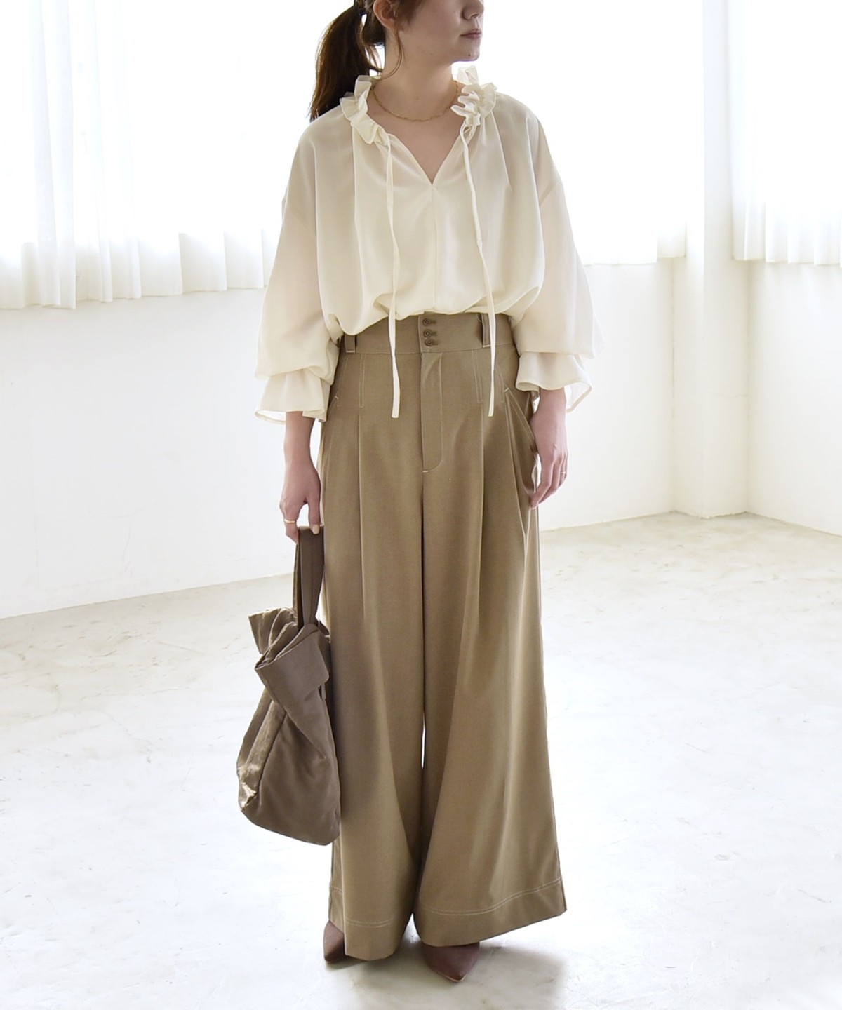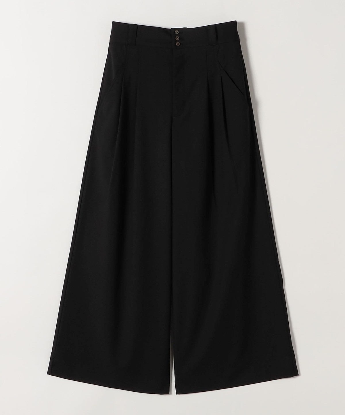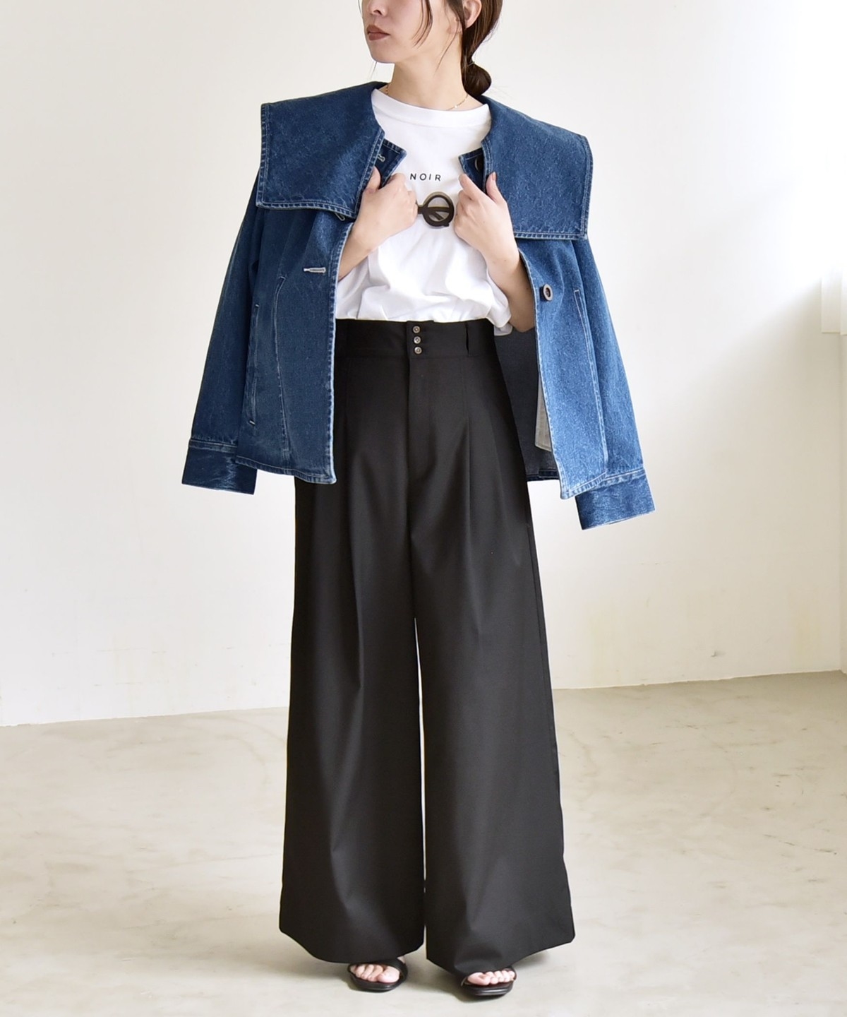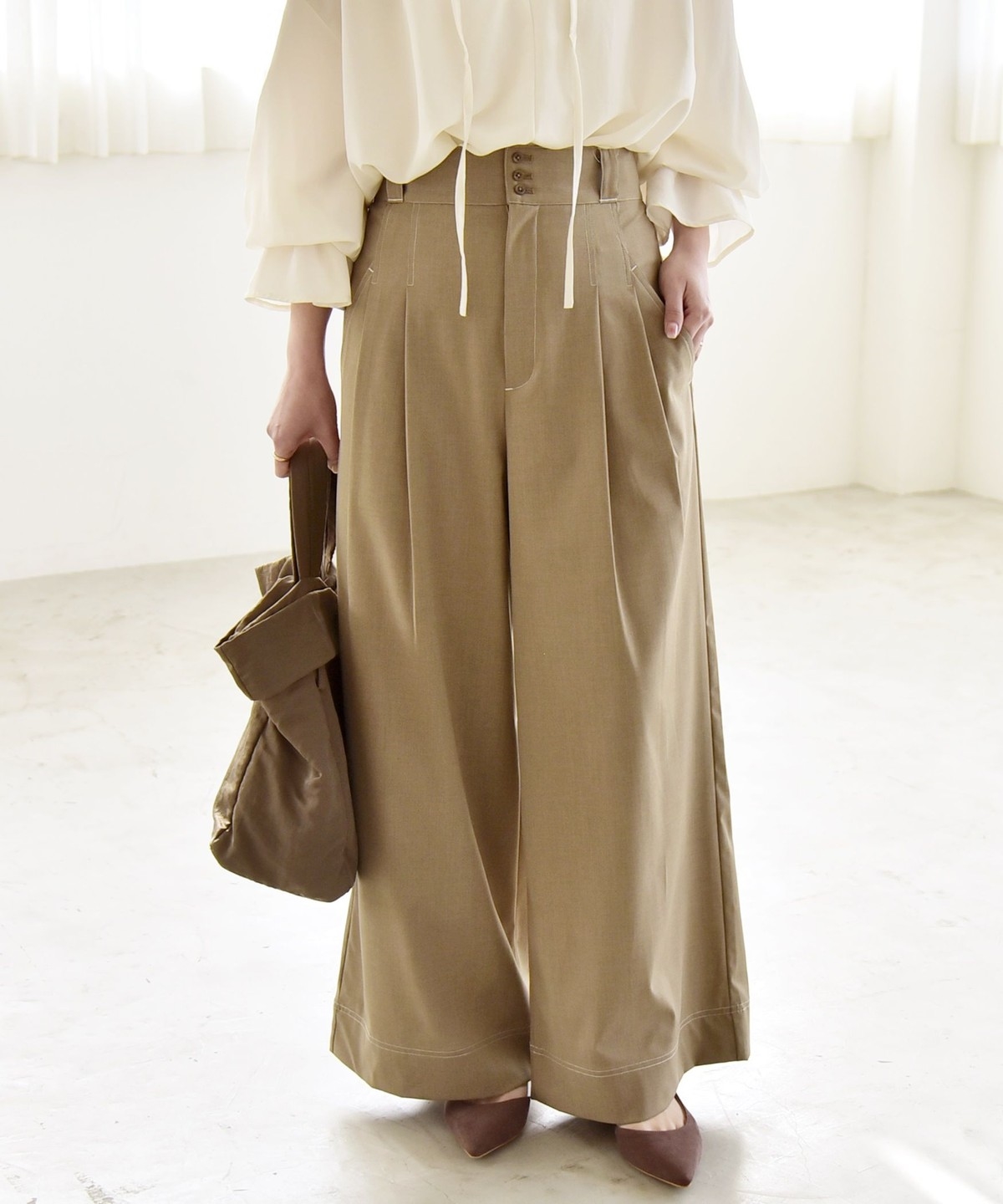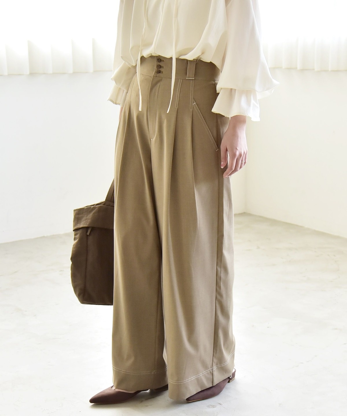 ウエストのボタンディテールがモードな雰囲気のある、ハイウエストのワイドパンツ。