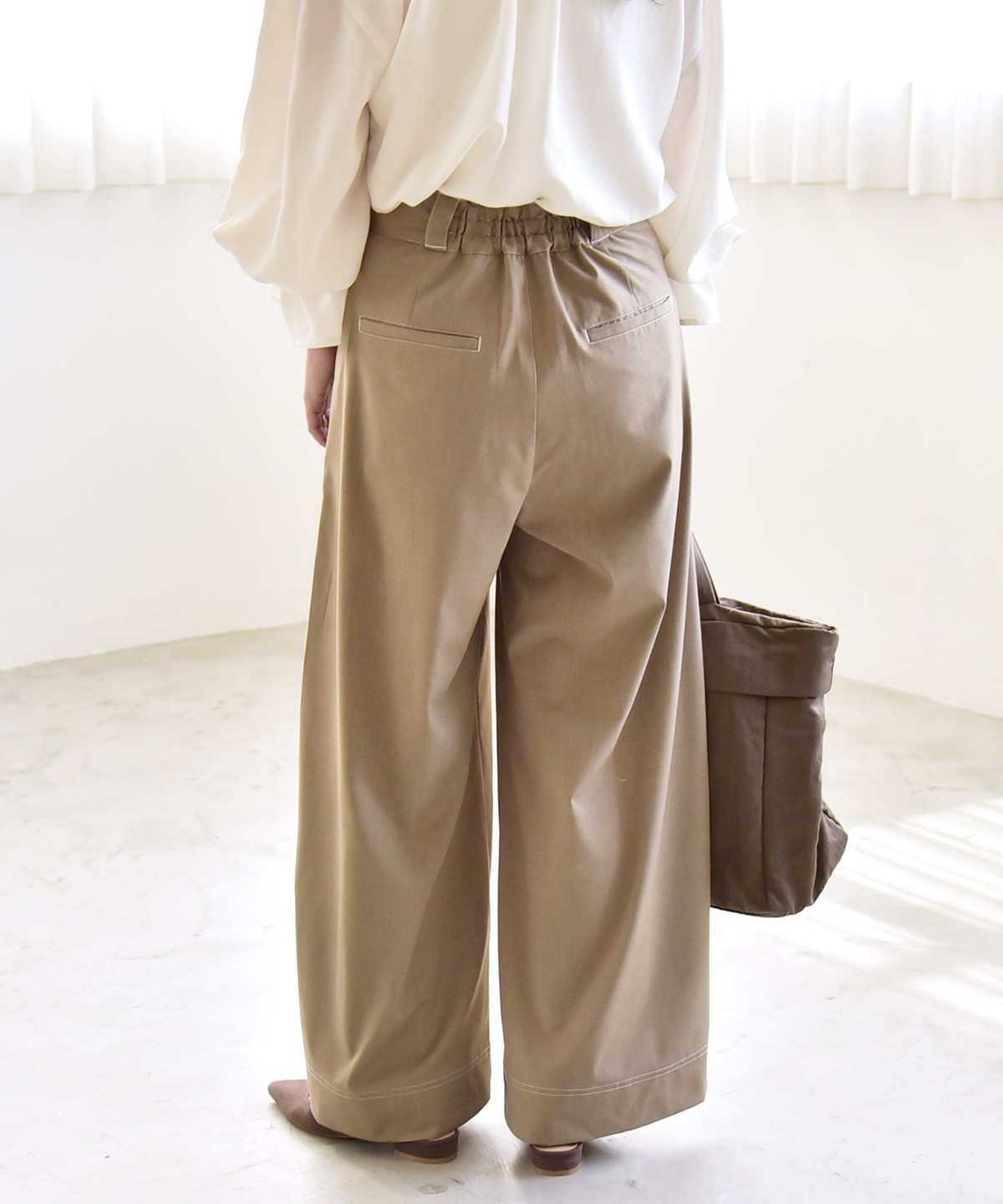 太めのベルト部分とフロントに施した深めの2タックで、腰周りや太ももにゆとりを持たせながらすっきりとした縦ラインを演出し、スタイルアップ効果も◎