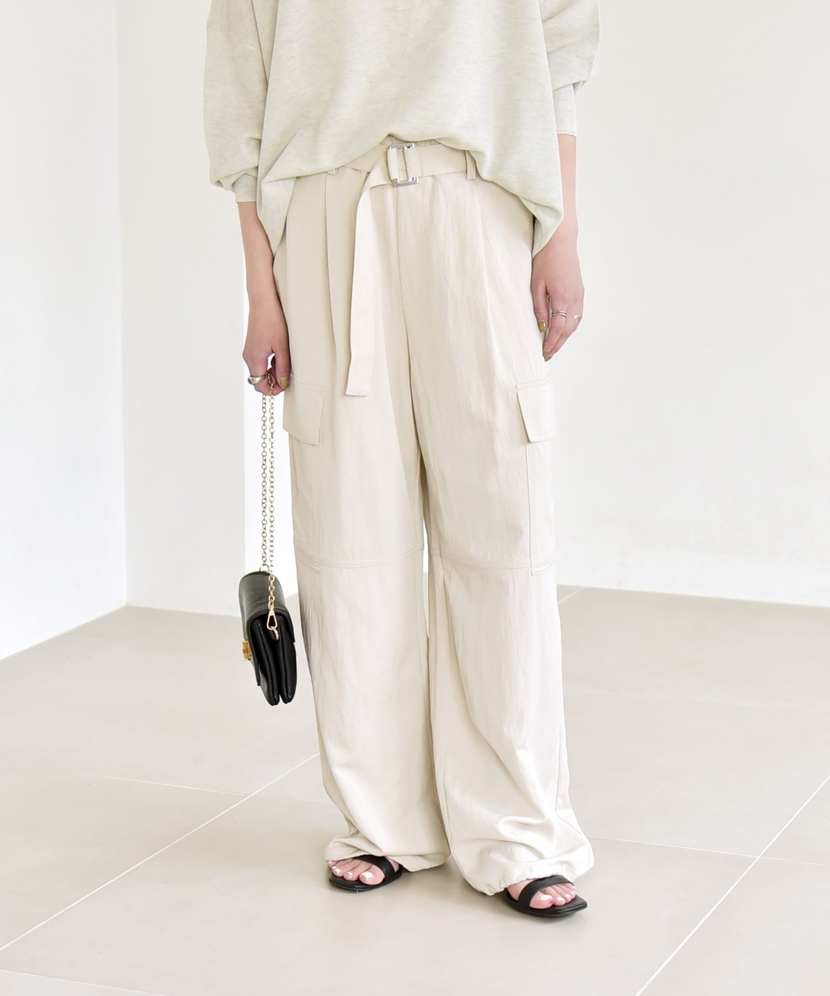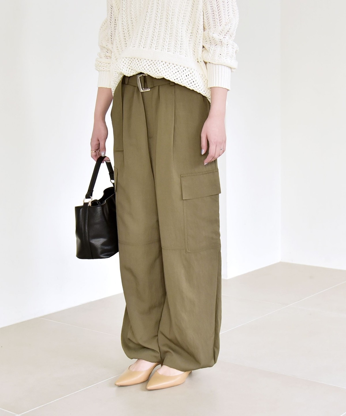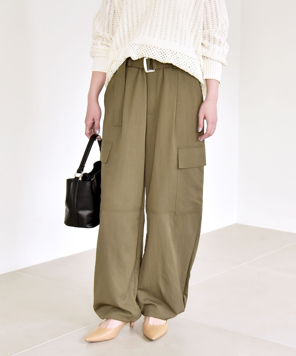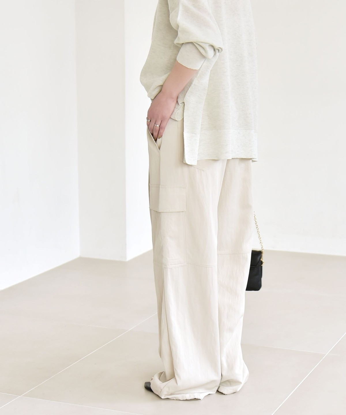 ソフトで女性らしさのある風合いの生地に、サイドポケットなどカジュアル要素をプラスしたカーゴパンツ。
