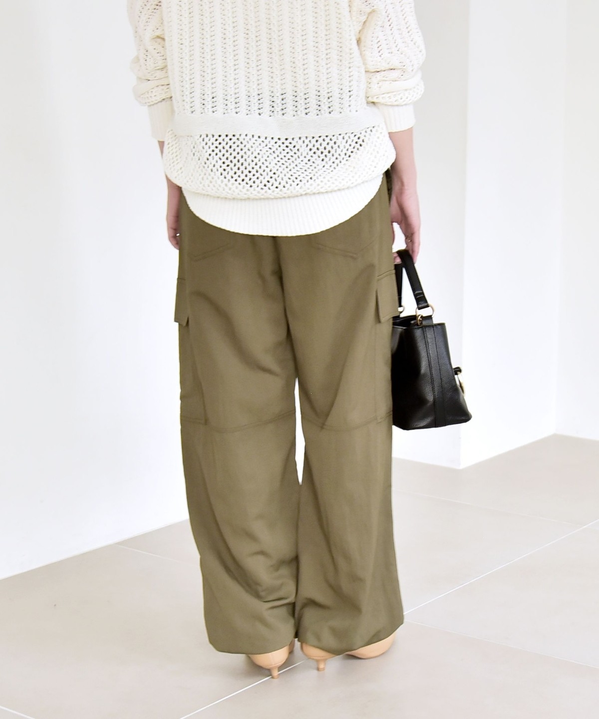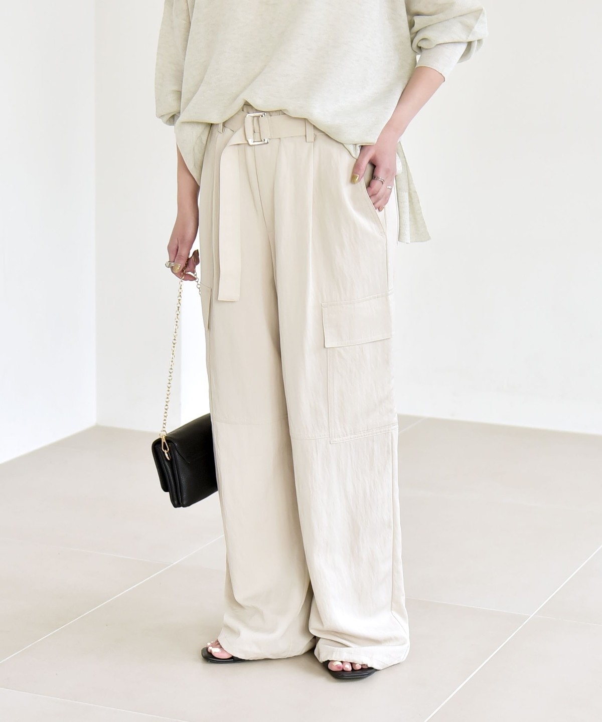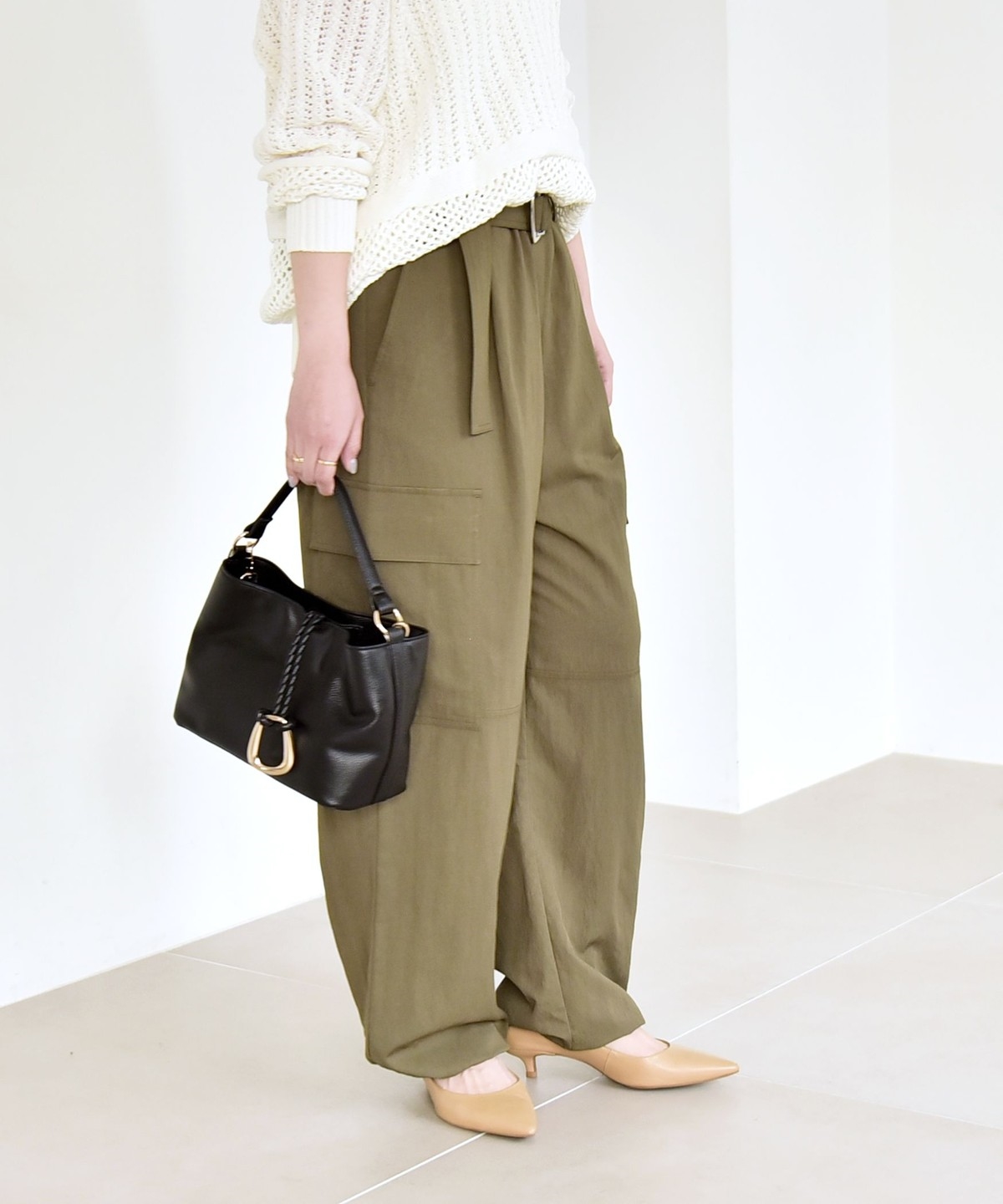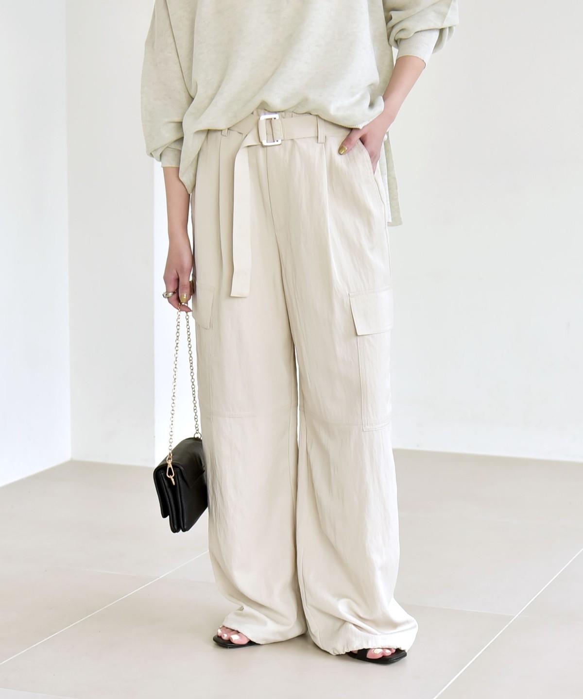 ソフトで女性らしさのある風合いの生地に、サイドポケットなどカジュアル要素をプラスしたカーゴパンツ。