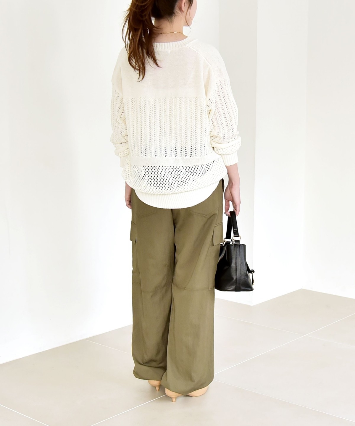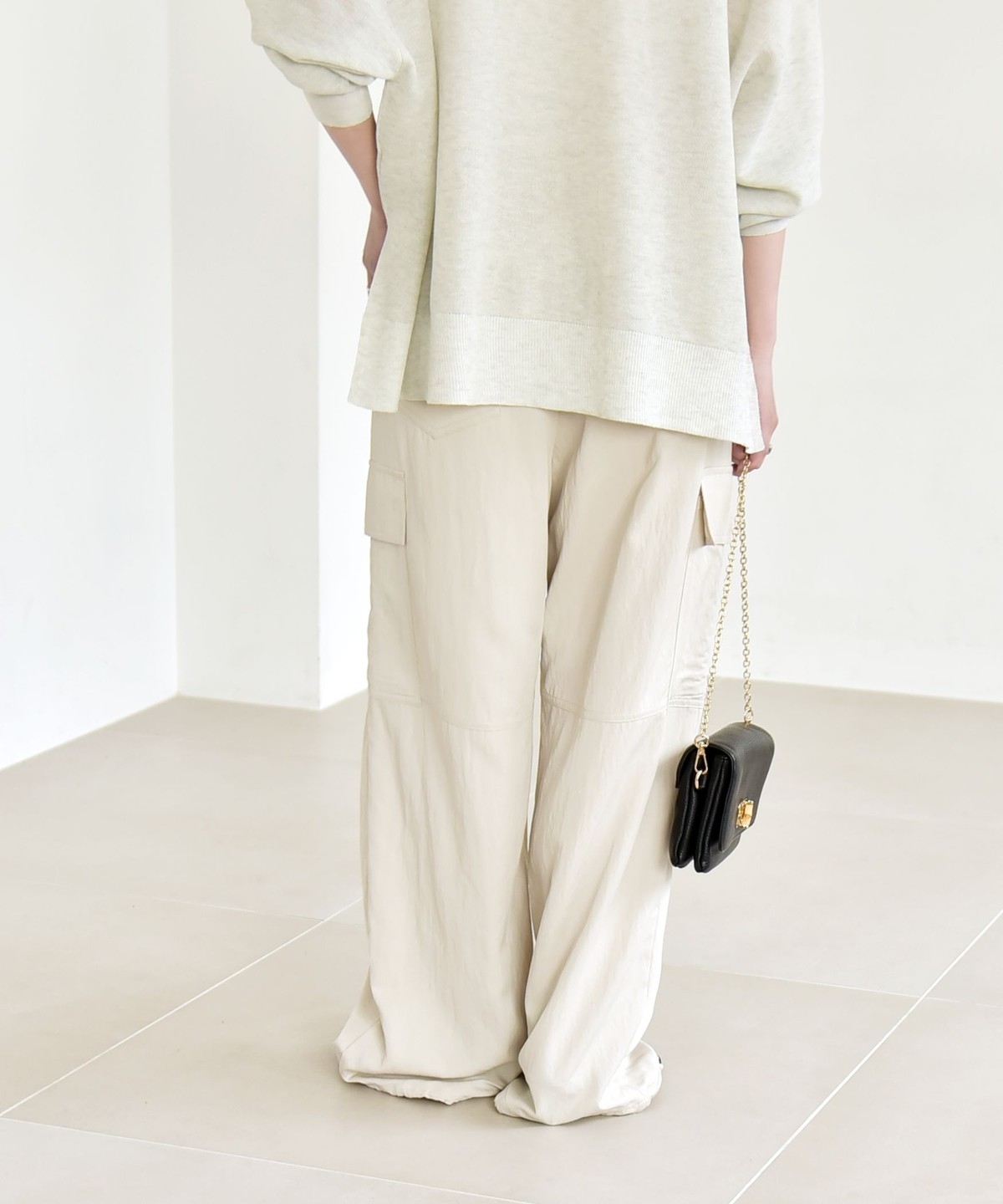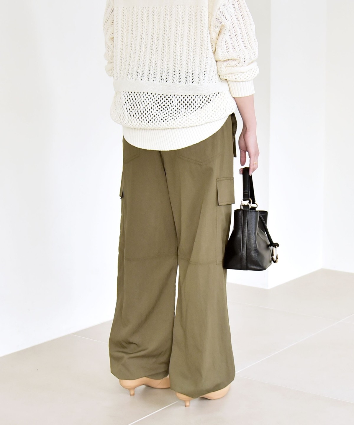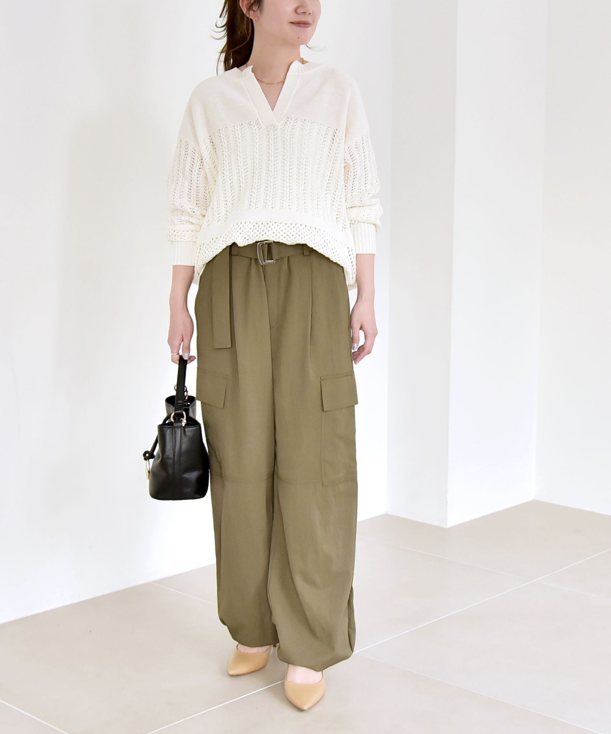 ソフトで女性らしさのある風合いの生地に、サイドポケットなどカジュアル要素をプラスしたカーゴパンツ。