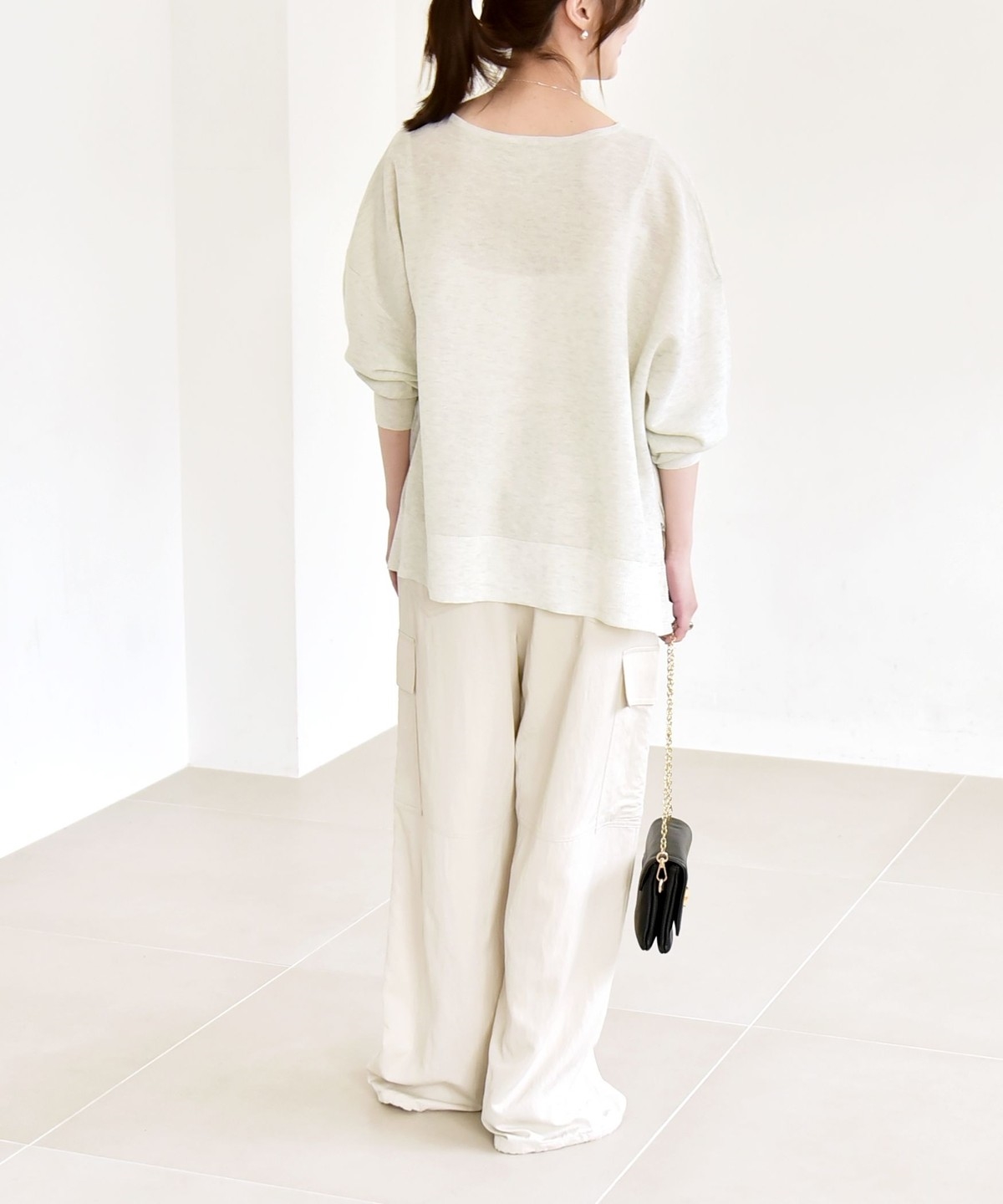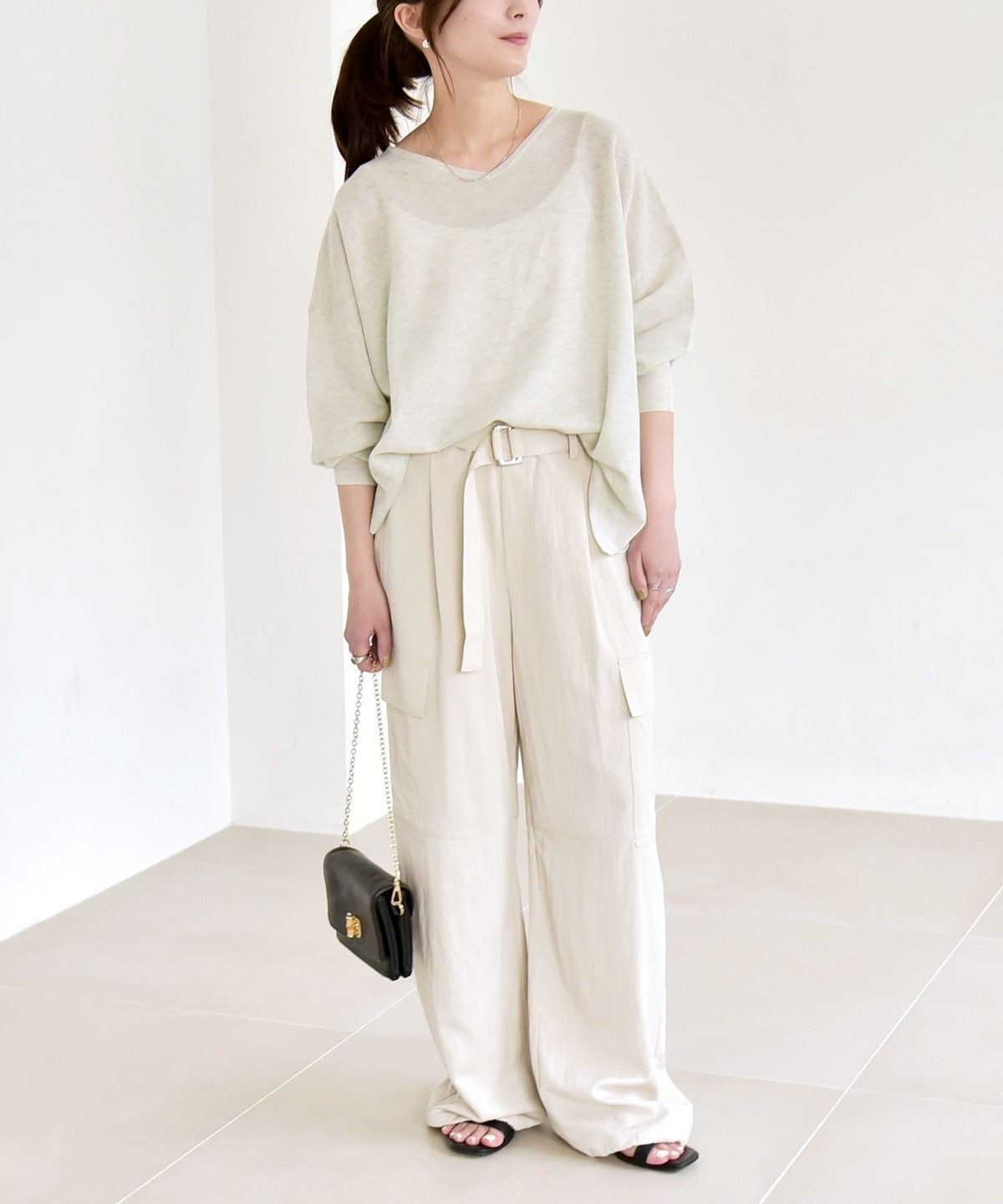 カジュアルなワイドストレートシルエットながらも、すとんと落ちる素材できちんと感があり、幅広いシーンで活躍。