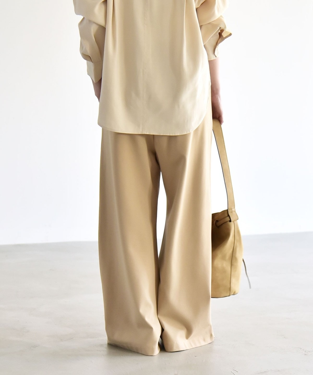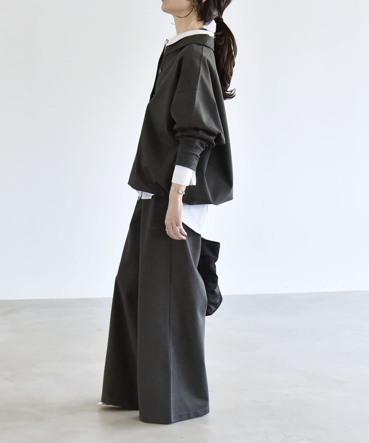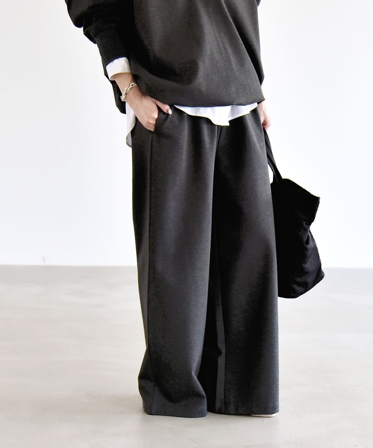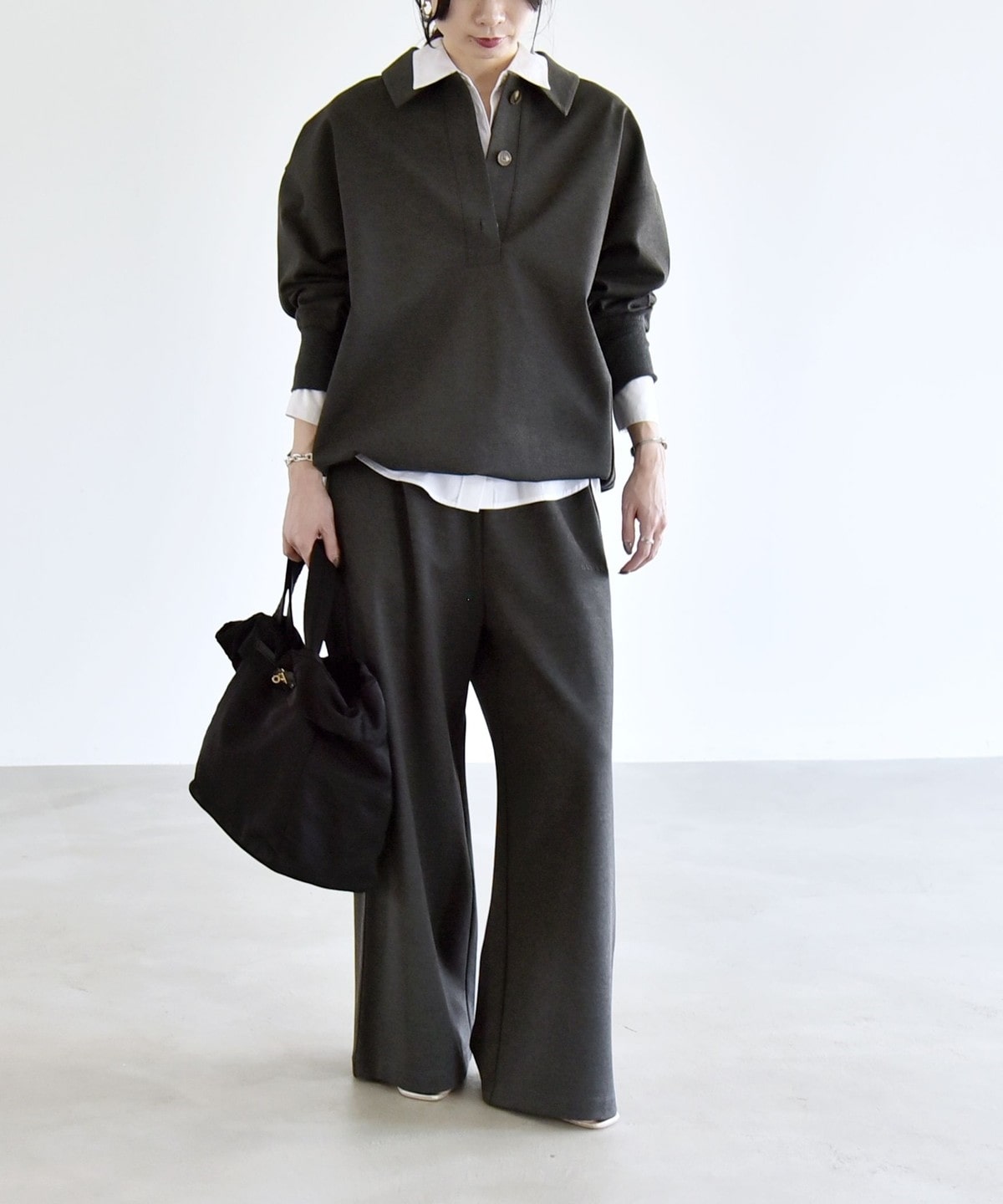 同素材のプルオーバーとセットアップで着こなすと、統一感のある洗練された印象に。