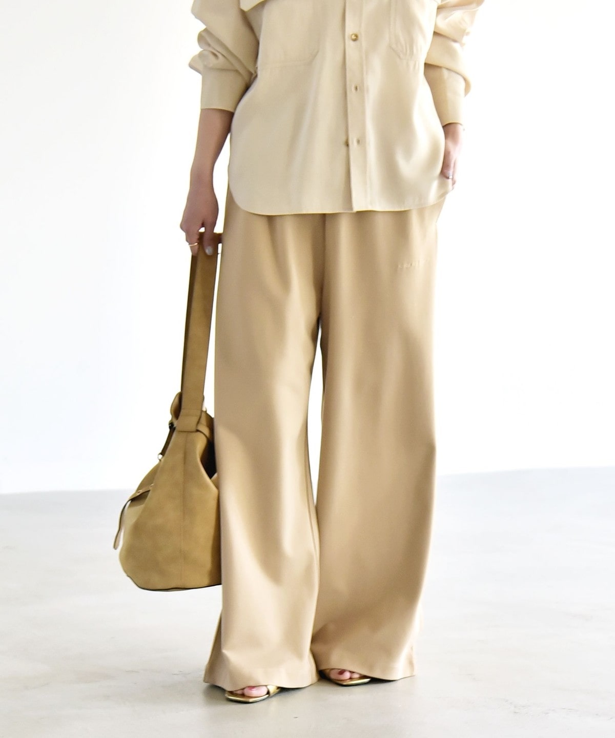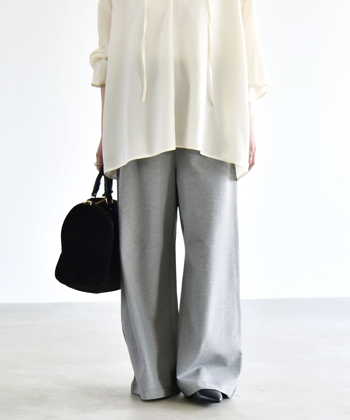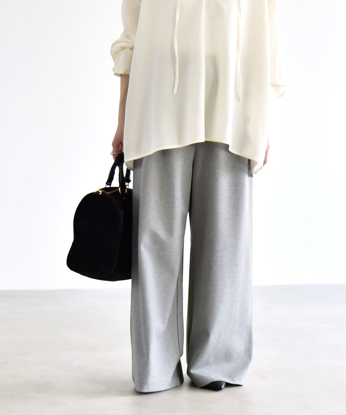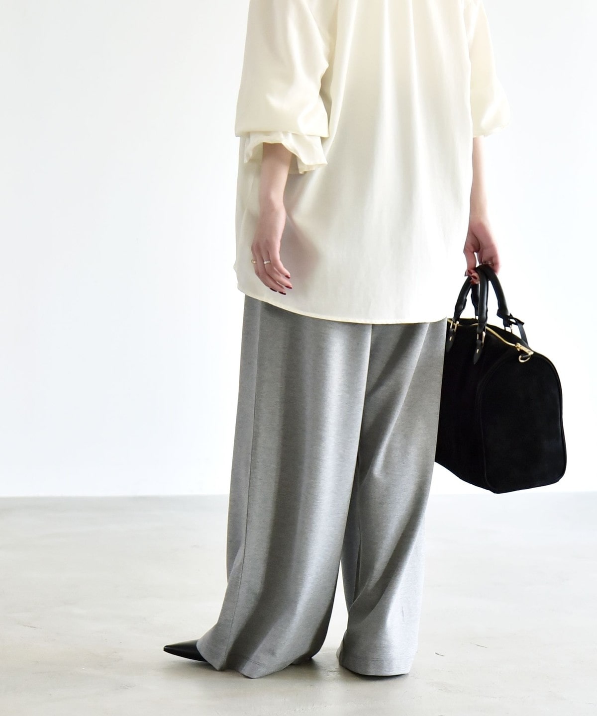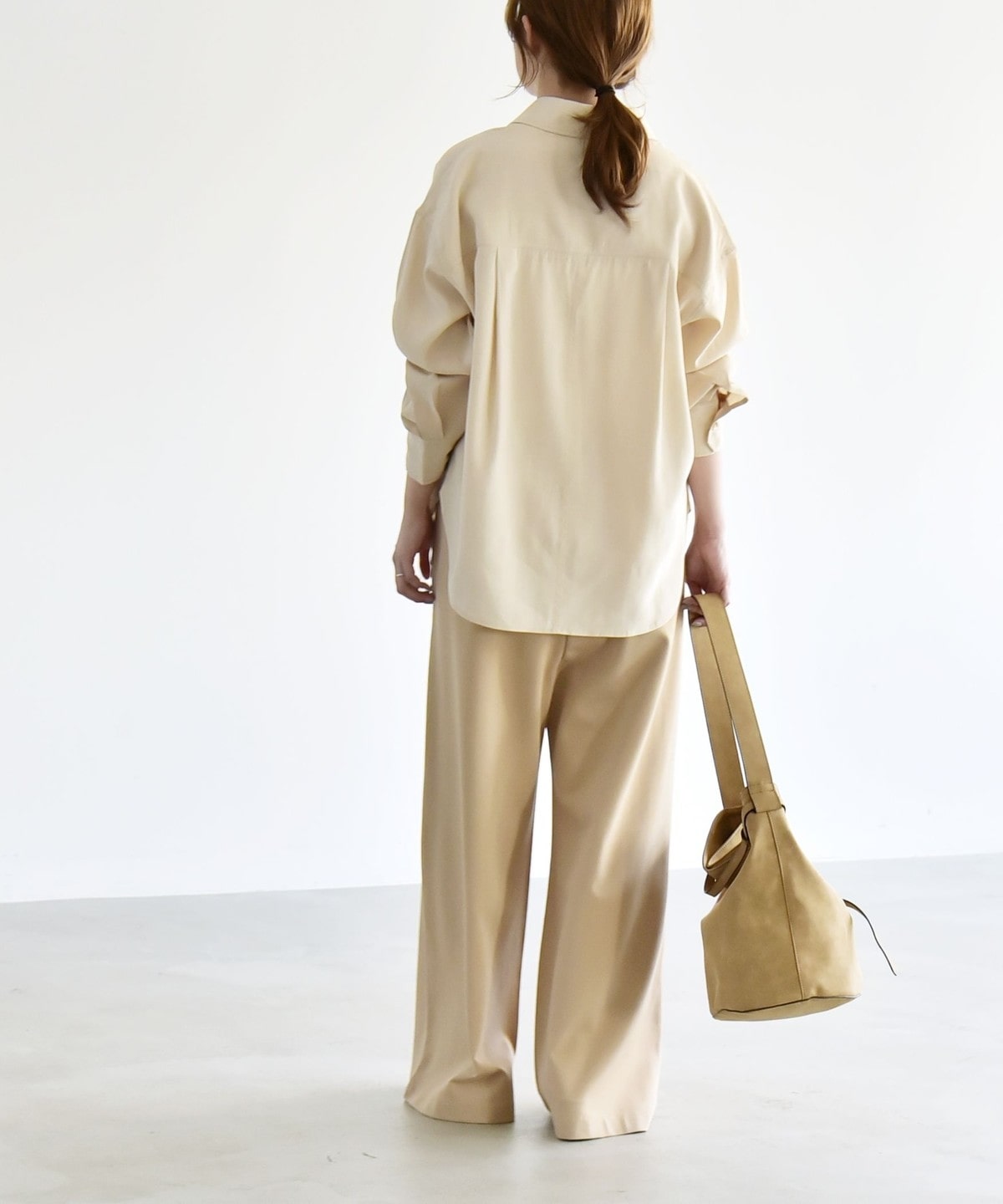 同素材のプルオーバーとセットアップで着こなすと、統一感のある洗練された印象に。