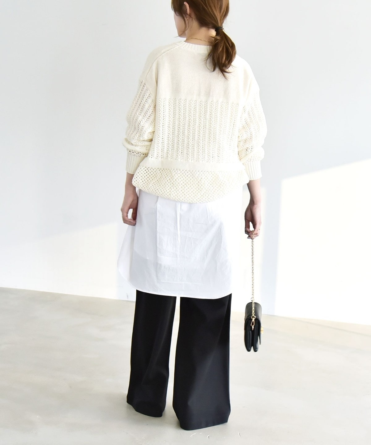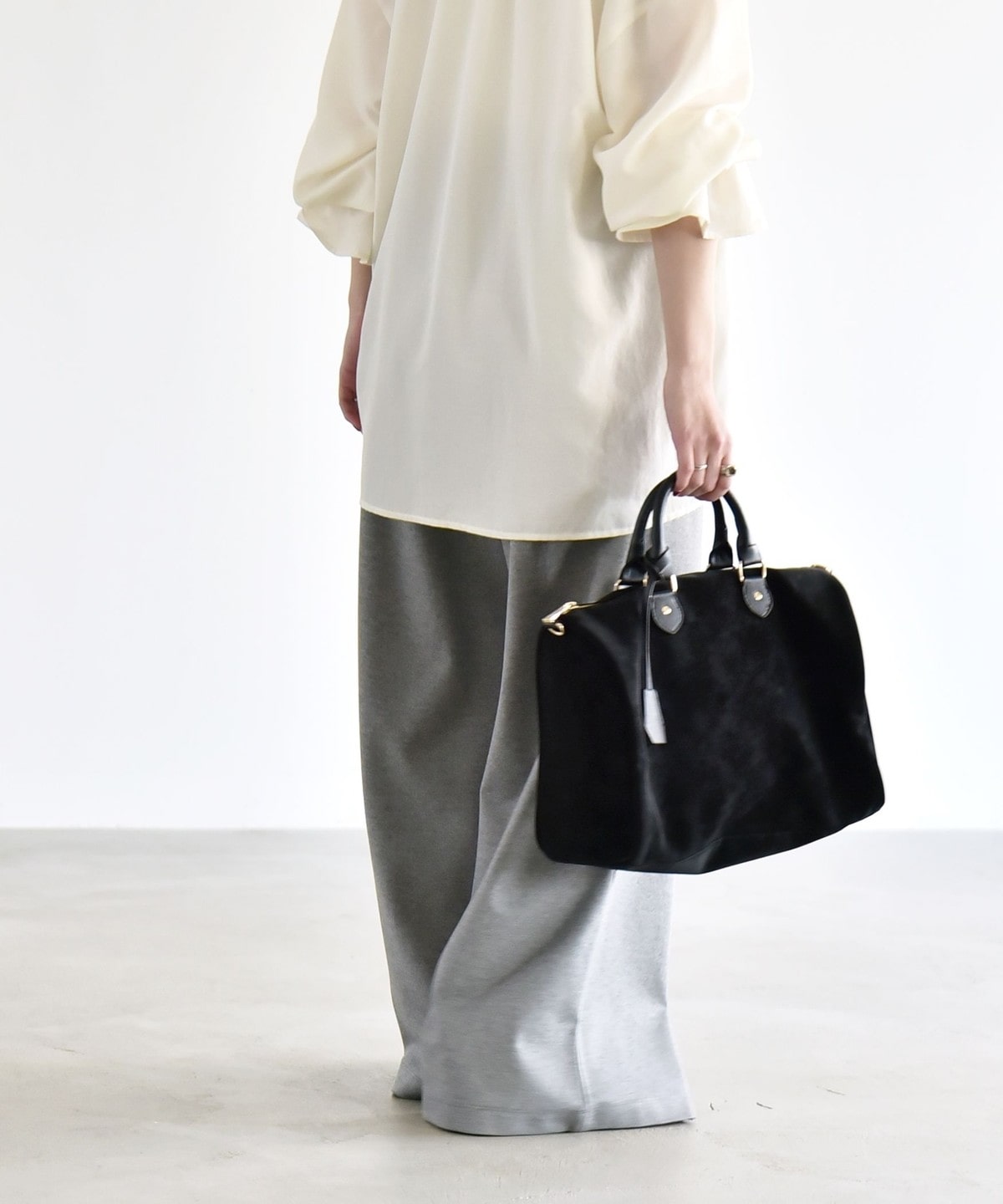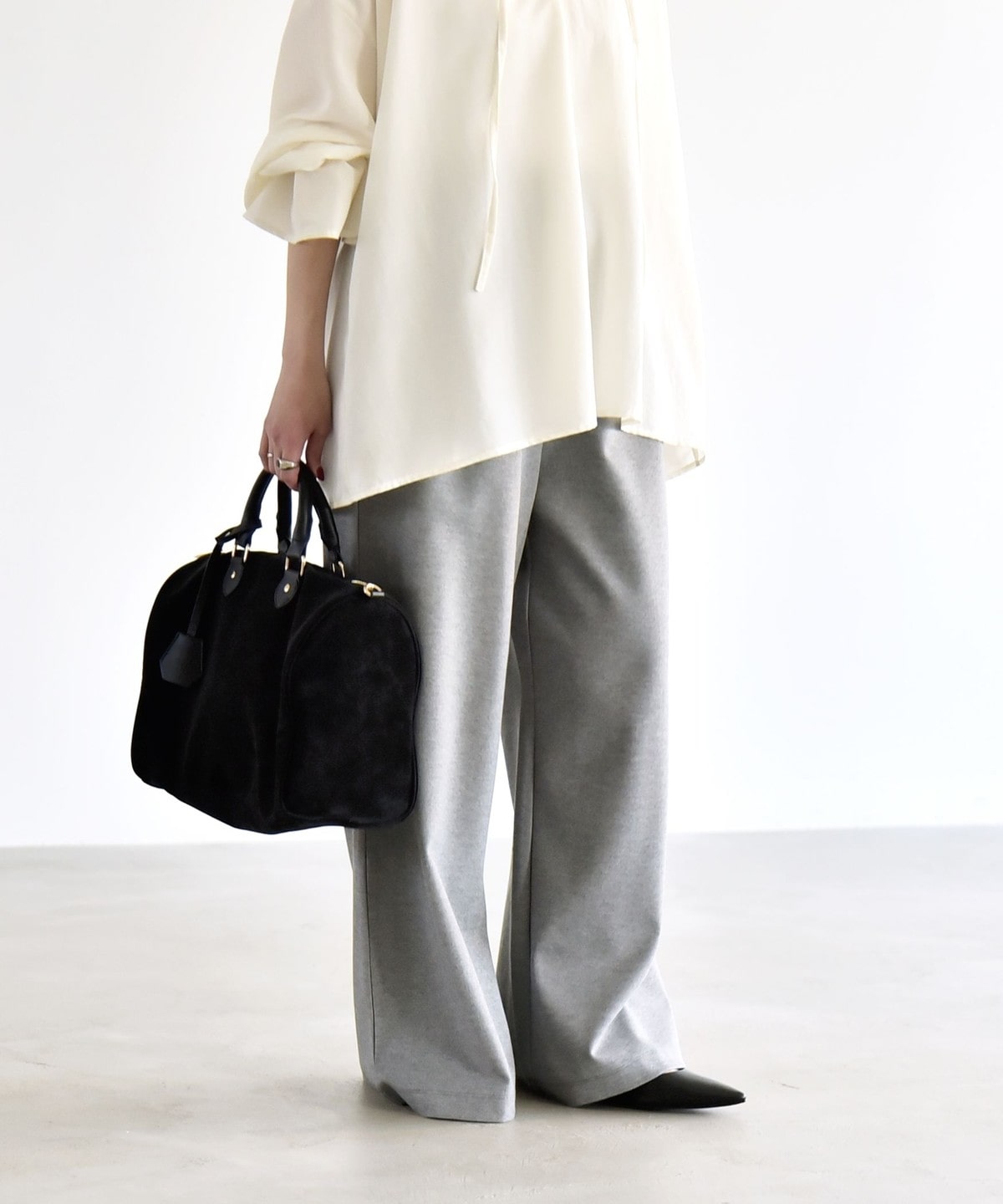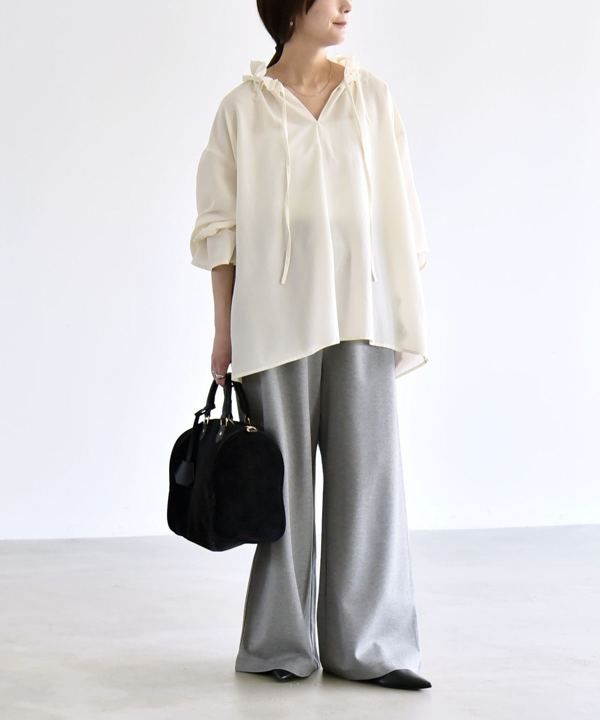 同素材のプルオーバーとセットアップで着こなすと、統一感のある洗練された印象に。