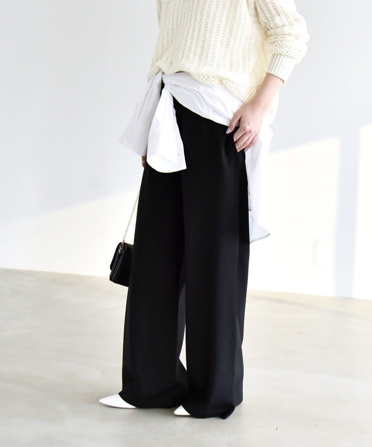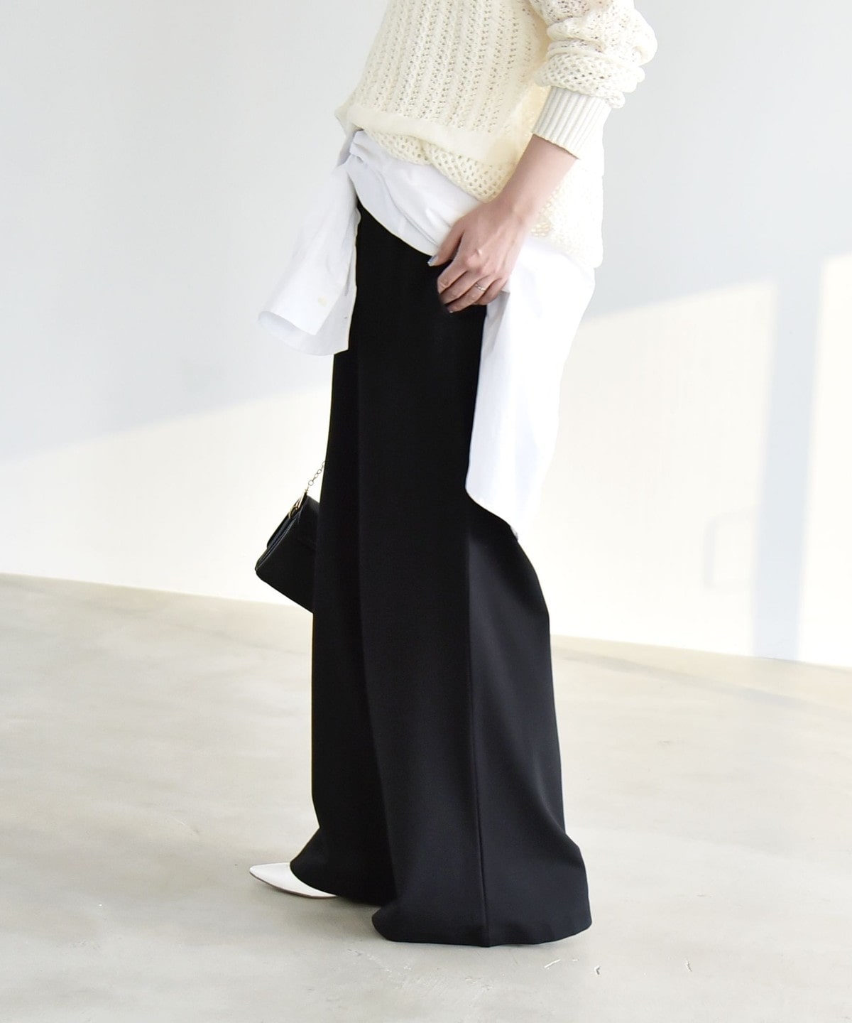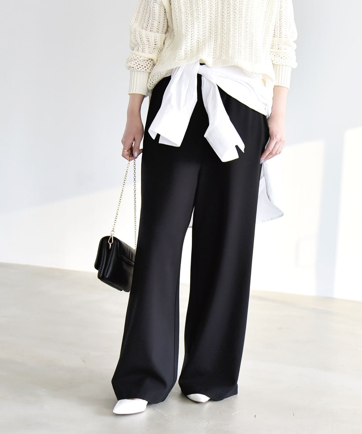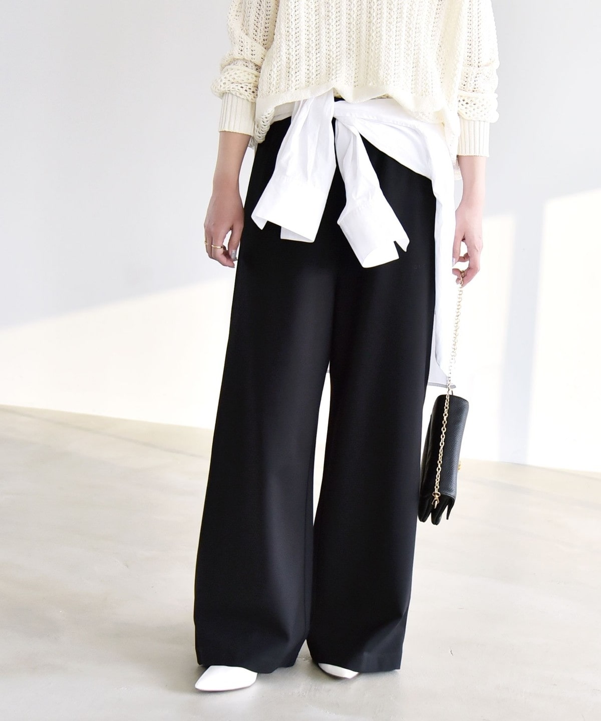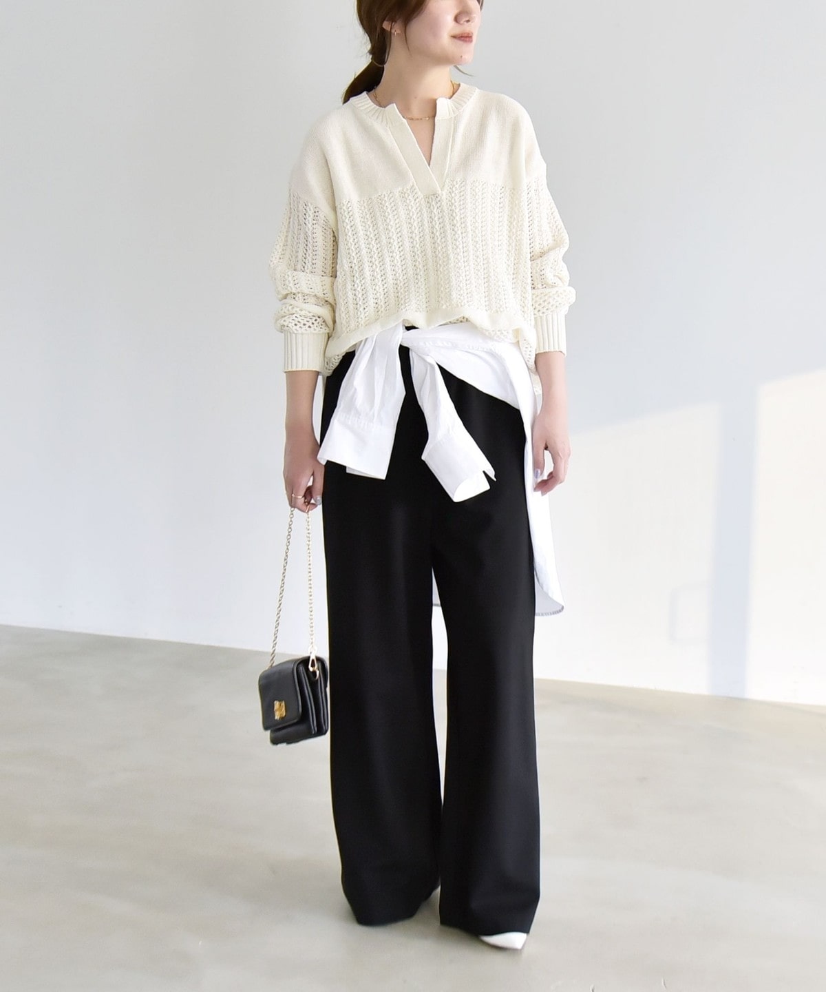 シャツやブラウスと合わせた上品なスタイリングもおすすめです。