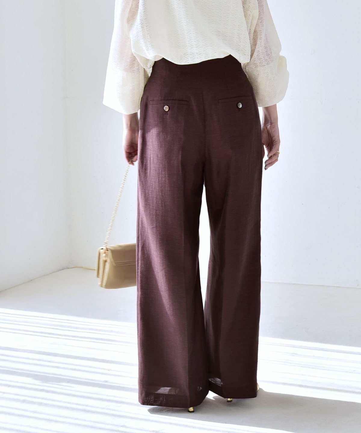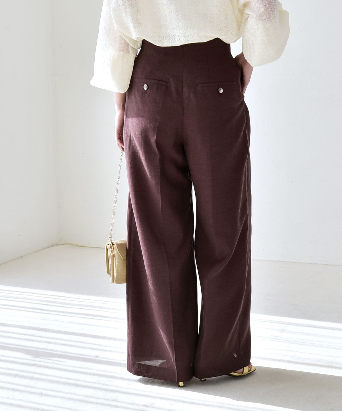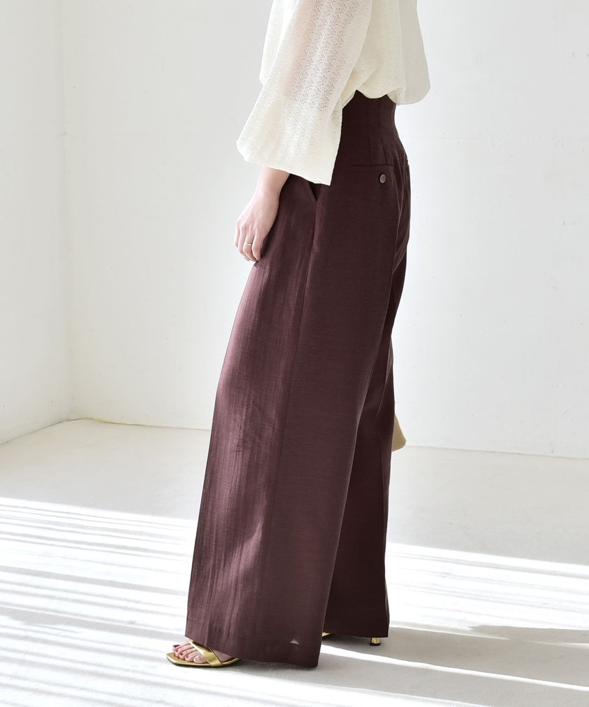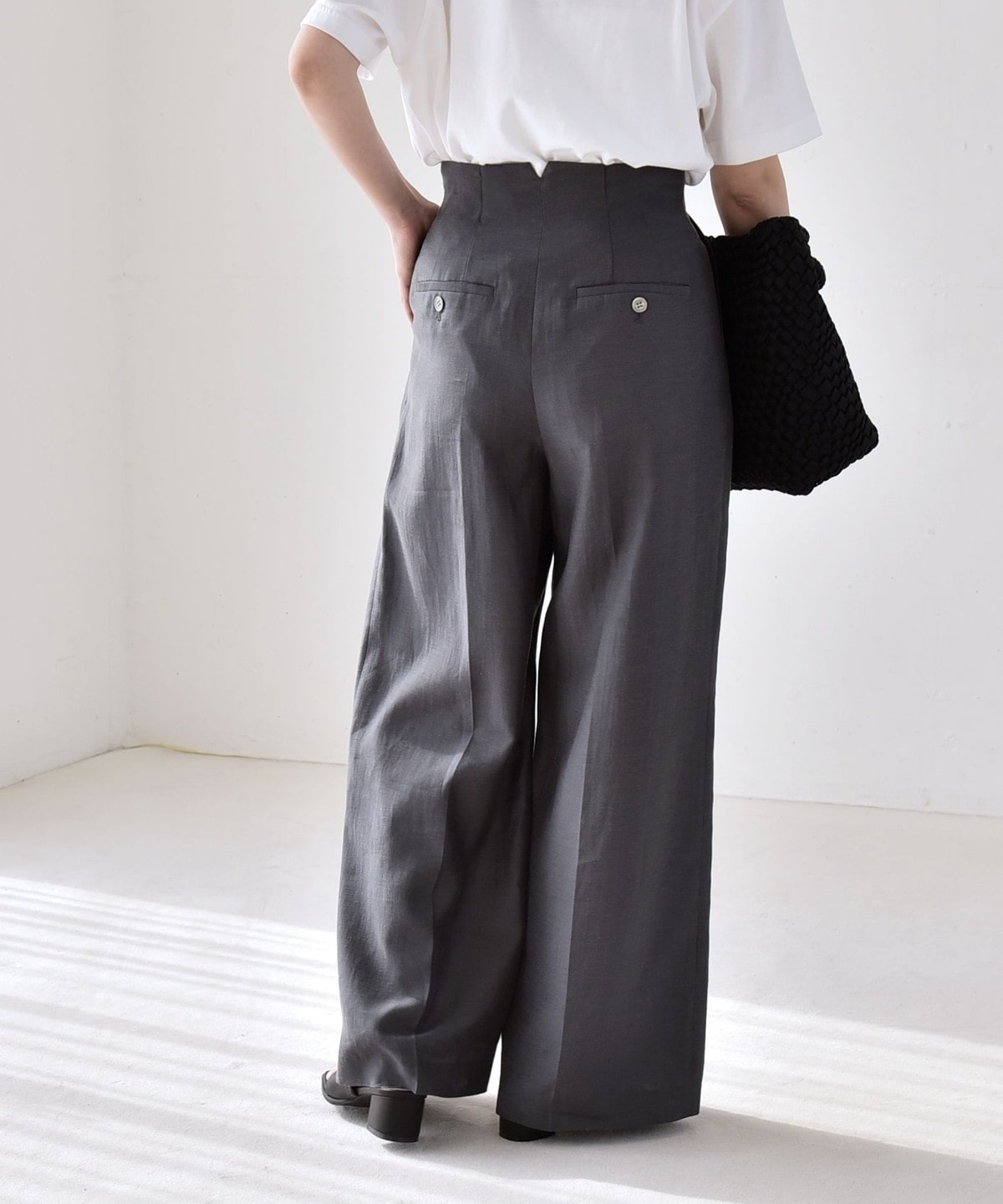 リネン混素材のナチュラルな風合いを活かした、ハイウエストのワイドパンツ。
