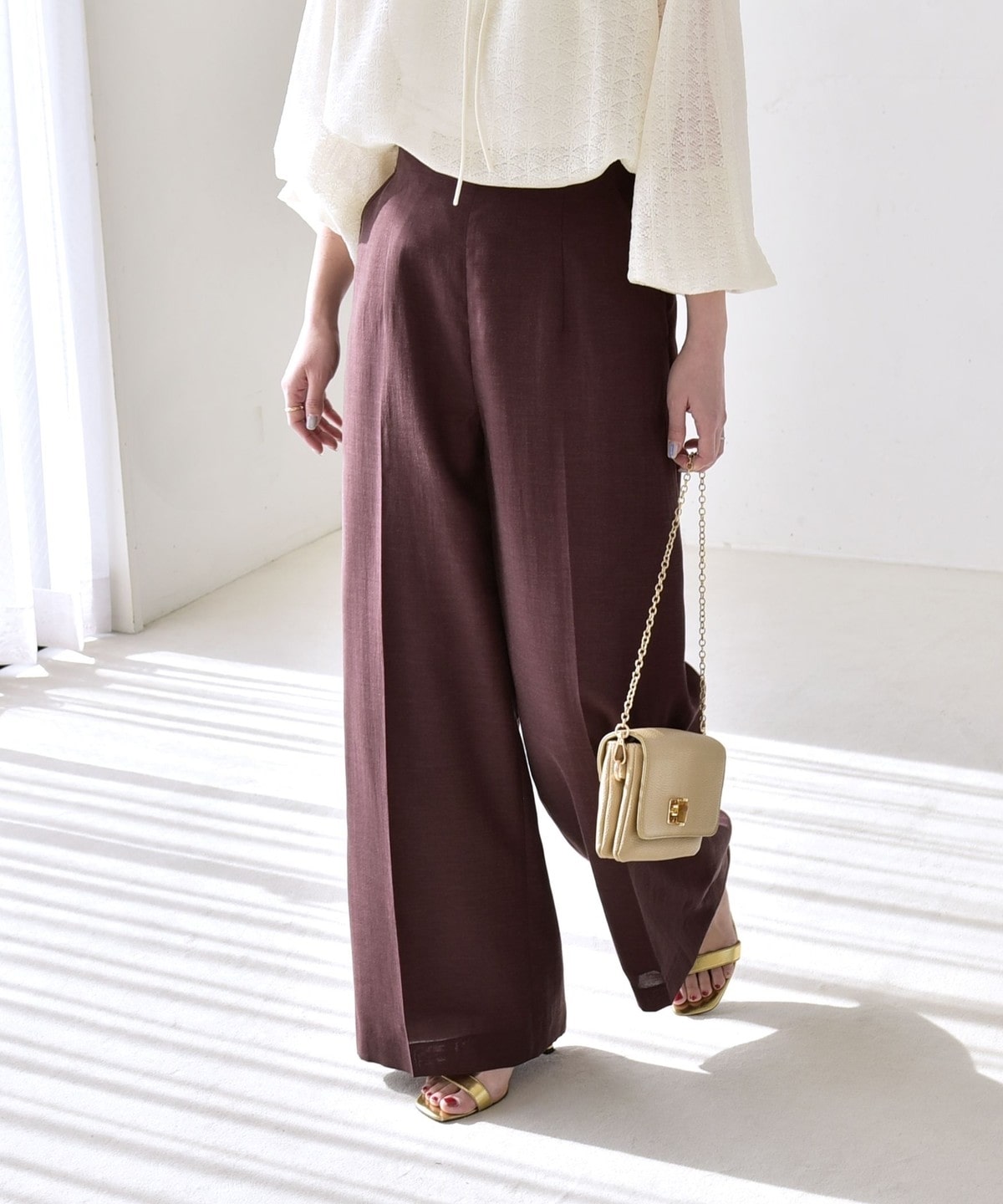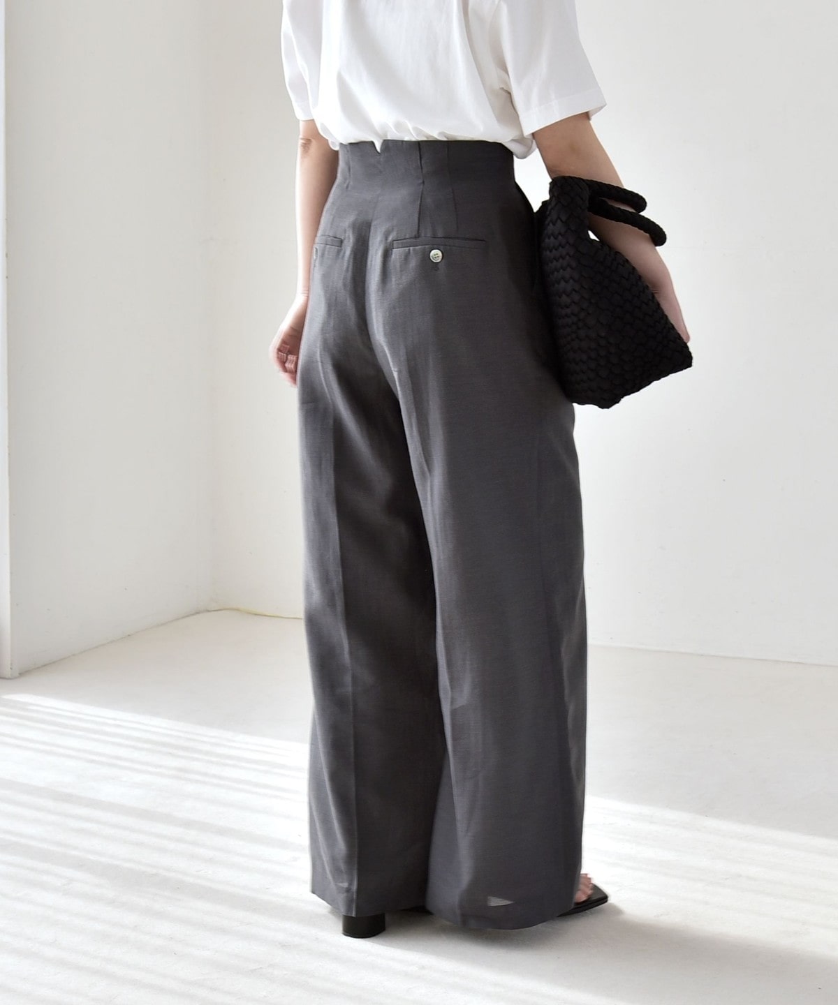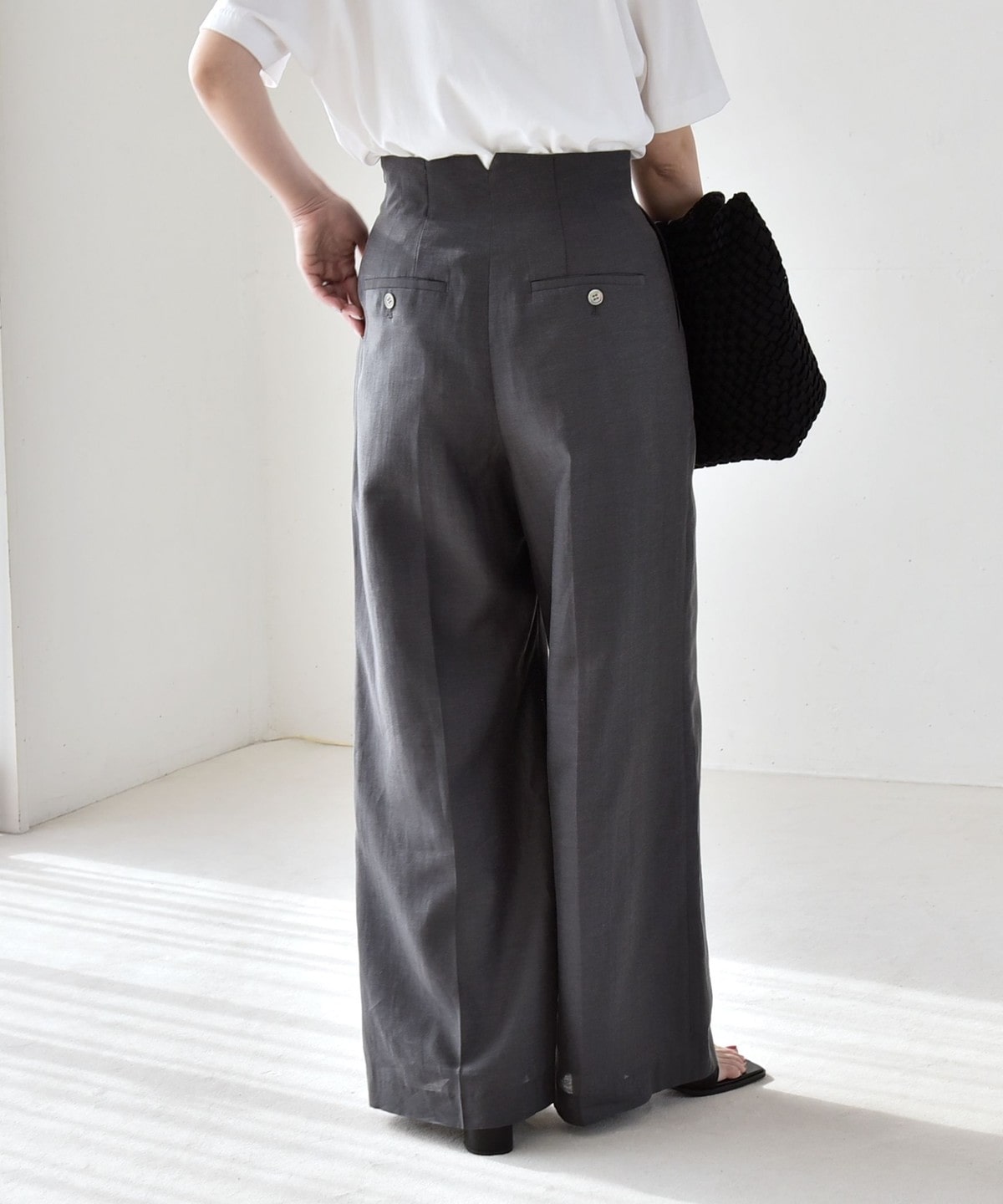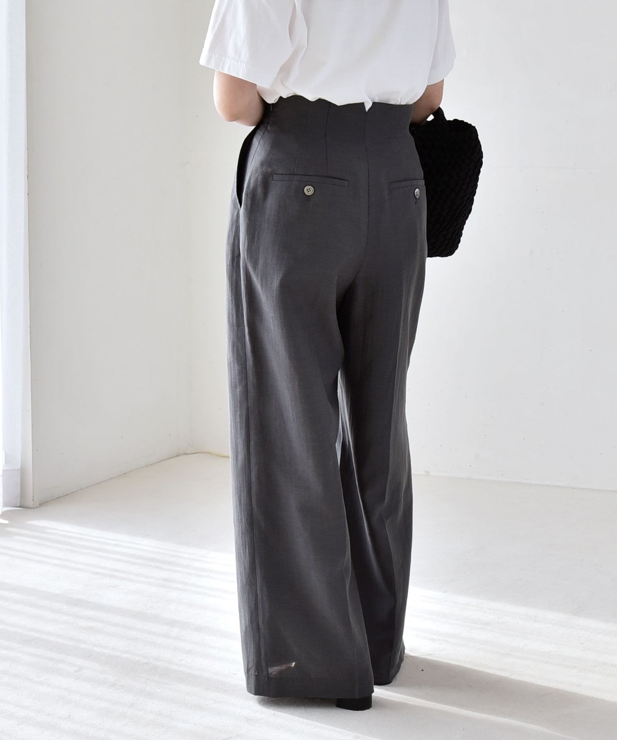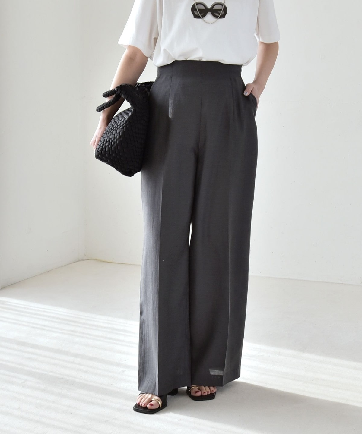 リネン混素材のナチュラルな風合いを活かした、ハイウエストのワイドパンツ。