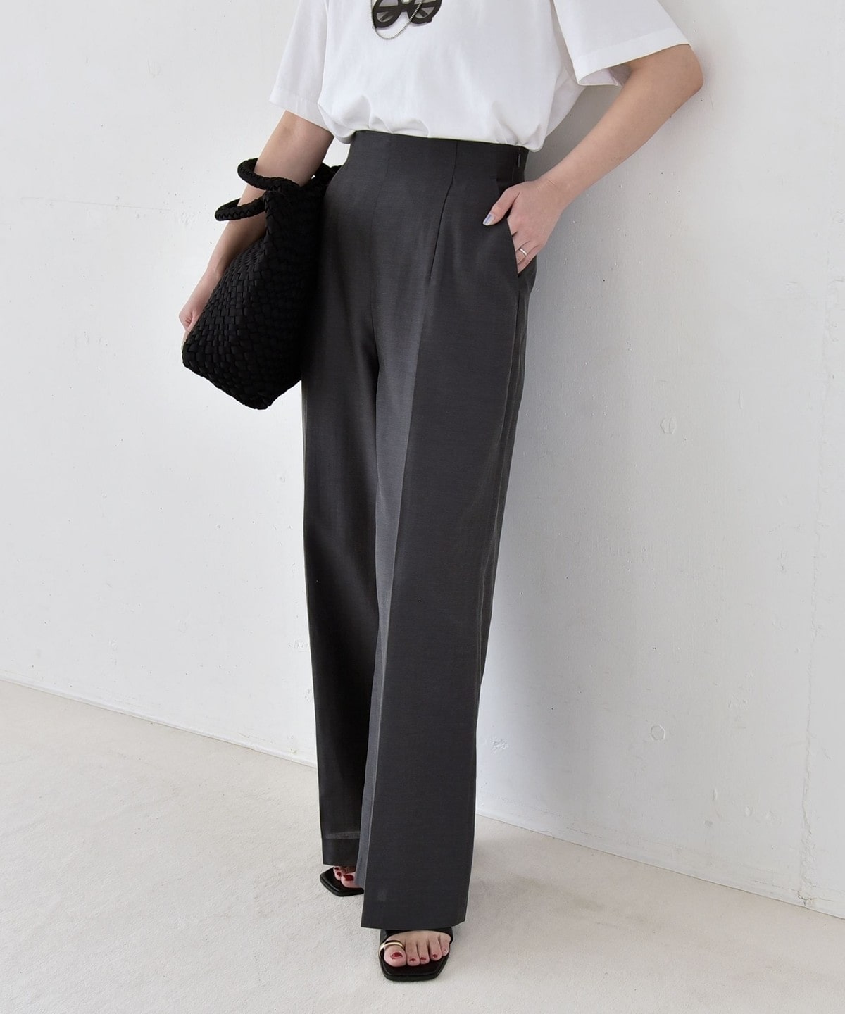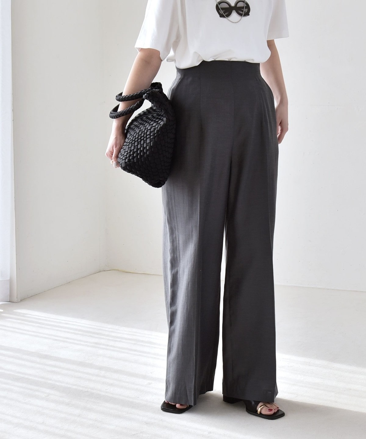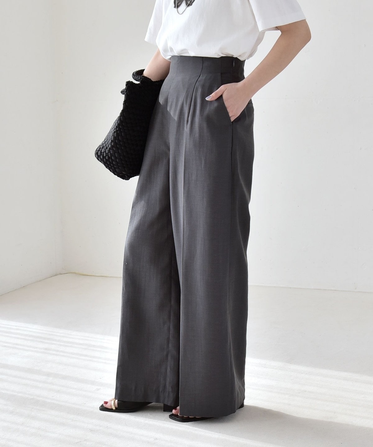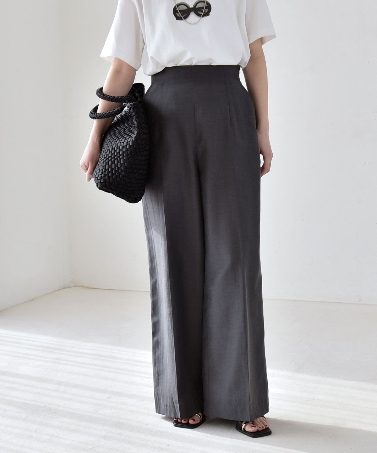 リネン混素材のナチュラルな風合いを活かした、ハイウエストのワイドパンツ。