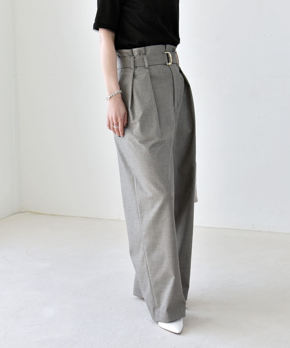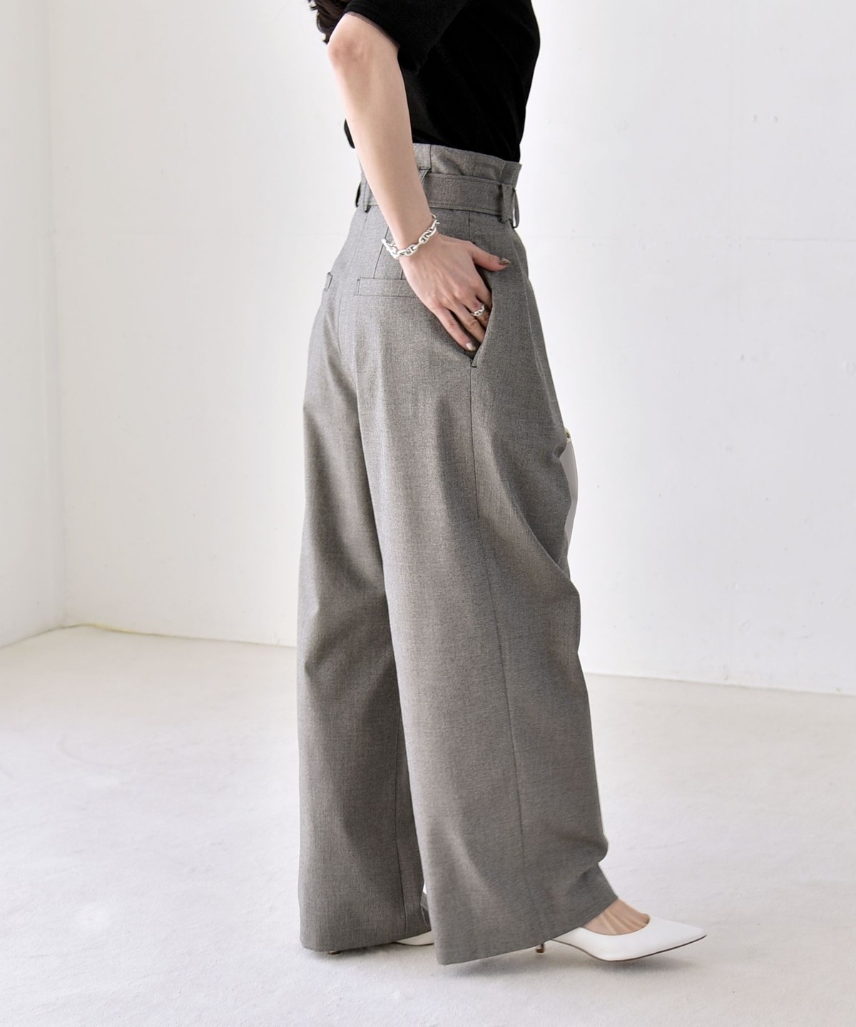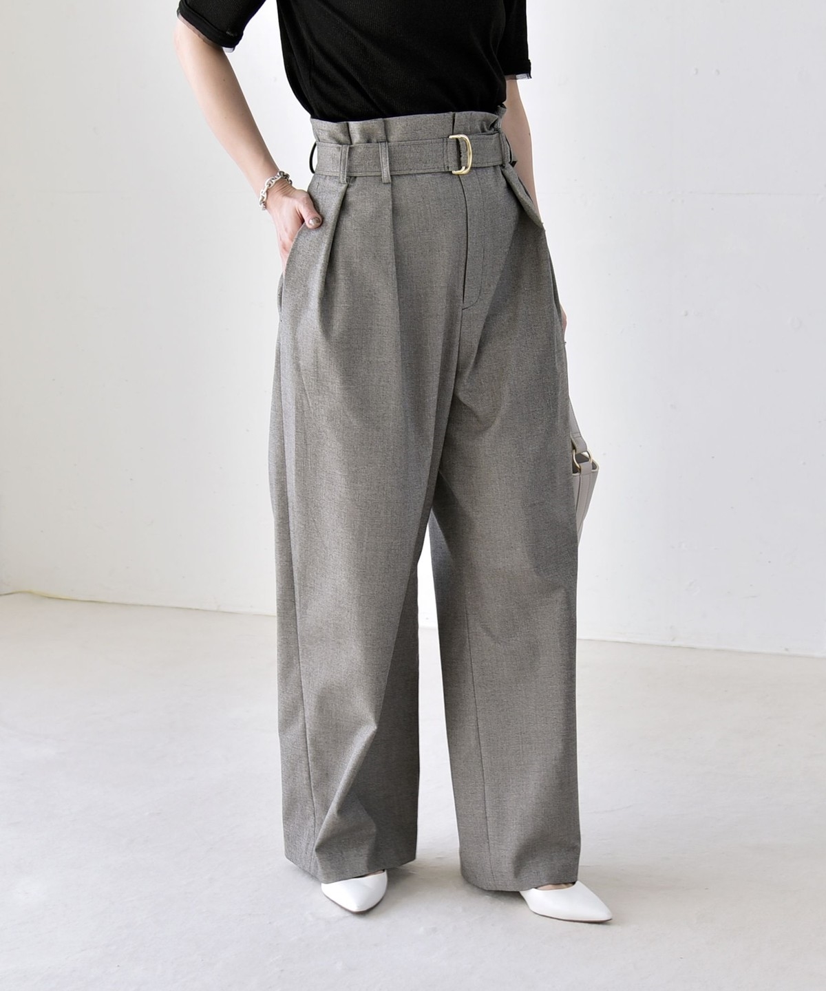《一部追加予約》quaranciel:〈洗濯機可能〉ハンサム ハイウエスト ベルト ワイド パンツ