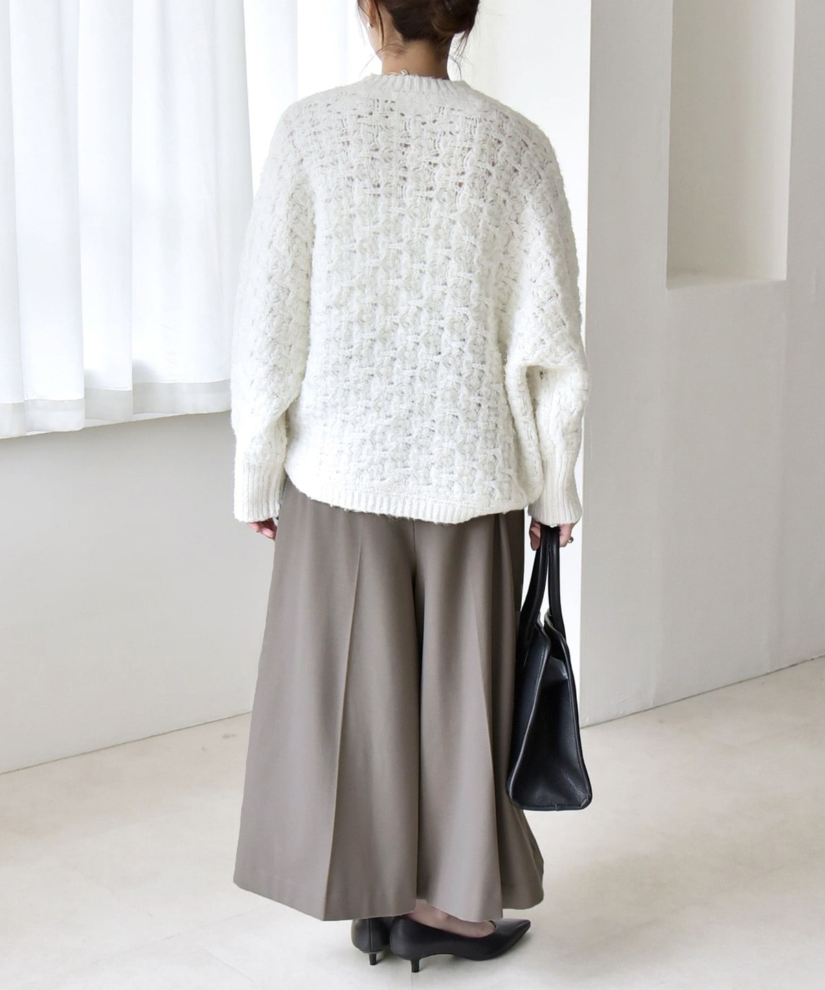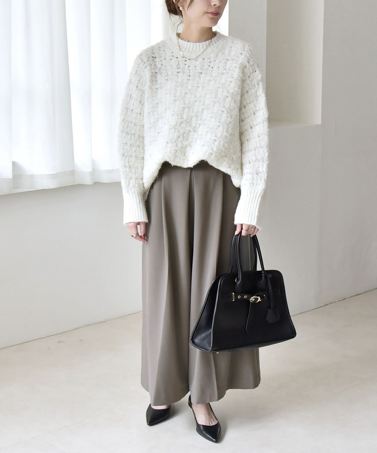 ワイドなシルエットながらも落ち感のあるパンツなので、ハイゲージのニットと合わせた着こなしにもおすすめ。