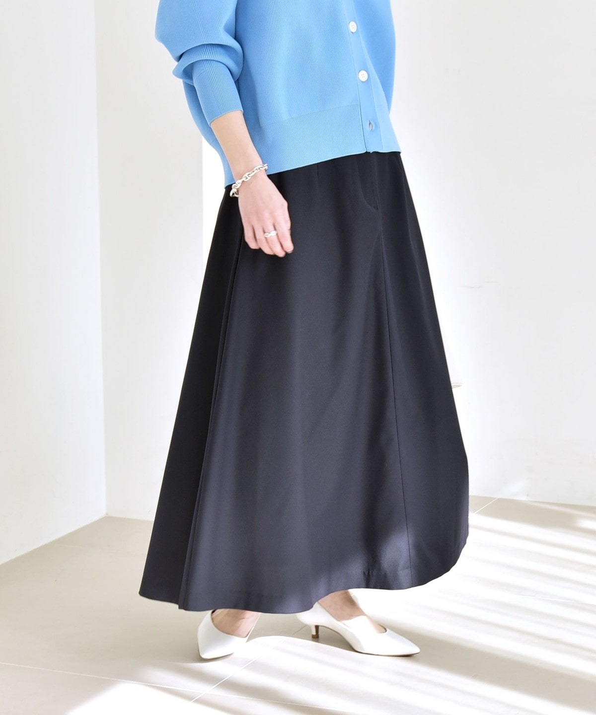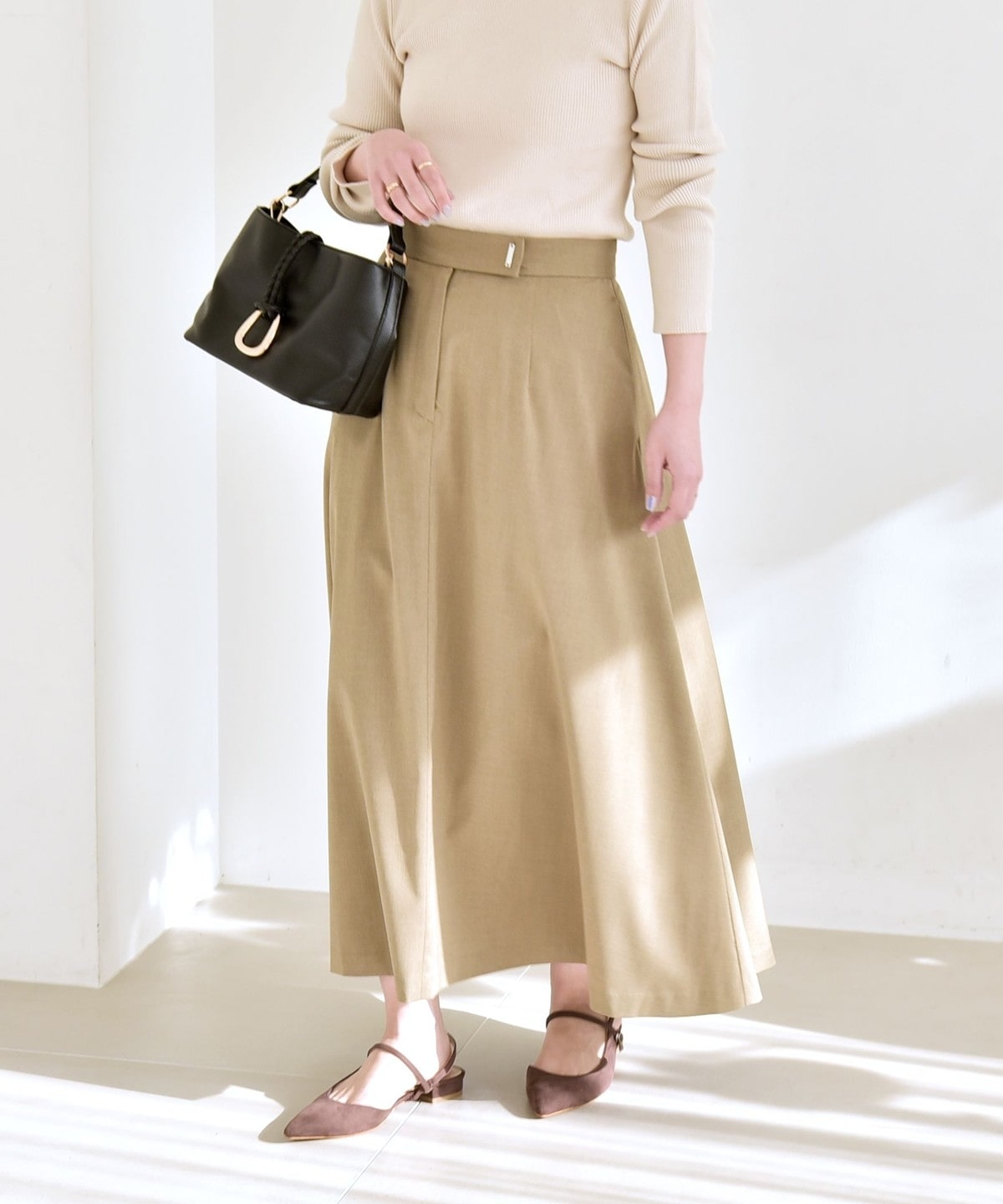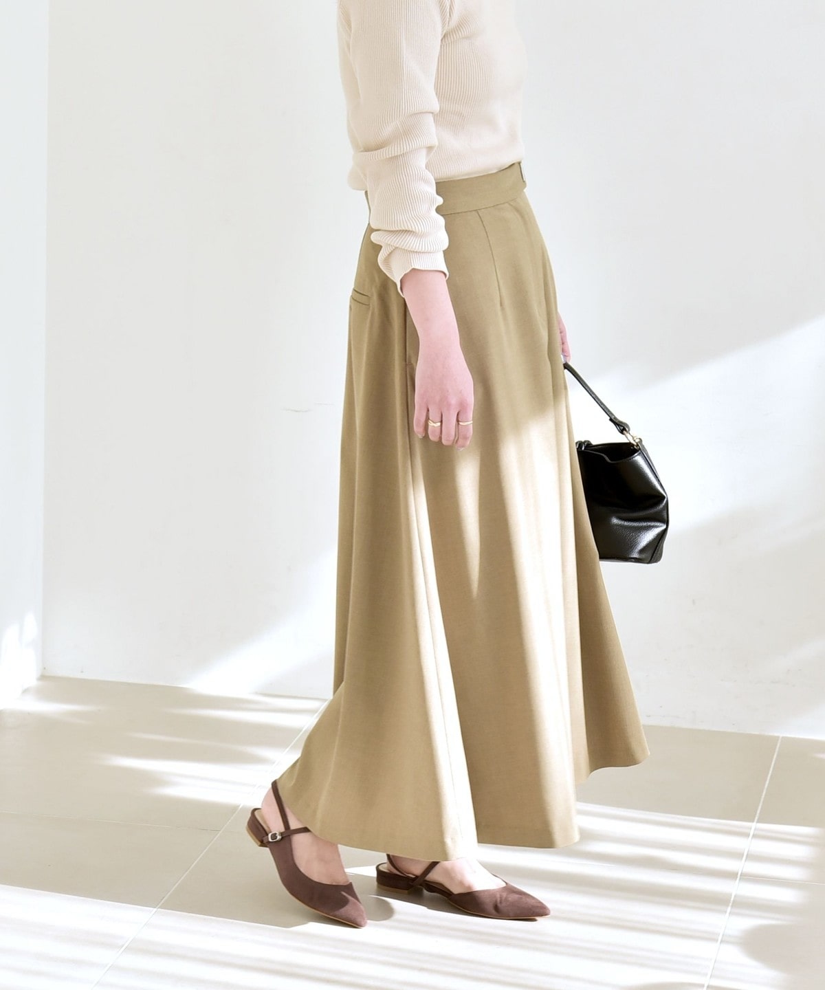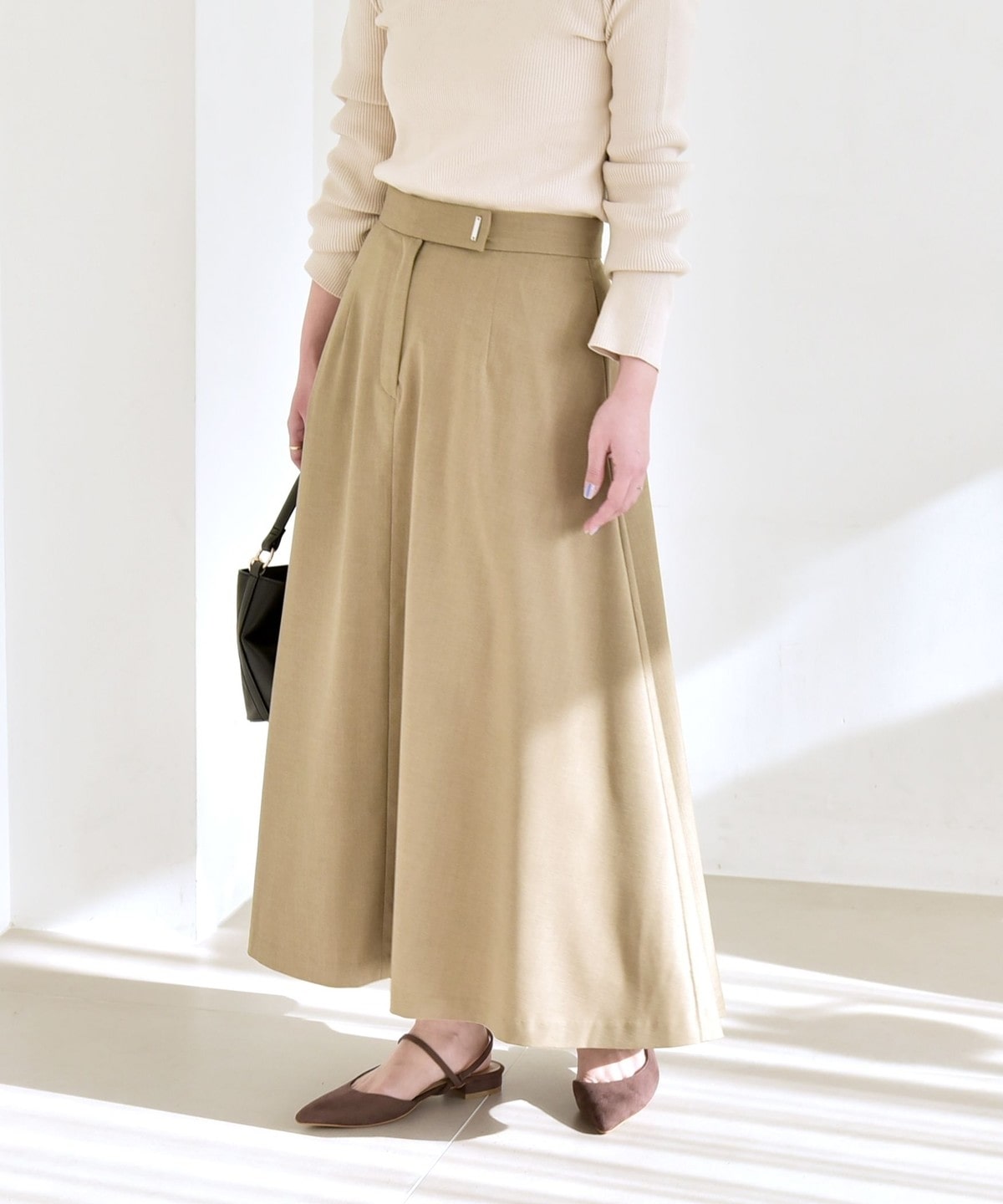 高めのウエスト位置と、裾に向かってエレガントに広がったフレアシルエットでスタイルアップ効果を叶える一着です。