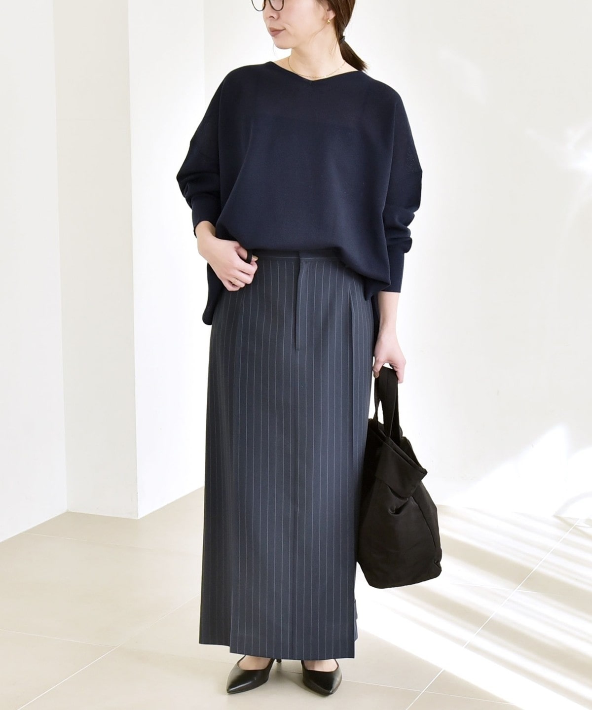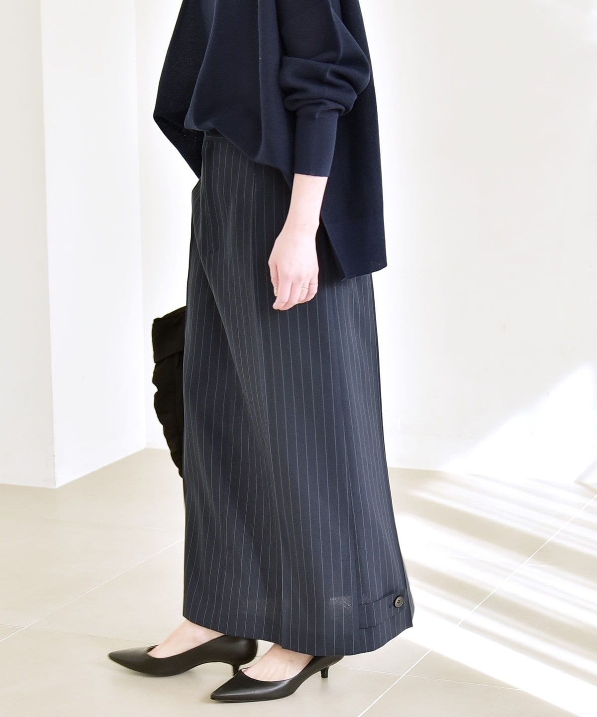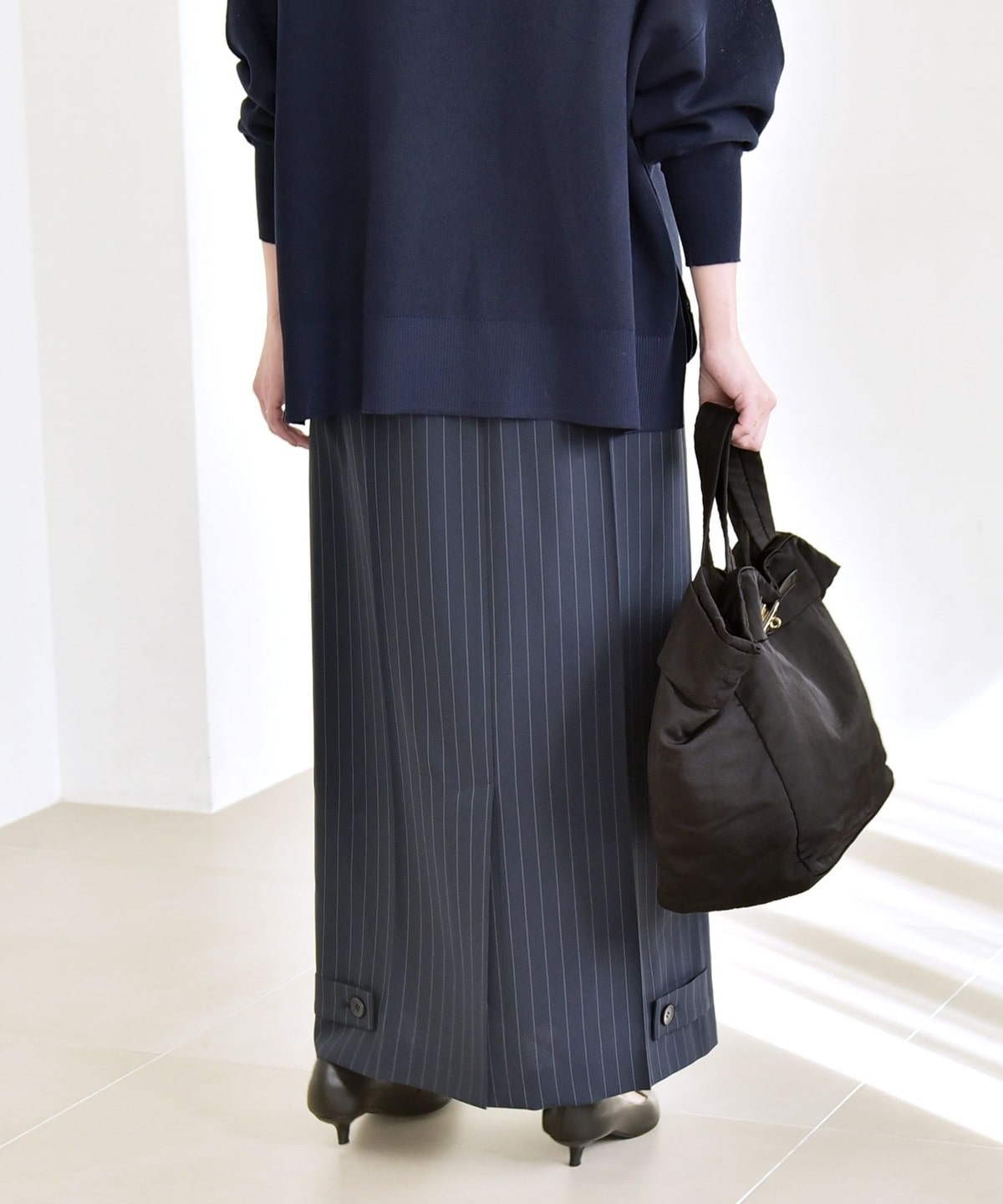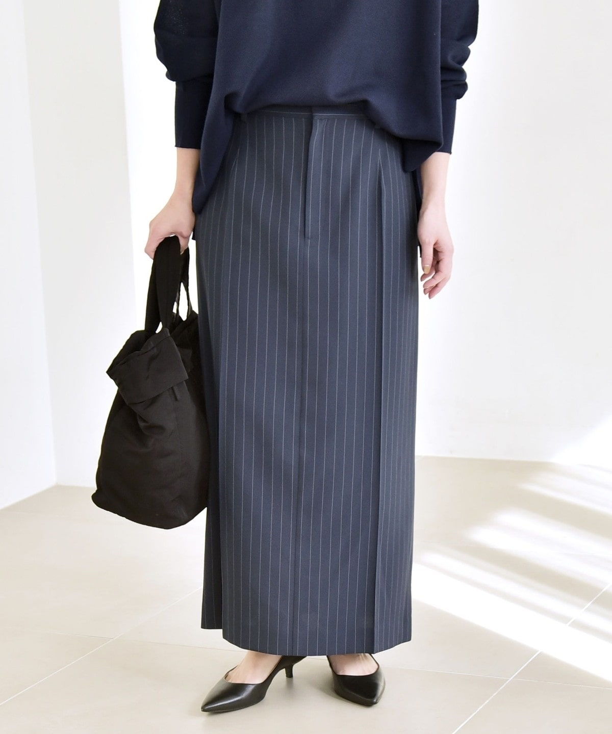 上品なロングスカートに仕上げつつ、ストライプ柄が縦のラインを強調しスタイルアップ効果も叶うアイテムです。