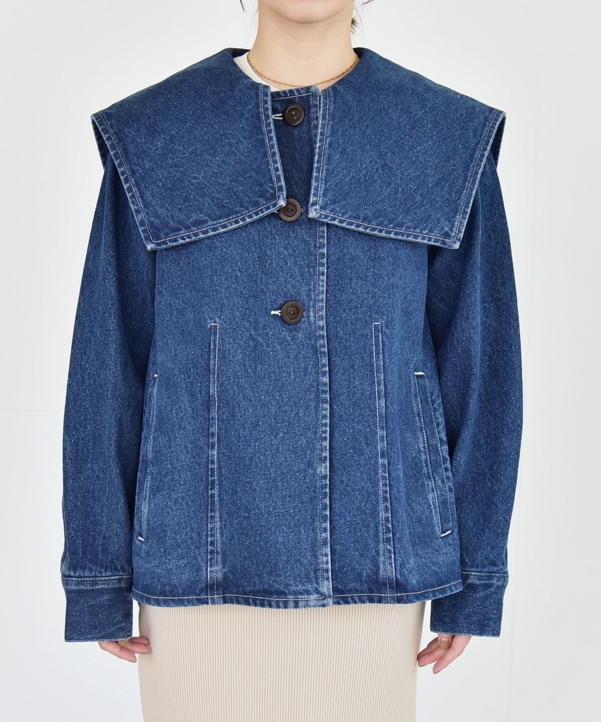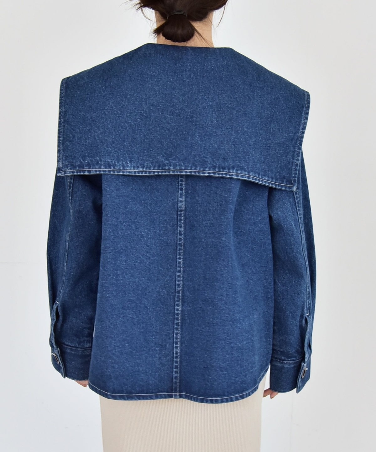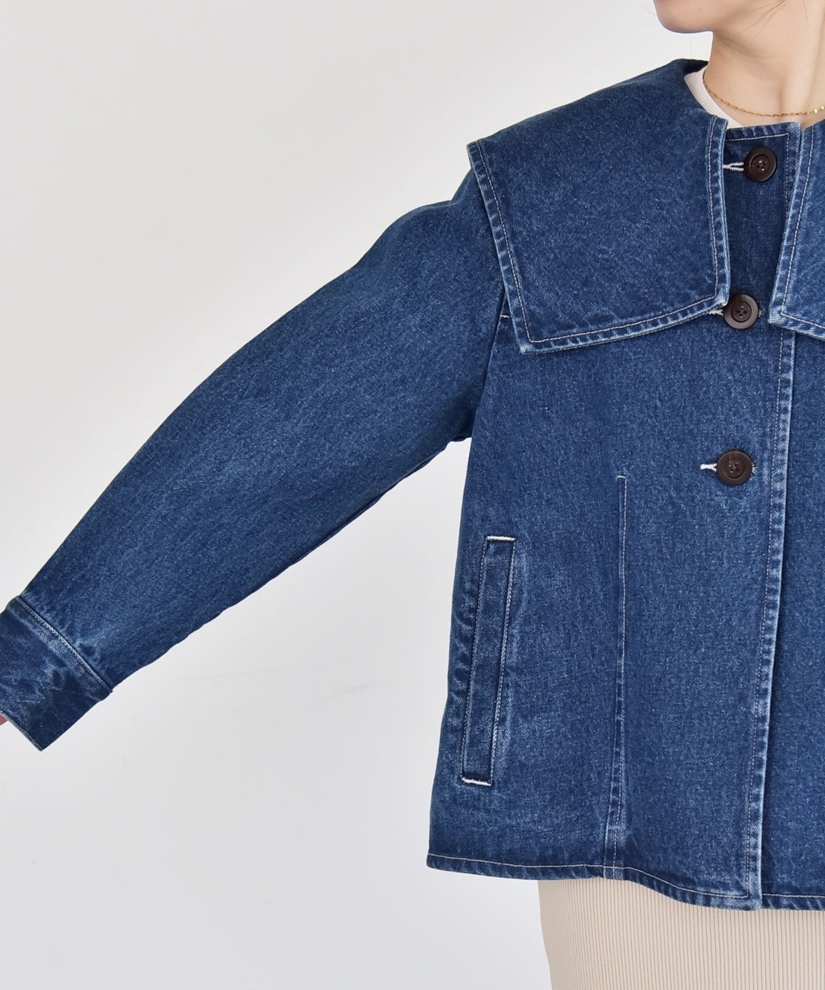 存在感のある大きめのセーラーカラーが印象的なデニムジャケット。