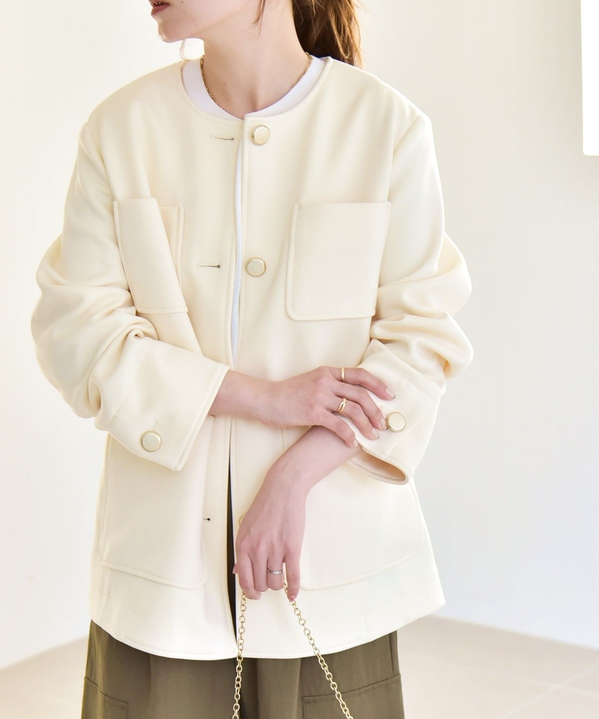 マットな素材に大きめのゴールドボタンが目を惹く、ノーカラージャケットが登場。