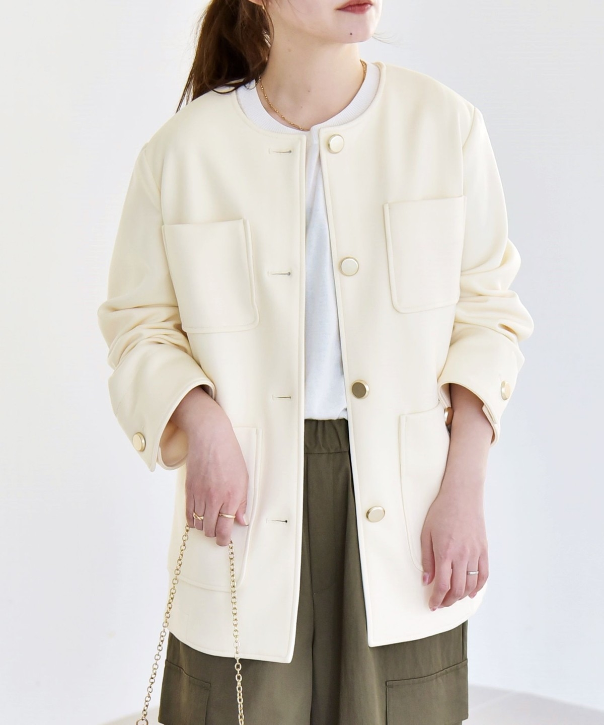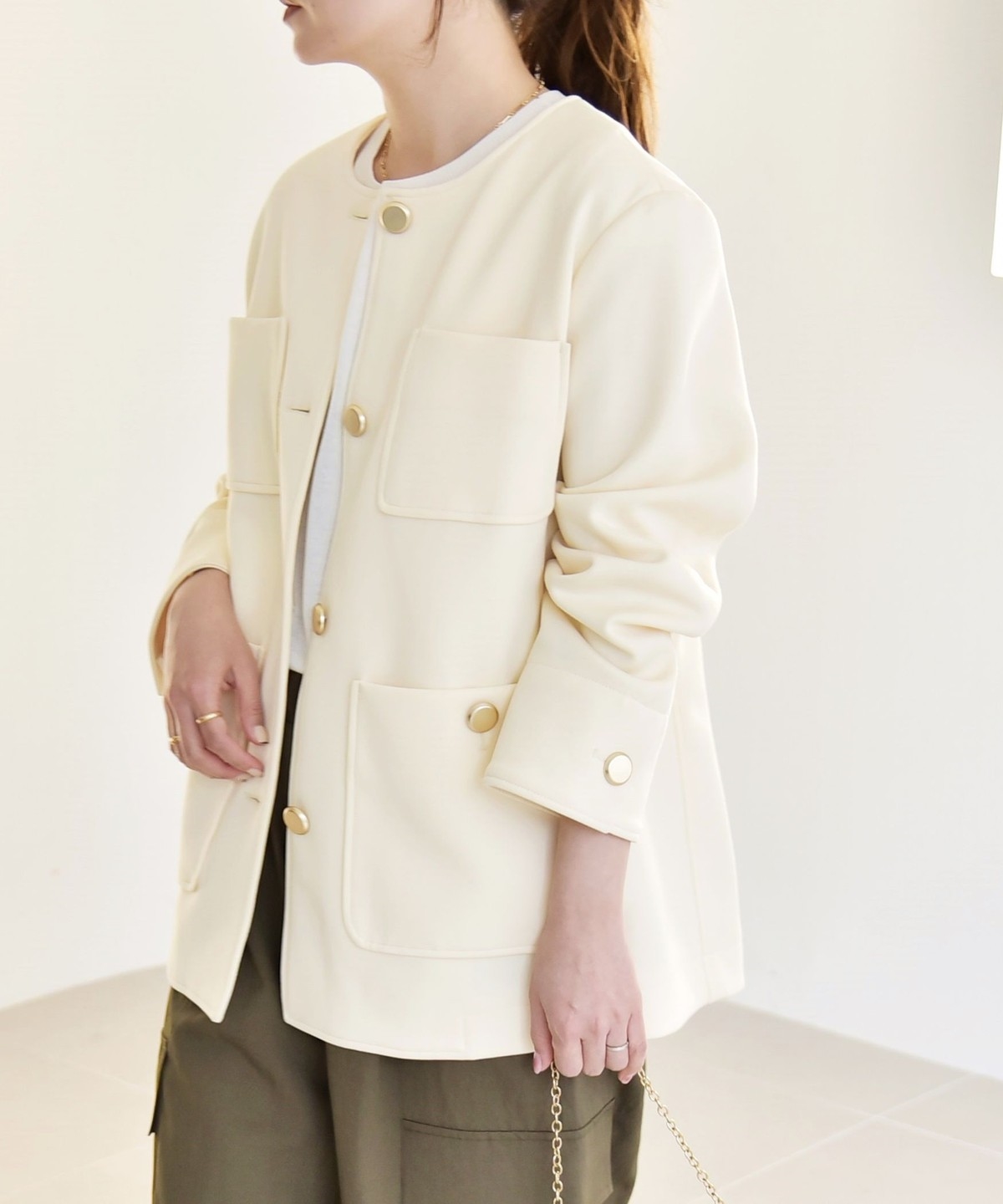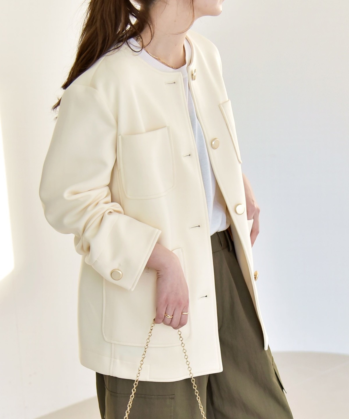 襟もとはすっきりとしたノーカラーがフェミニンな印象に。