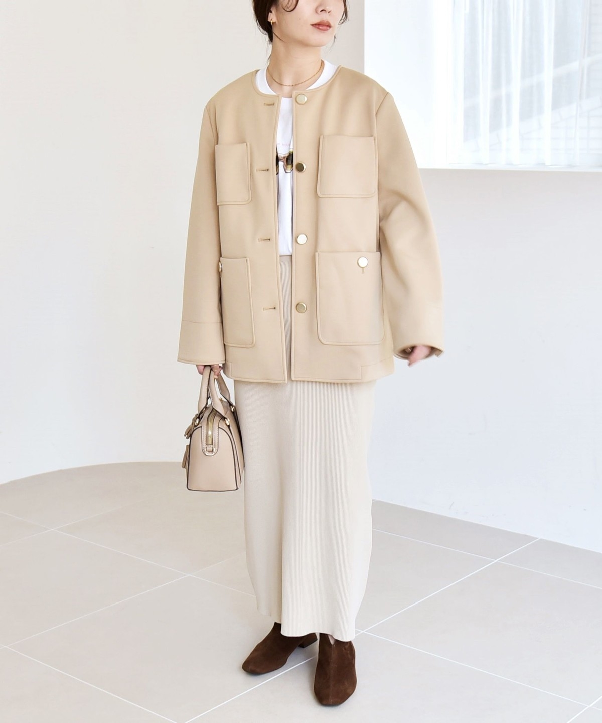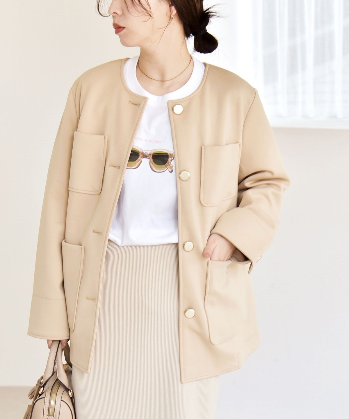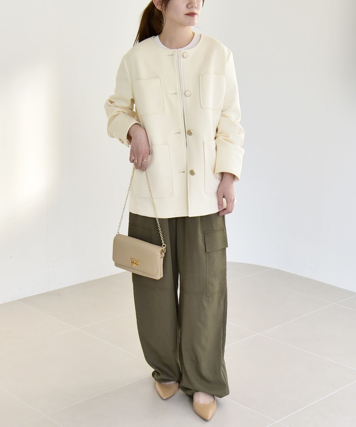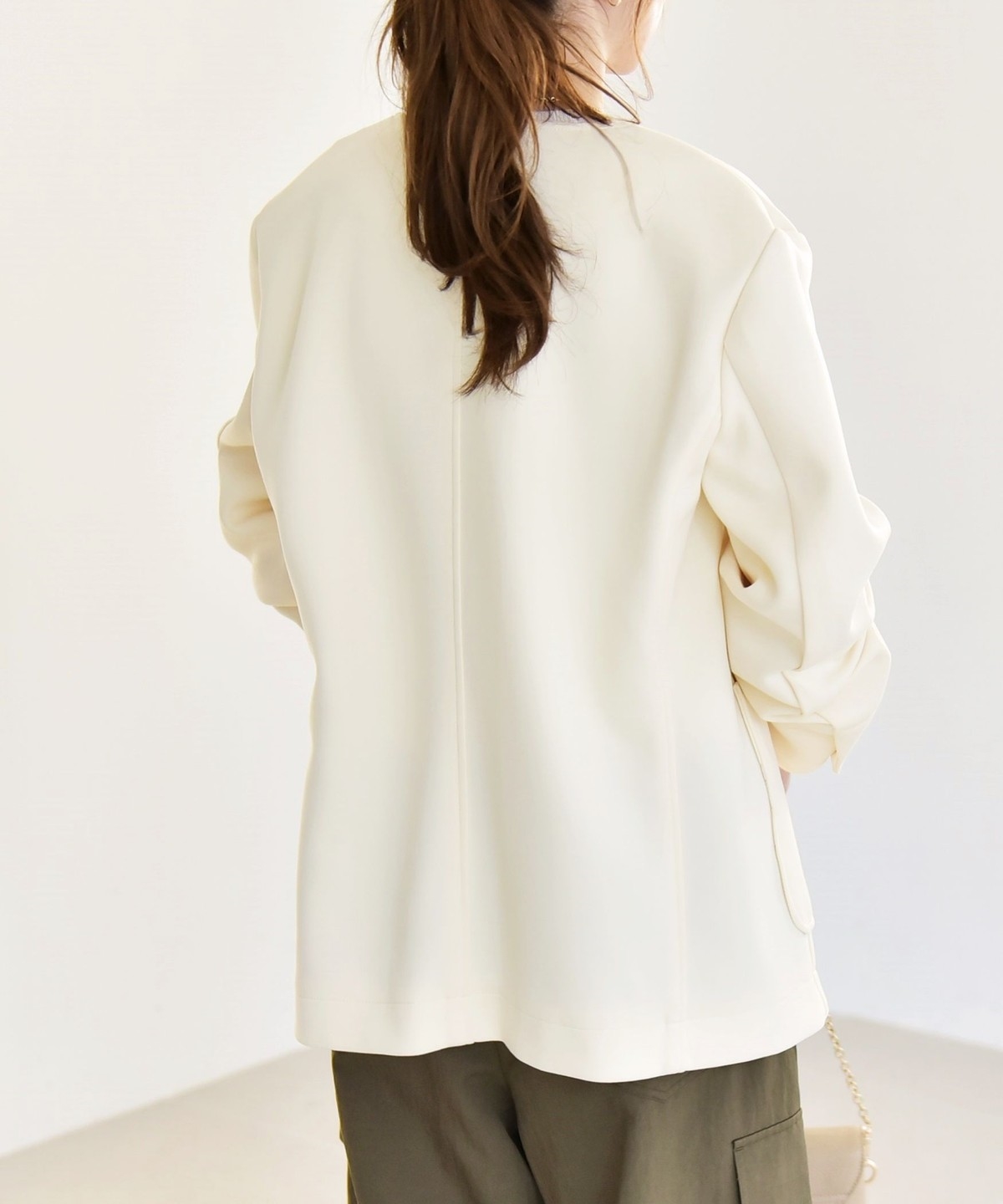 襟もとはすっきりとしたノーカラーがフェミニンな印象に。