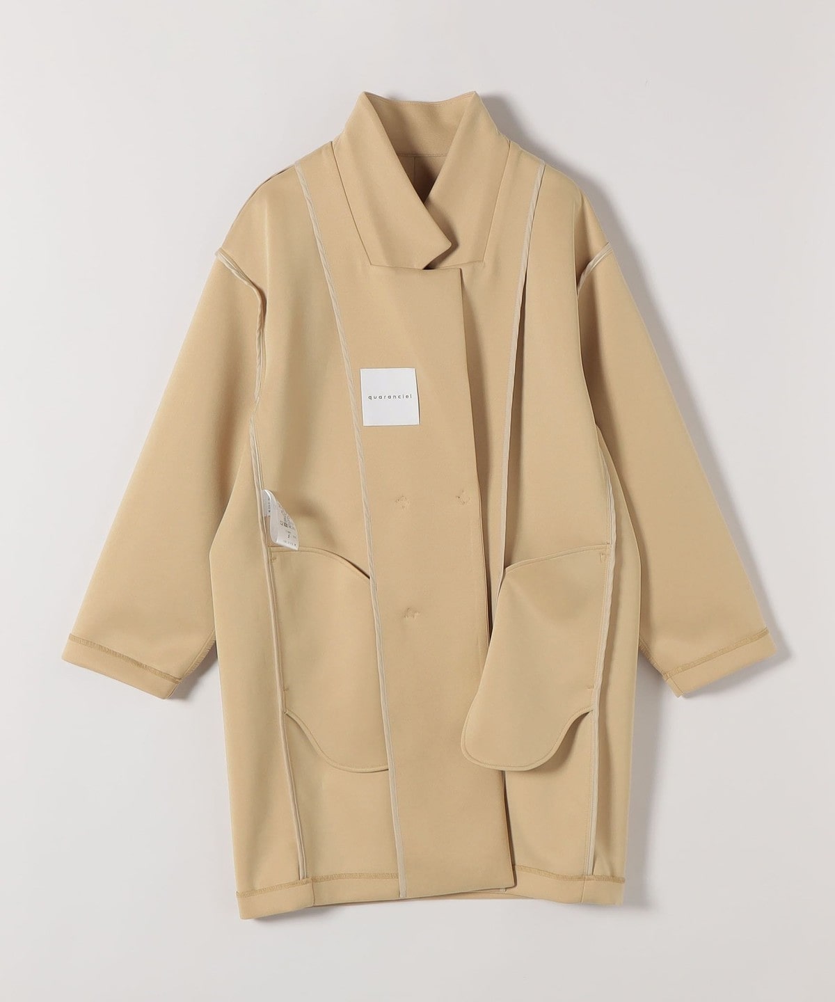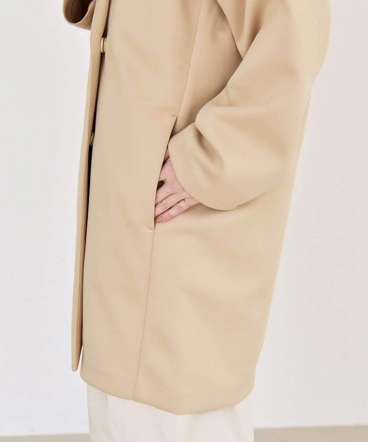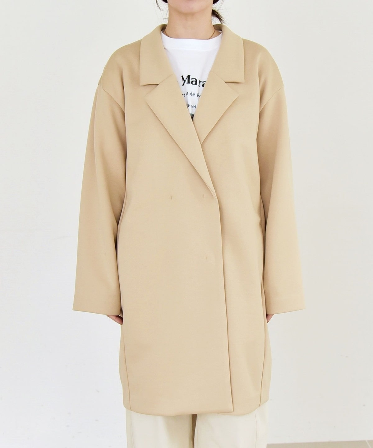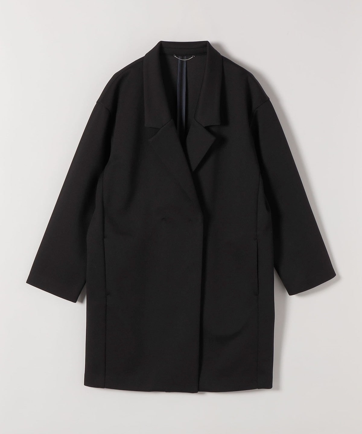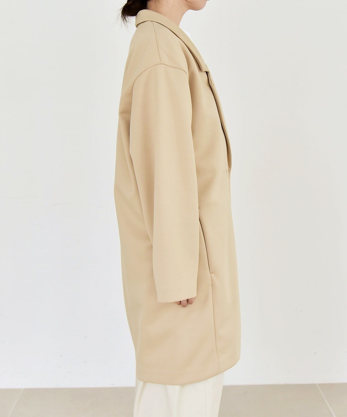 長めの着丈と直線的なシルエットが縦のラインを強調し、すっきりとしたスタイルに。