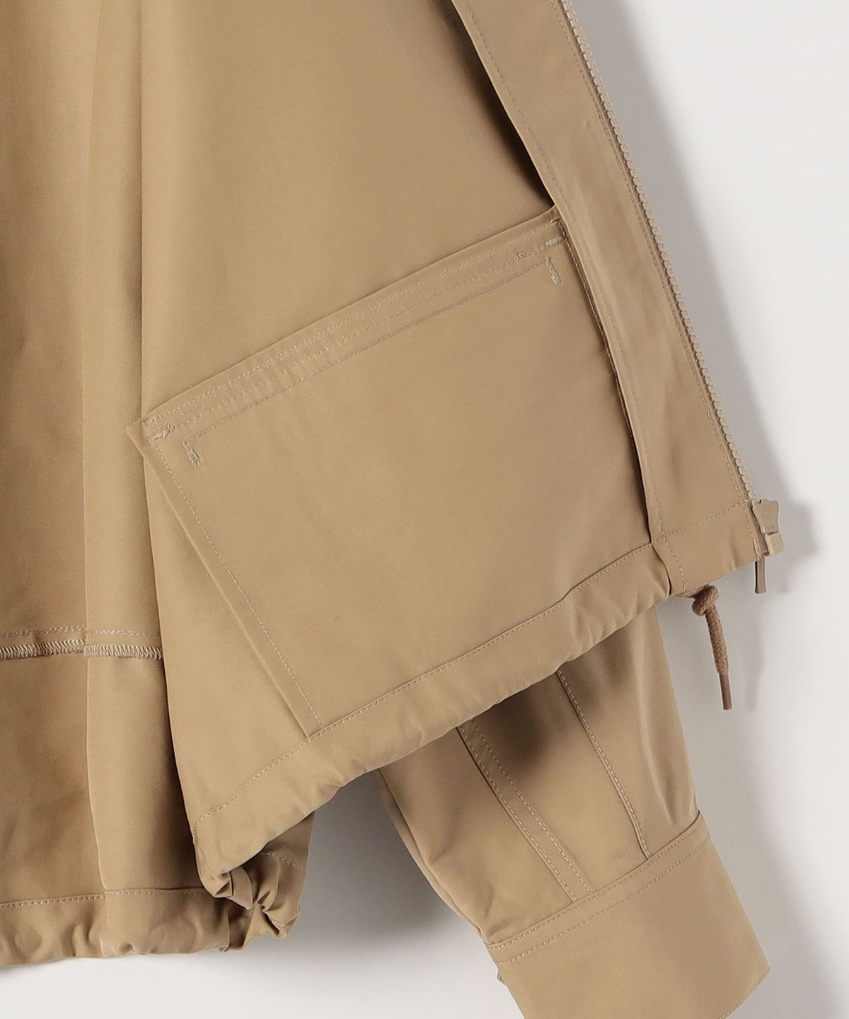 フロントはファスナー仕様、襟元と裾にはドローコードを備えており、ギャザーをよせたシルエットにアレンジも可能です。