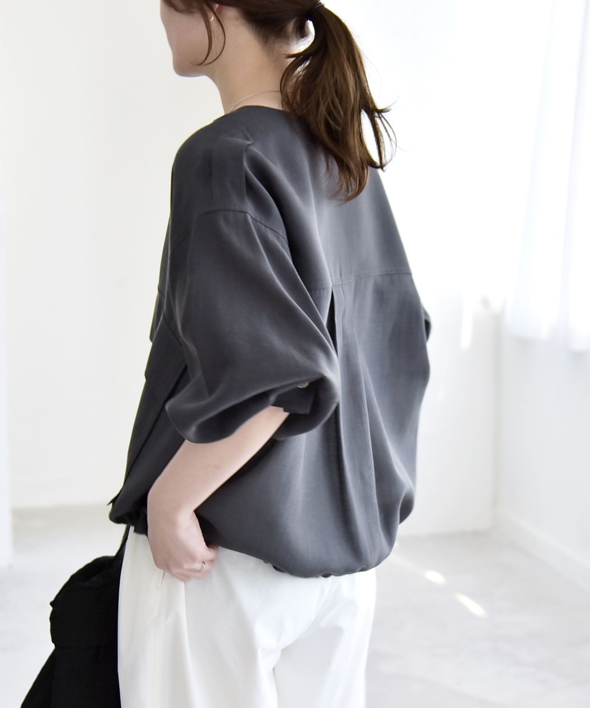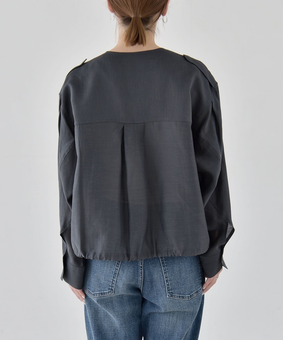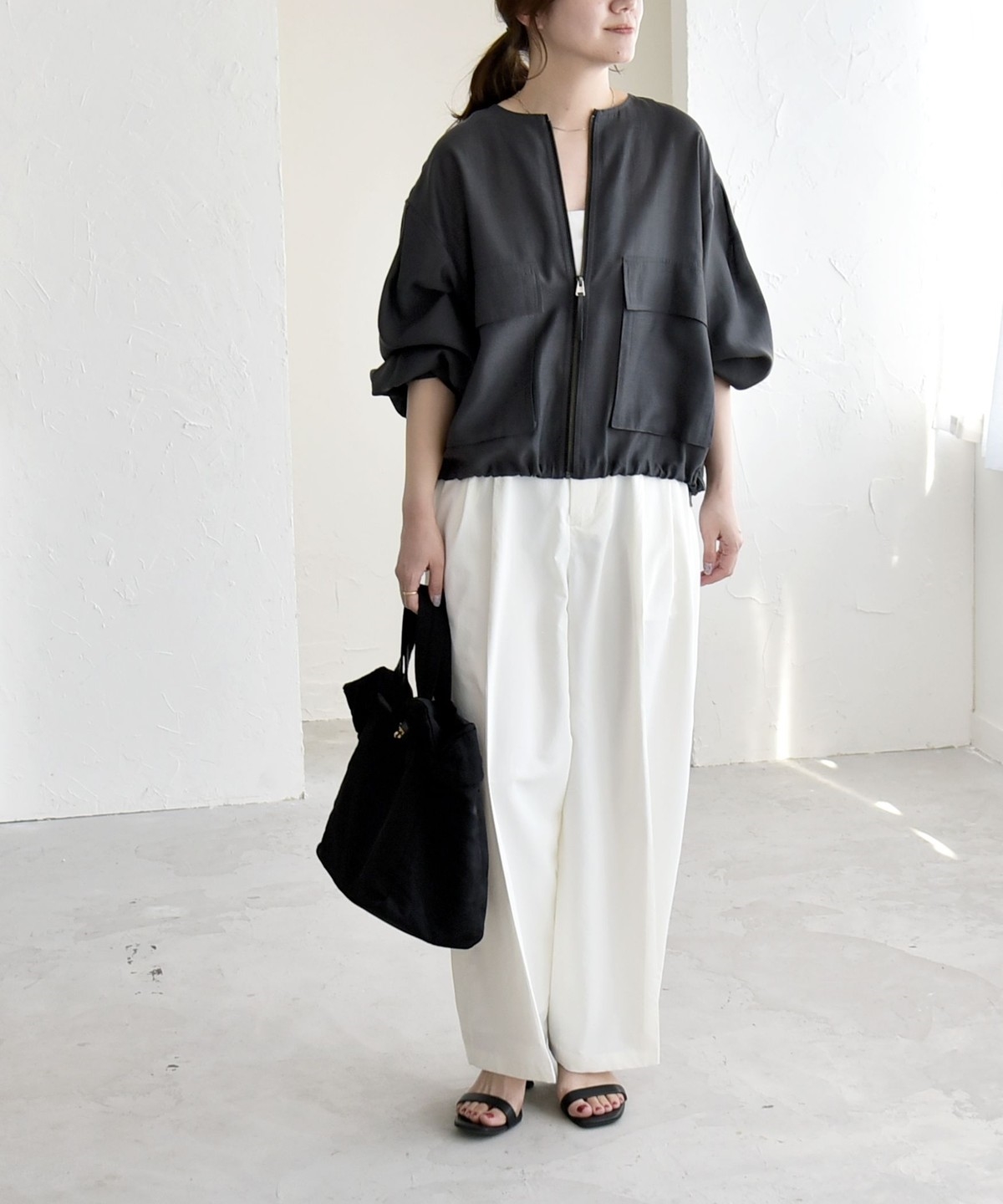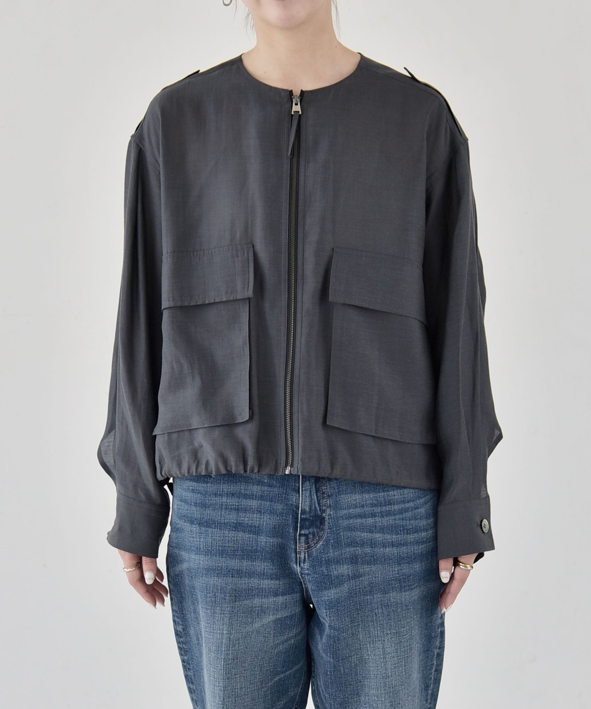 首元はノーカラーのクルーネックですっきりさせながら、フロントに大きめのフラップポケットを施しアクセントに。