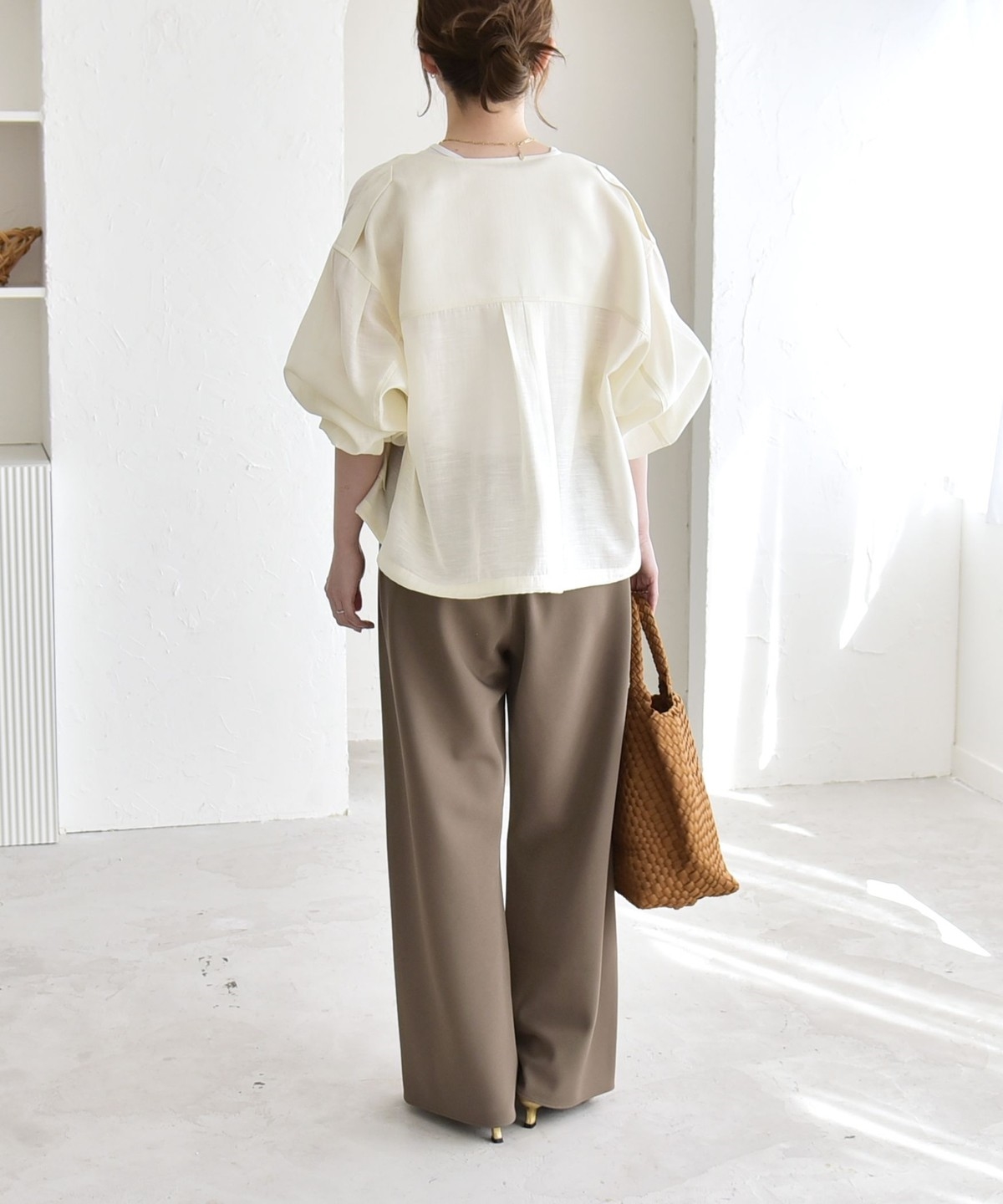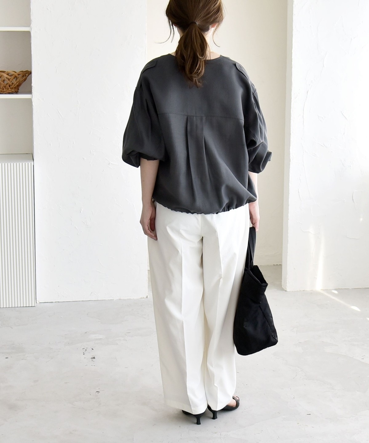袖がたっぷりとしているので、きゅっと捲って着用するとさらにボリューム感が出て可愛いシルエットになります。