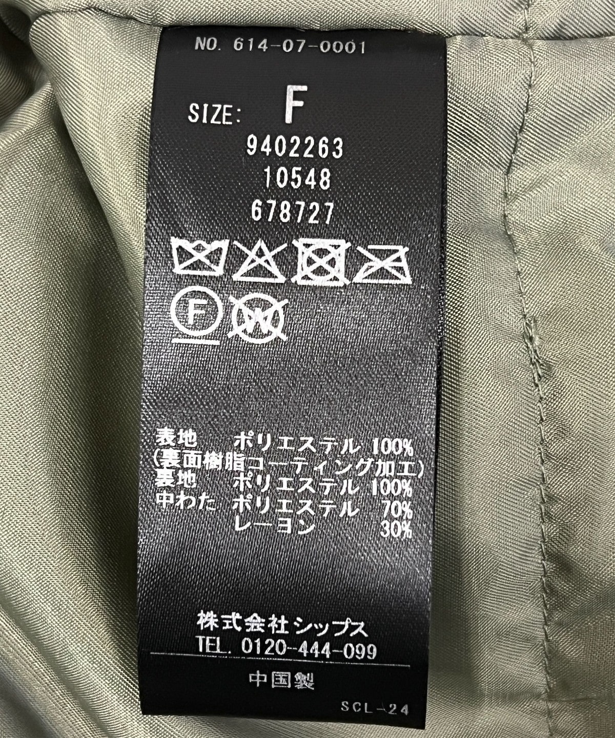 素材:表地: ポリレステル100%(裏面樹脂コーティング加工), 裏地: ポリエステル100%, 中わた: ポリエステル70%, レーヨン30%