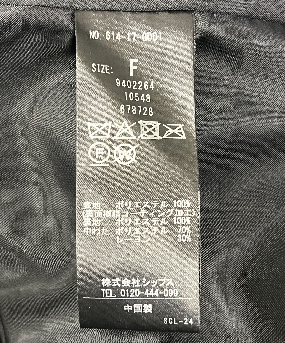 素材:表地: ポリエステル100%(裏面樹脂コーティング加工), 裏地: ポリレステル100%, 中わた: ポリエステル70%, レーヨン30%