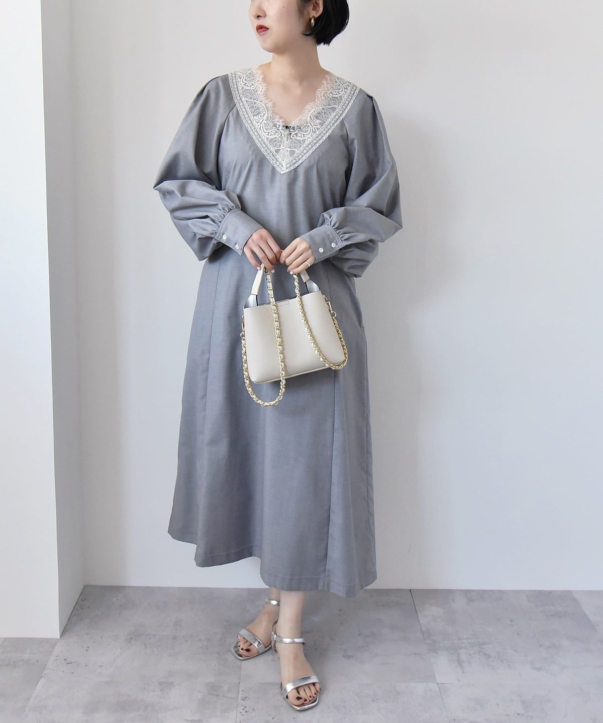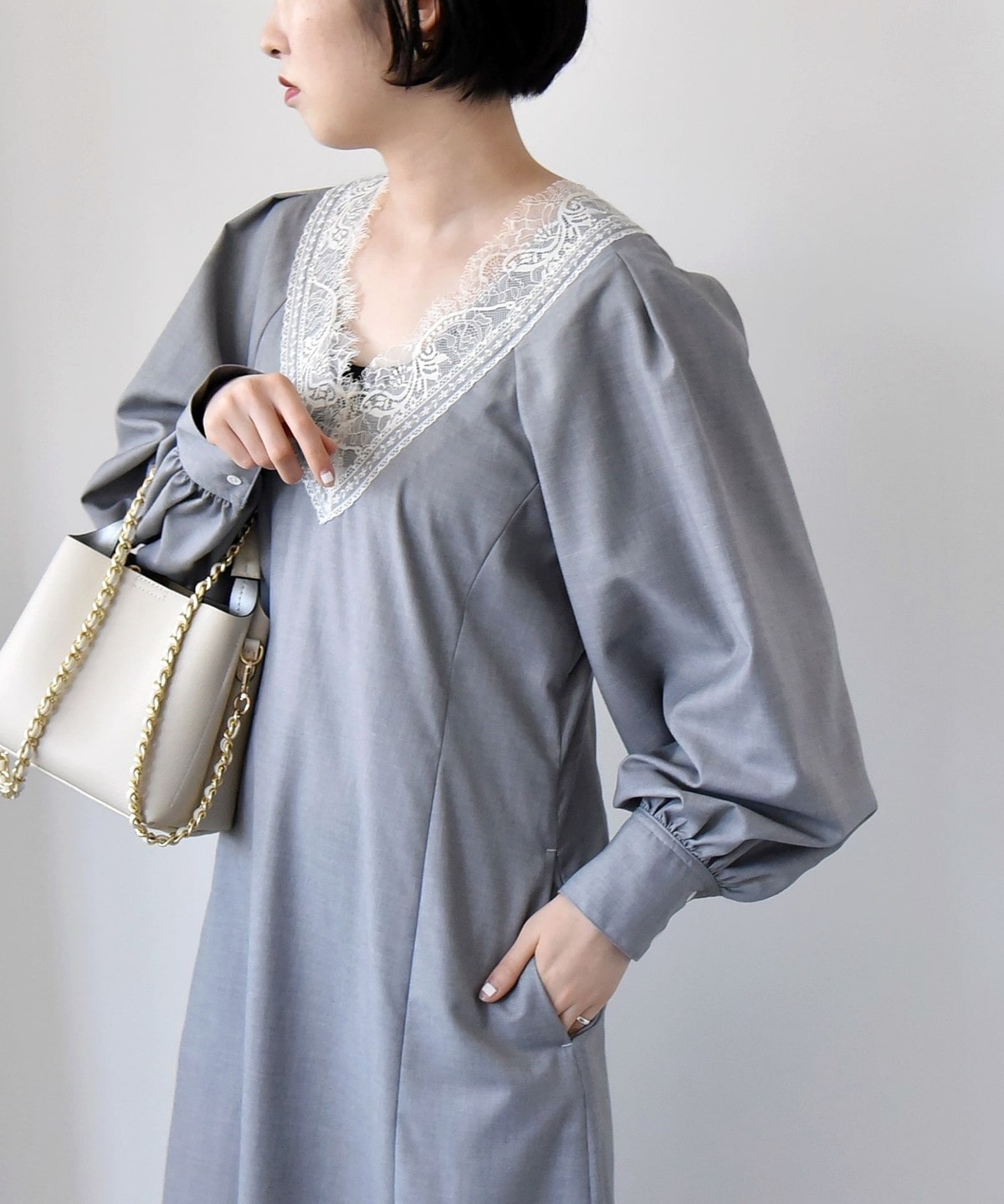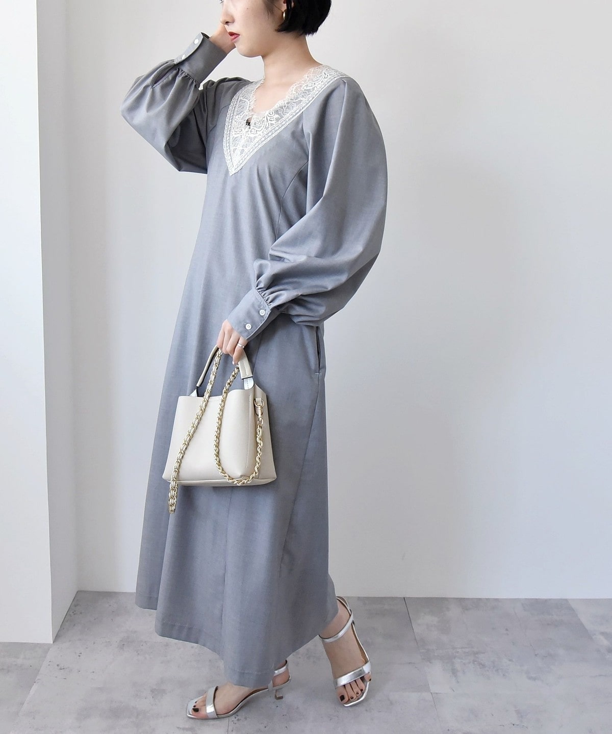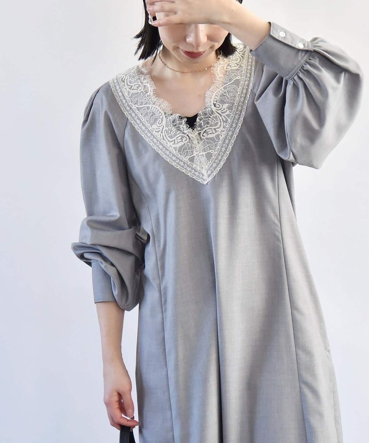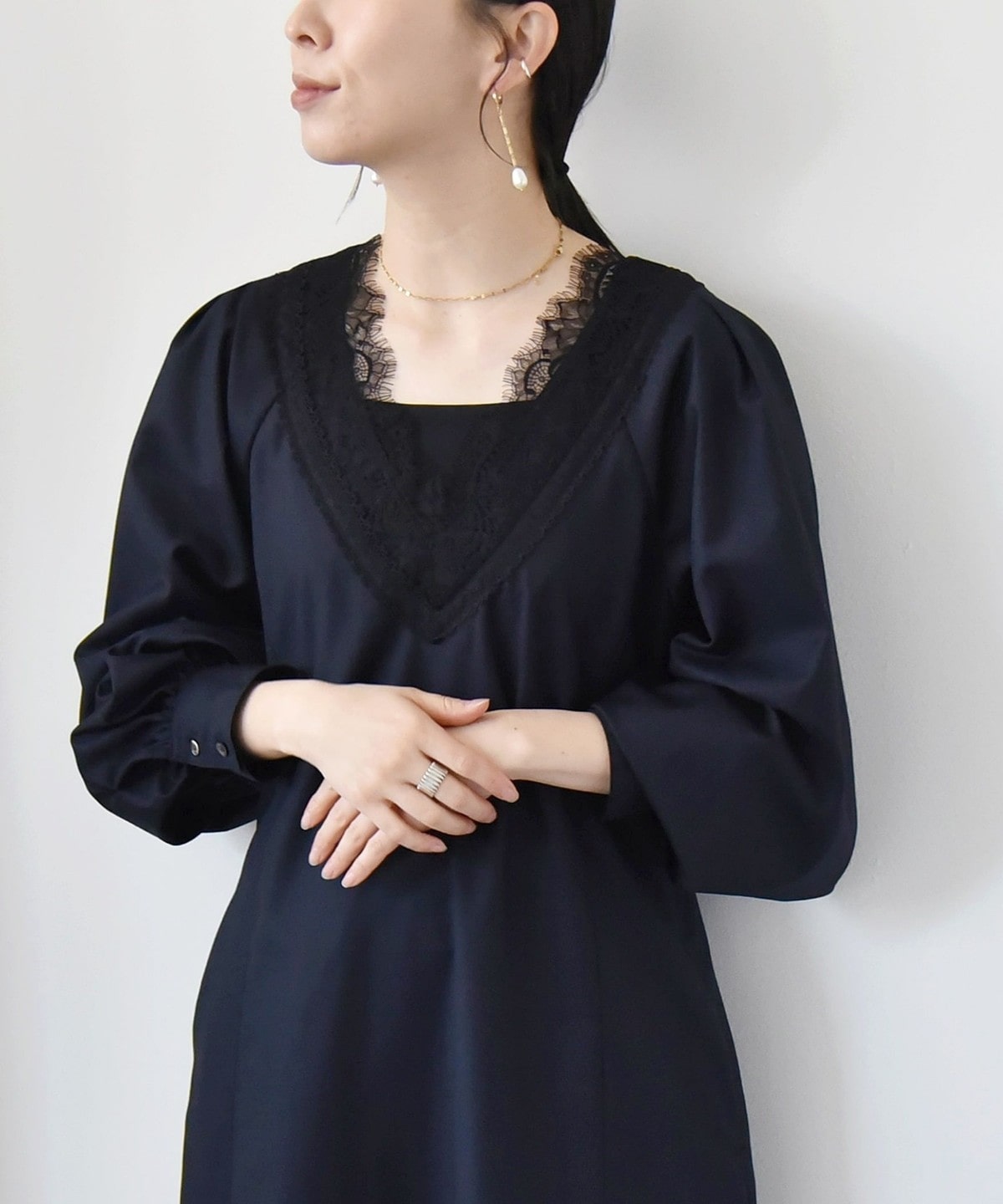 胸元のVのラインがレースも相まって印象的なので、ネックレスは短めの物を合わせていただくとバランスよく仕上がります。