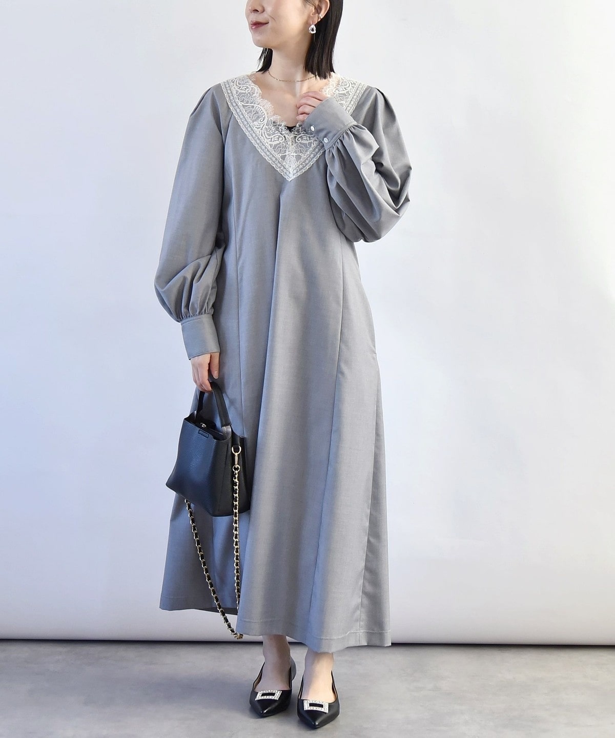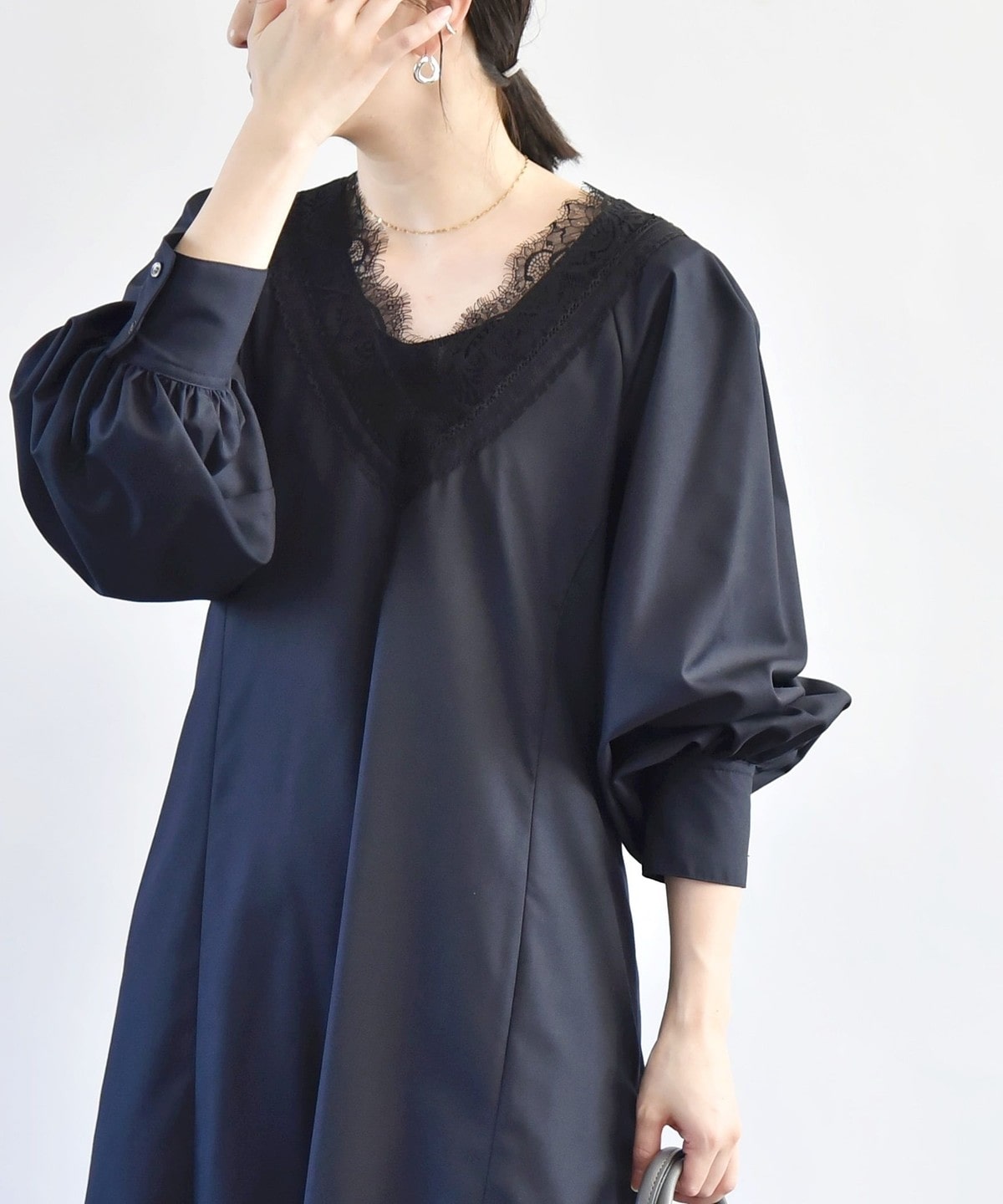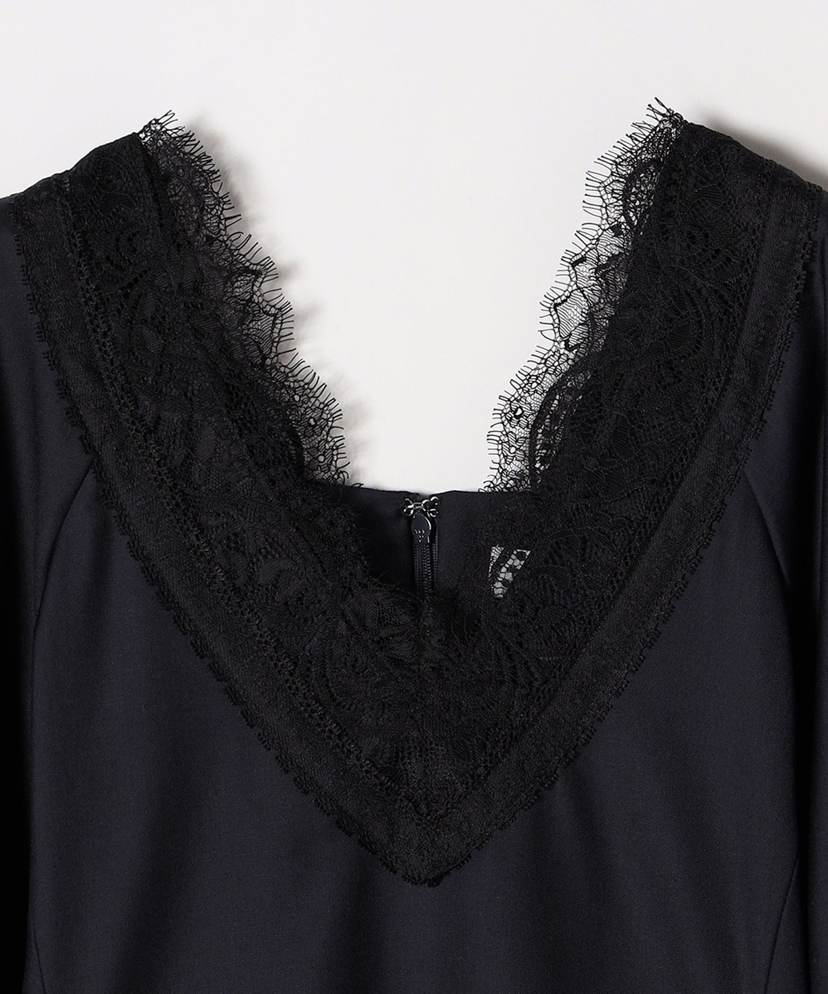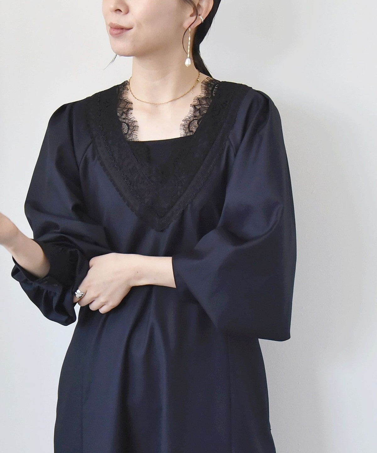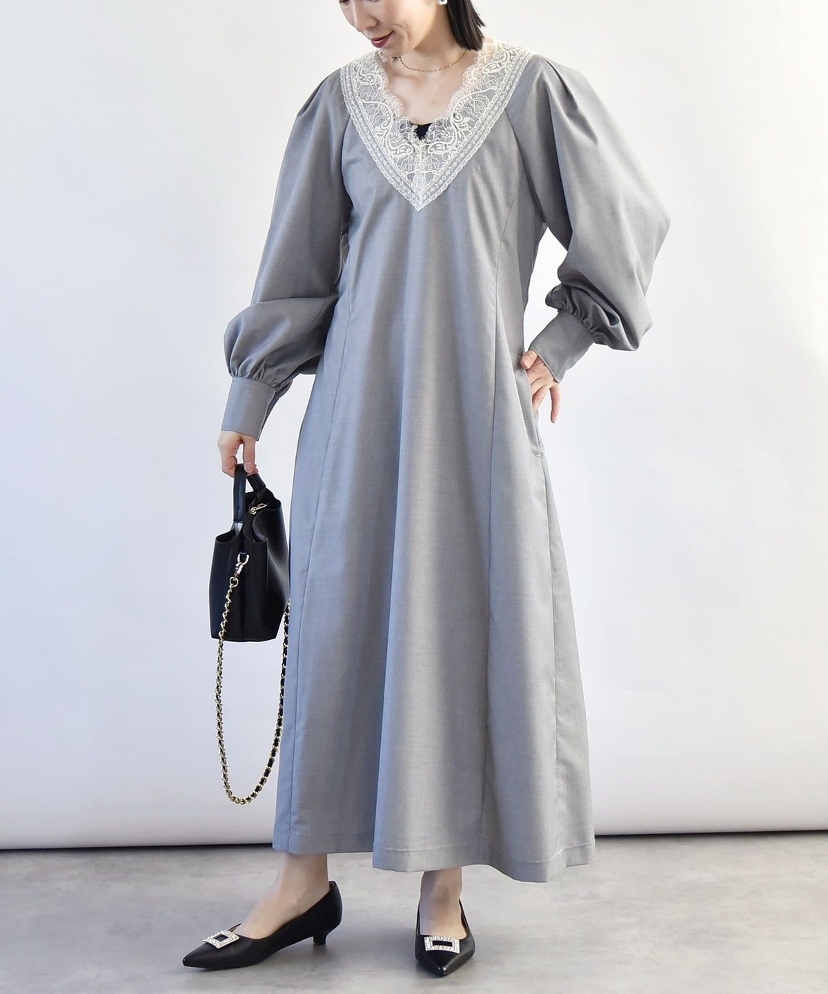 胸元のVのラインがレースも相まって印象的なので、ネックレスは短めの物を合わせていただくとバランスよく仕上がります。