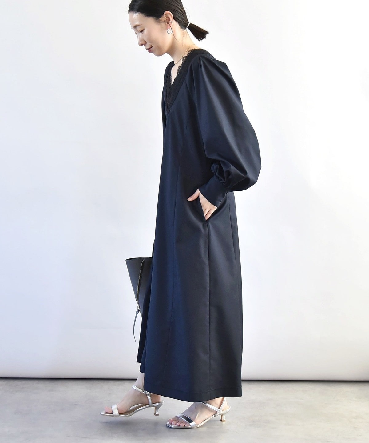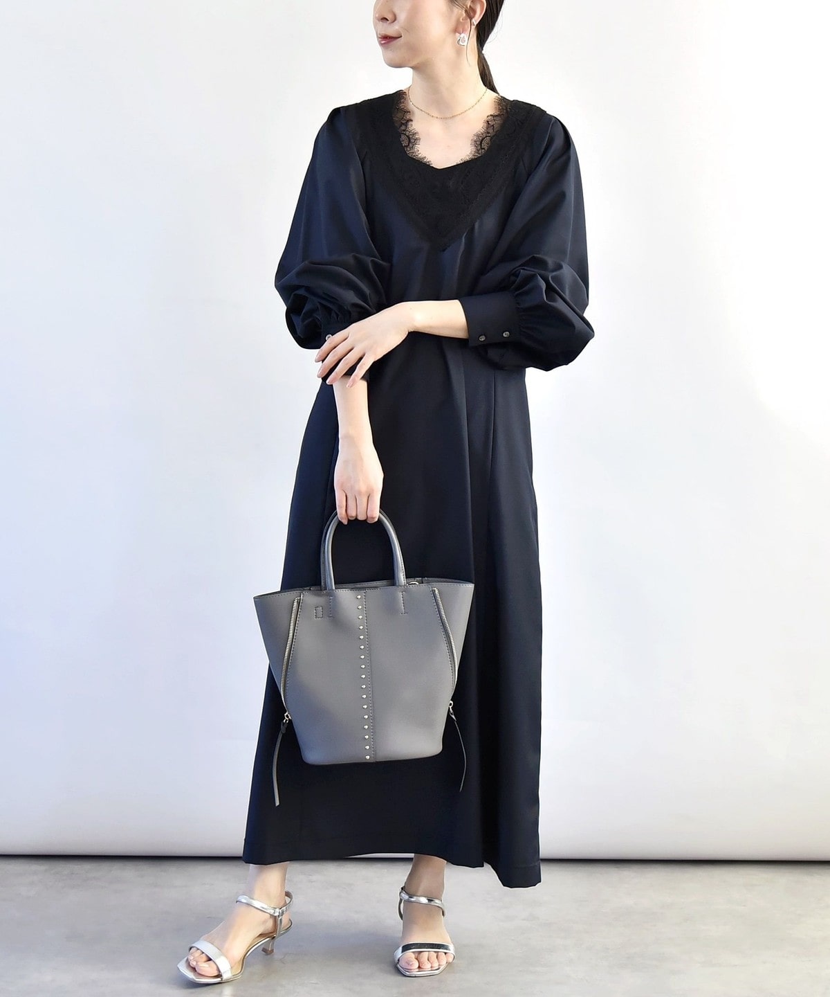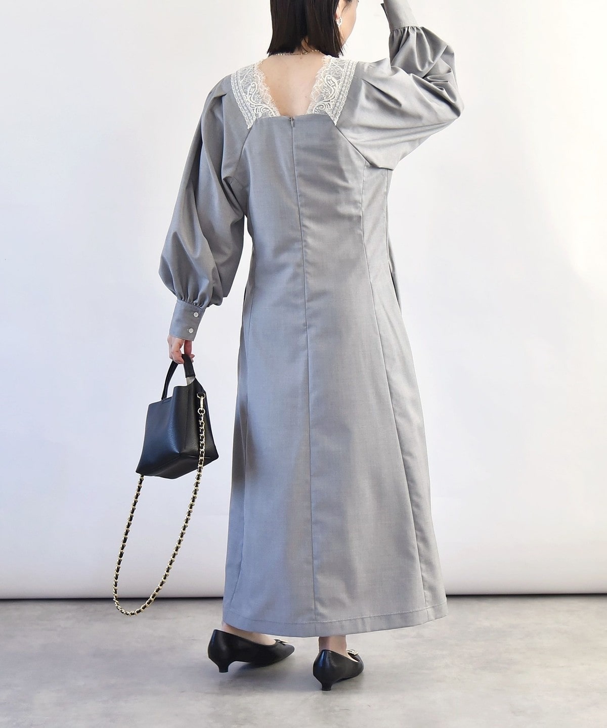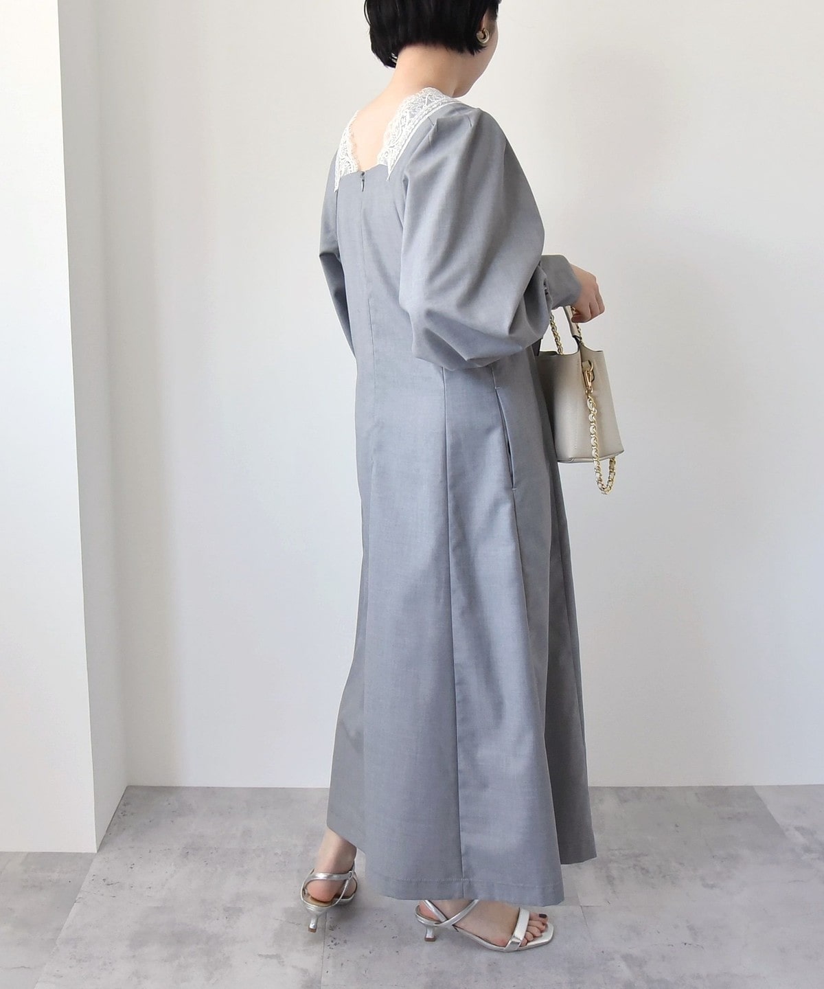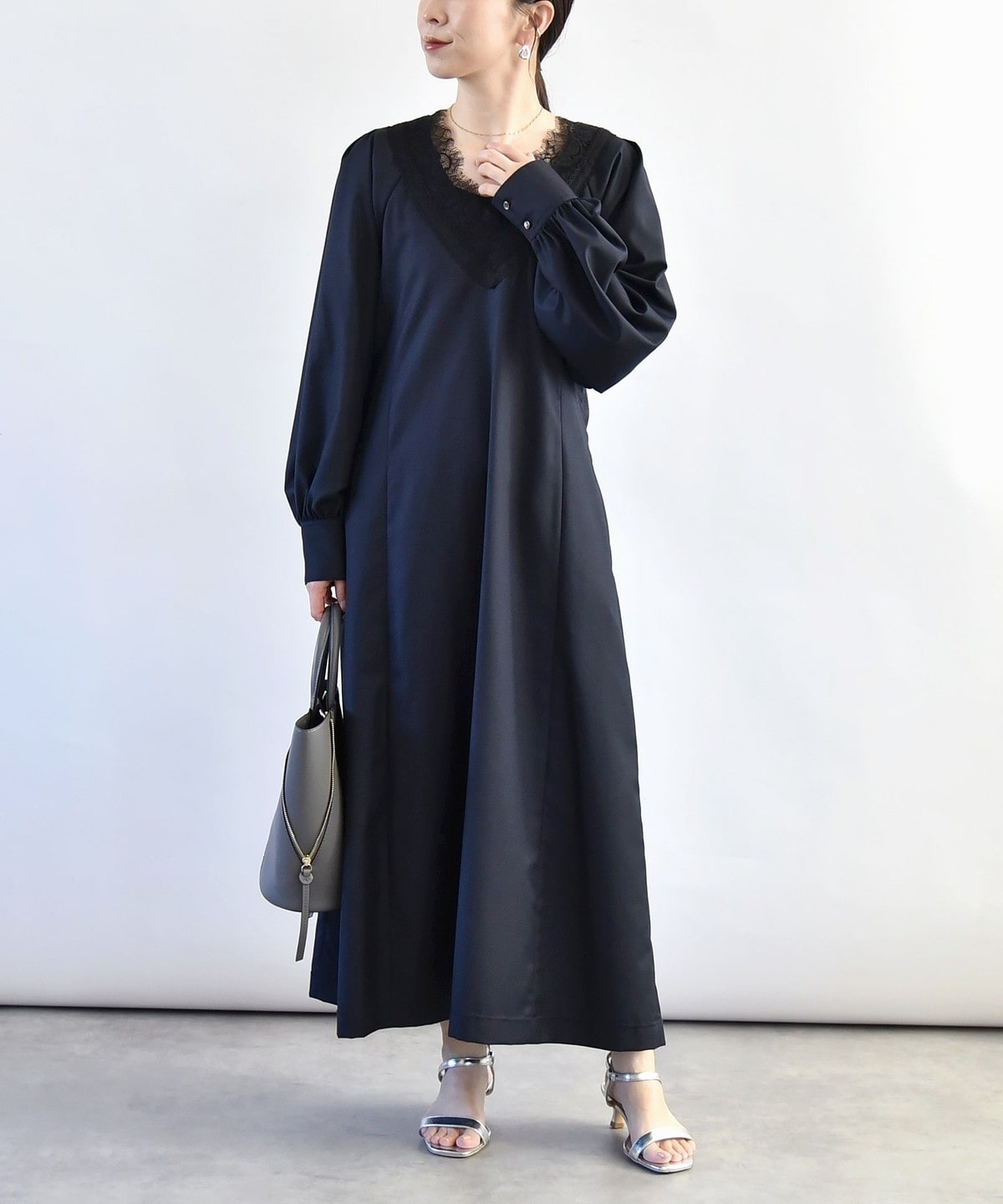 胸元のVのラインがレースも相まって印象的なので、ネックレスは短めの物を合わせていただくとバランスよく仕上がります。