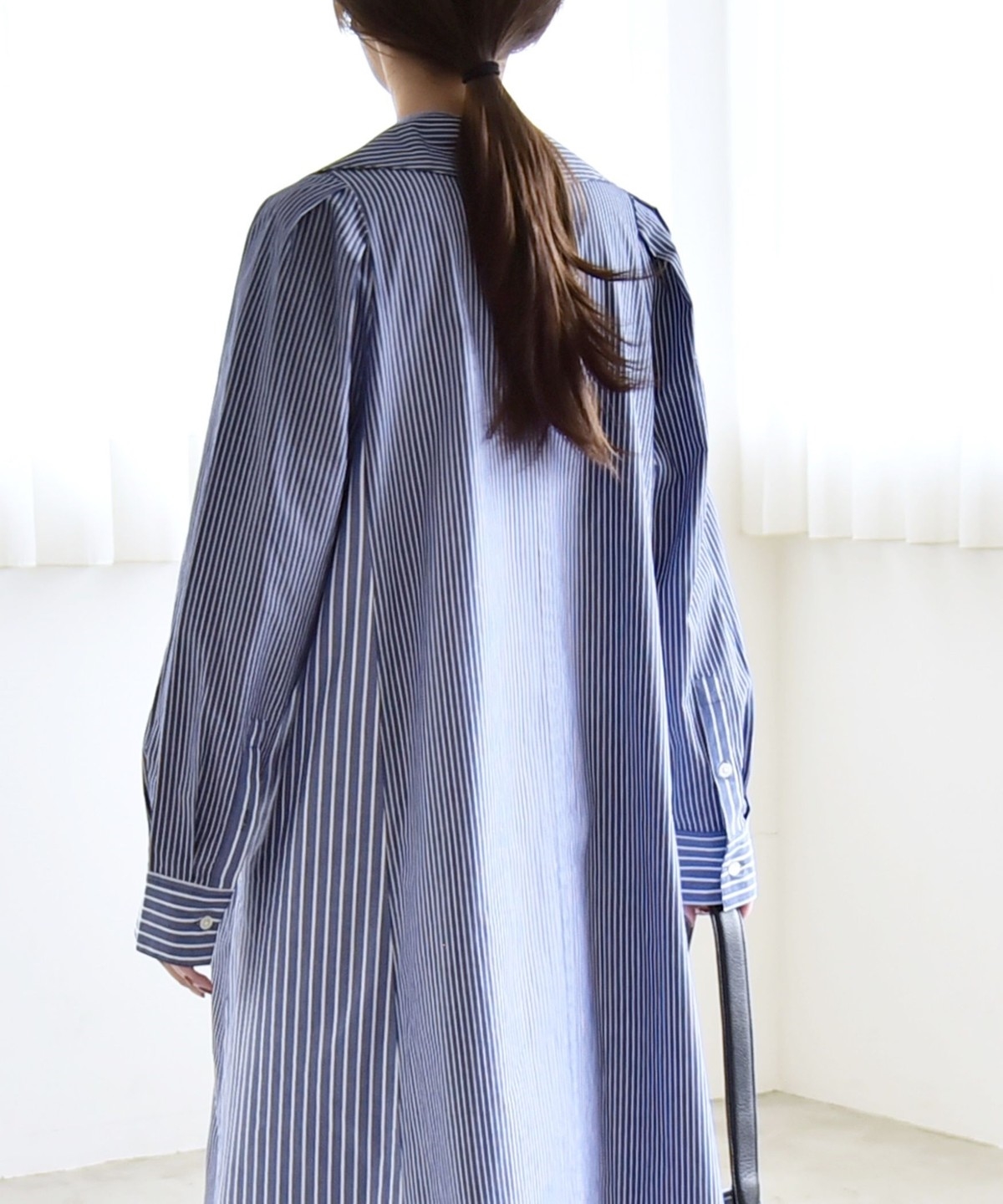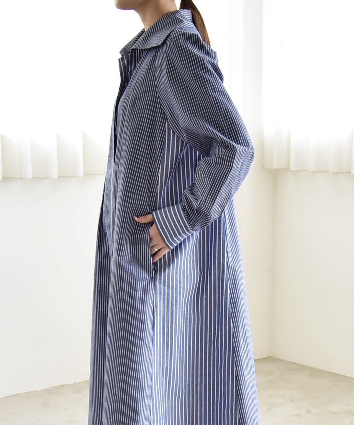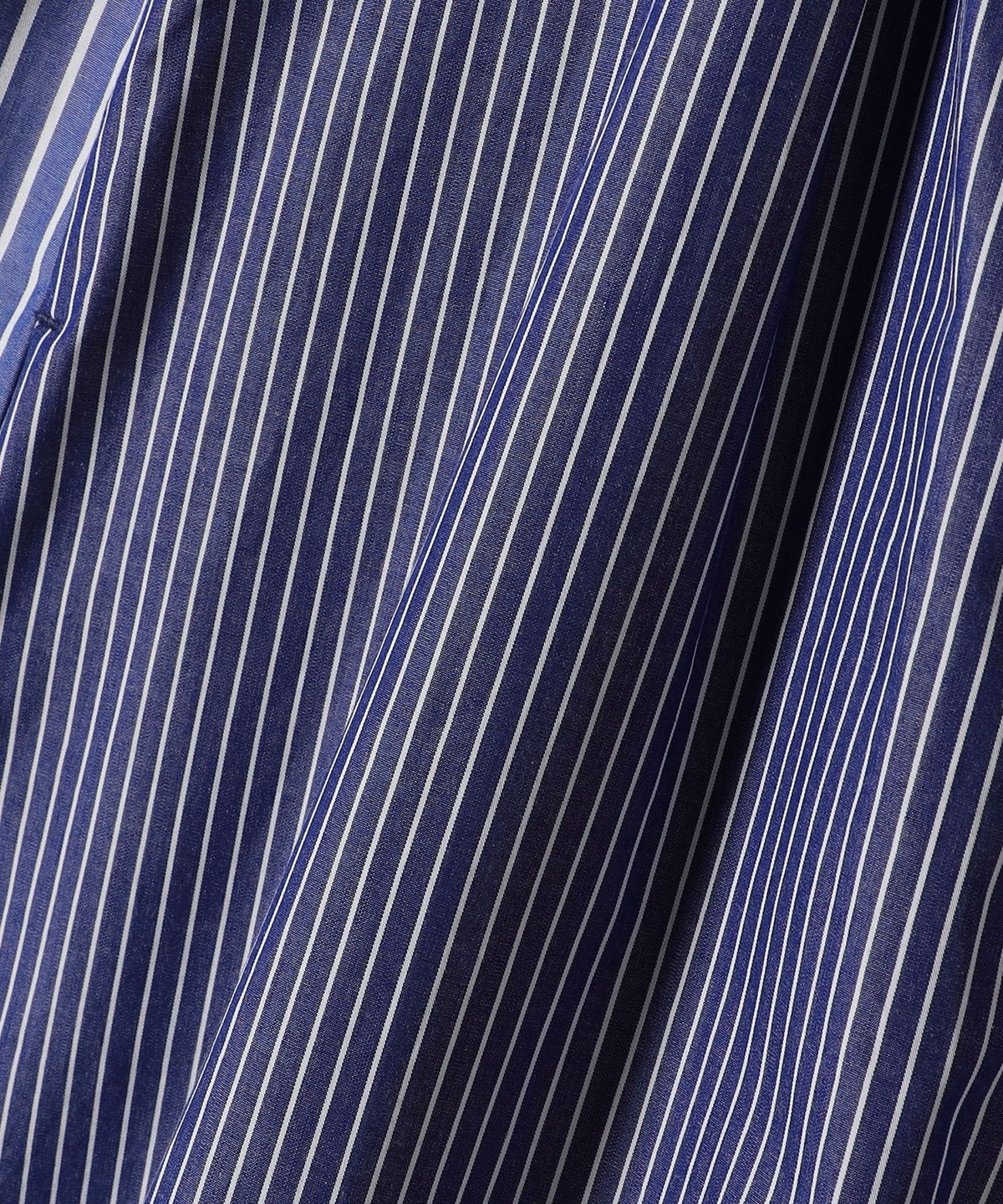 無地のネイビーと、クレイジーパターンのストライプ柄がポイントのシャツワンピース。