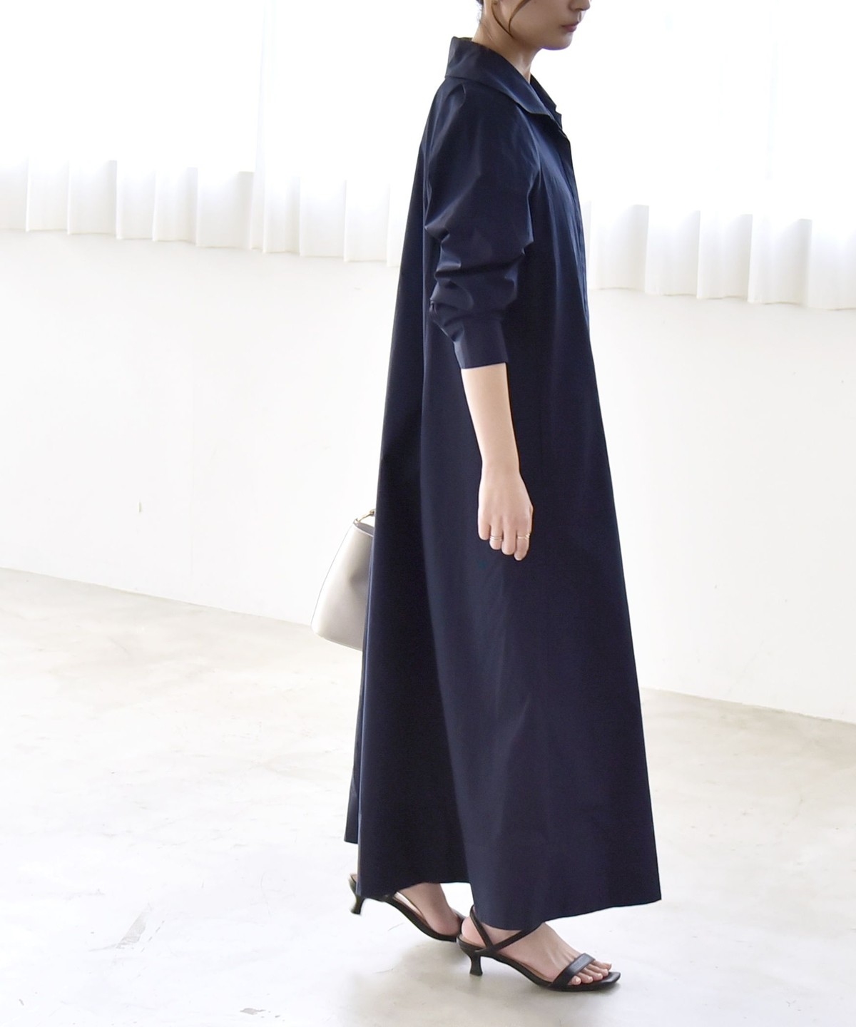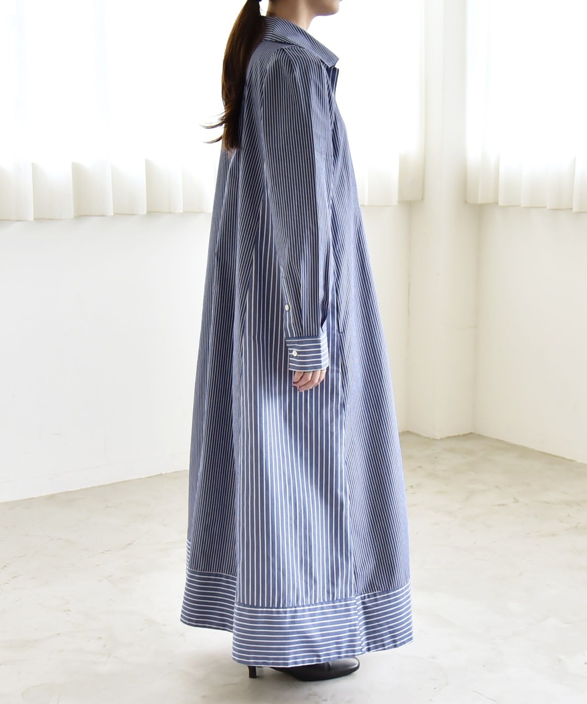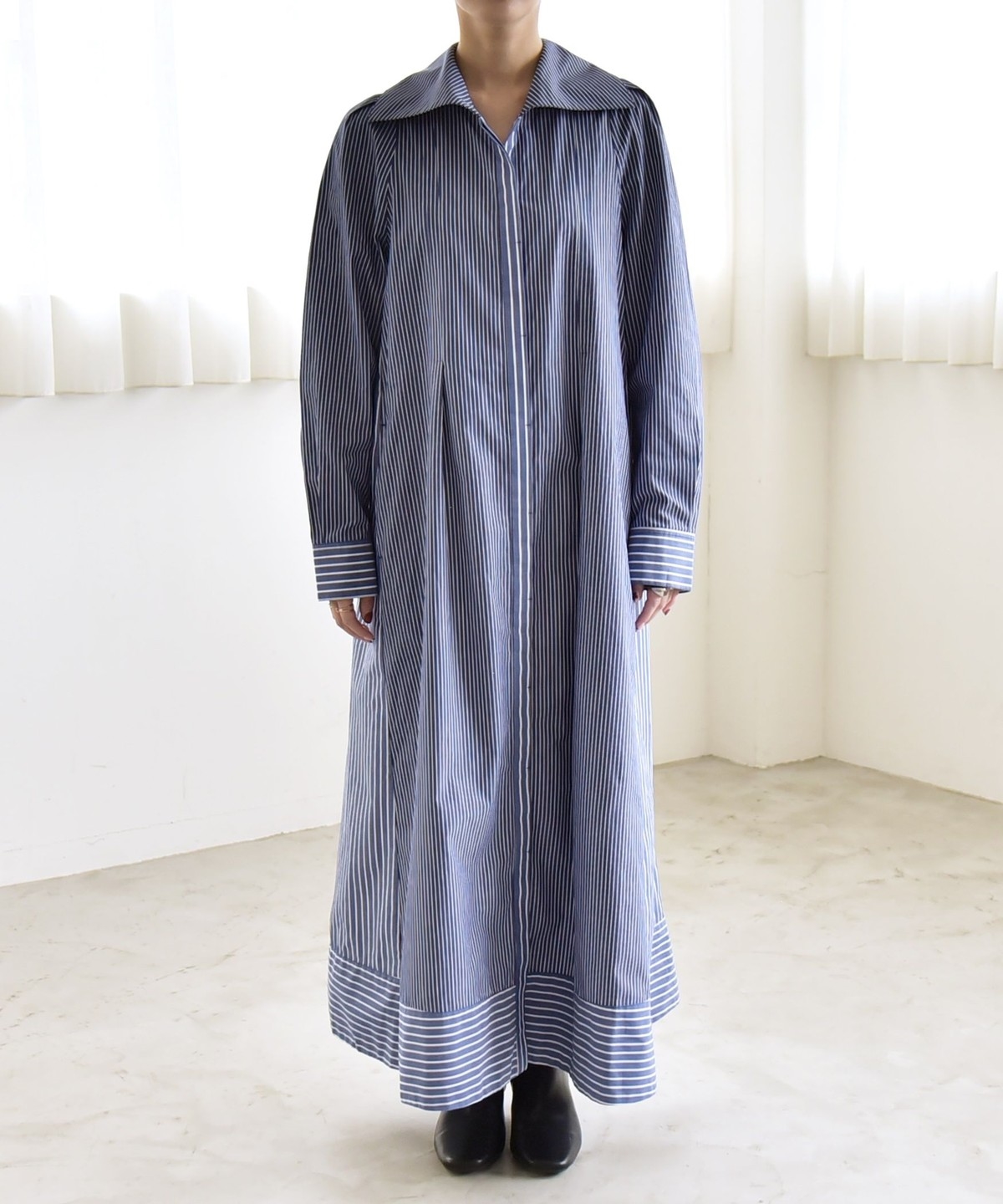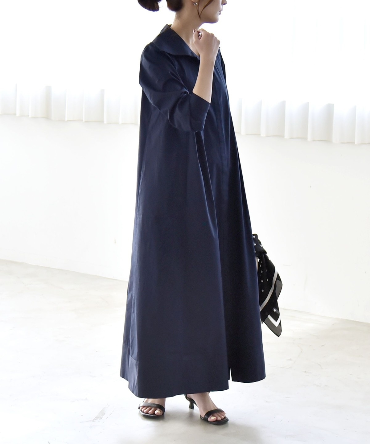 サイズ感:足首まで来るマキシ丈。フラットシューズでも地面にはつかずバランス良く着られます。袖幅や肩幅は広すぎないですが、身幅はゆったりとしていて窮屈感はありません。