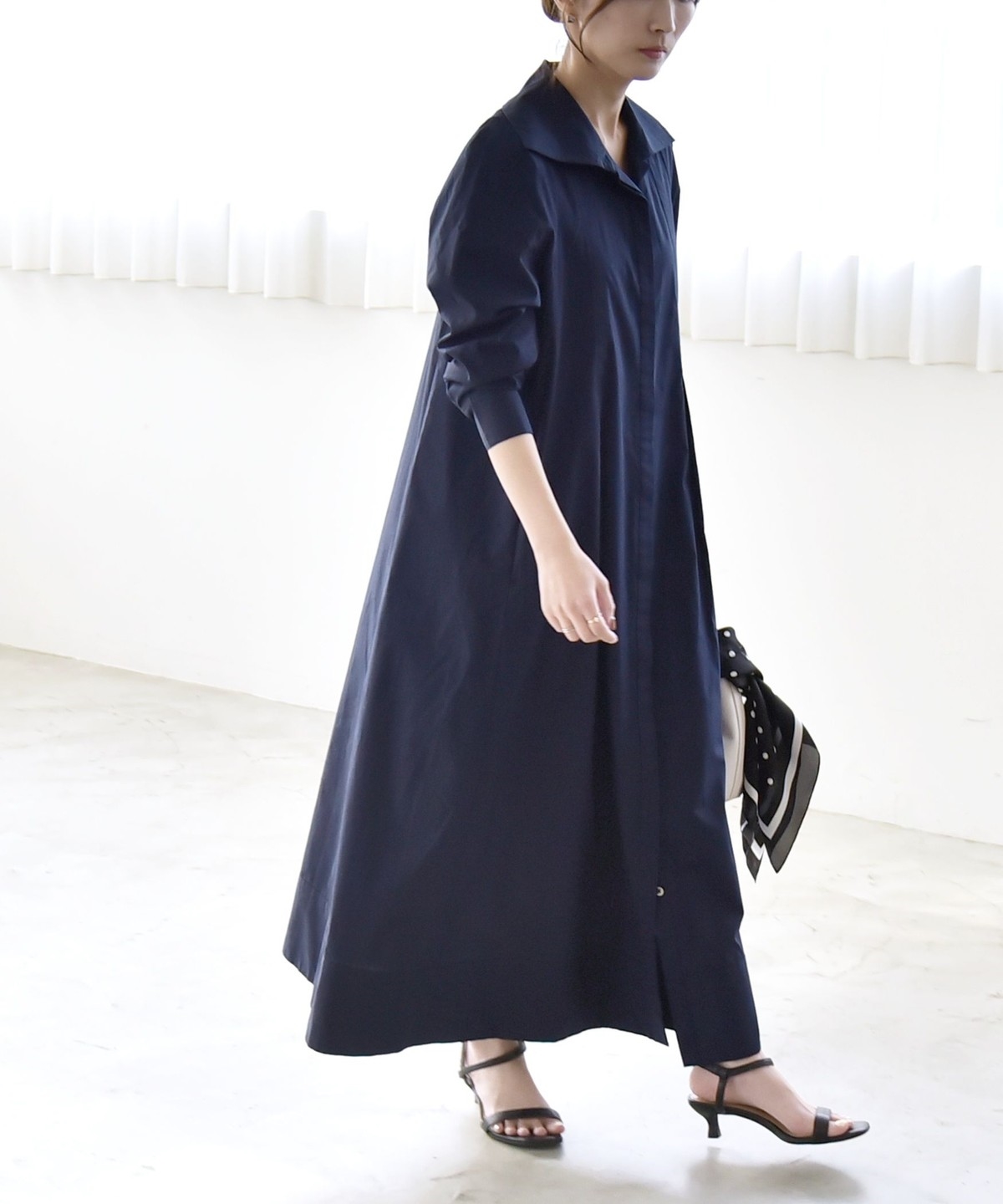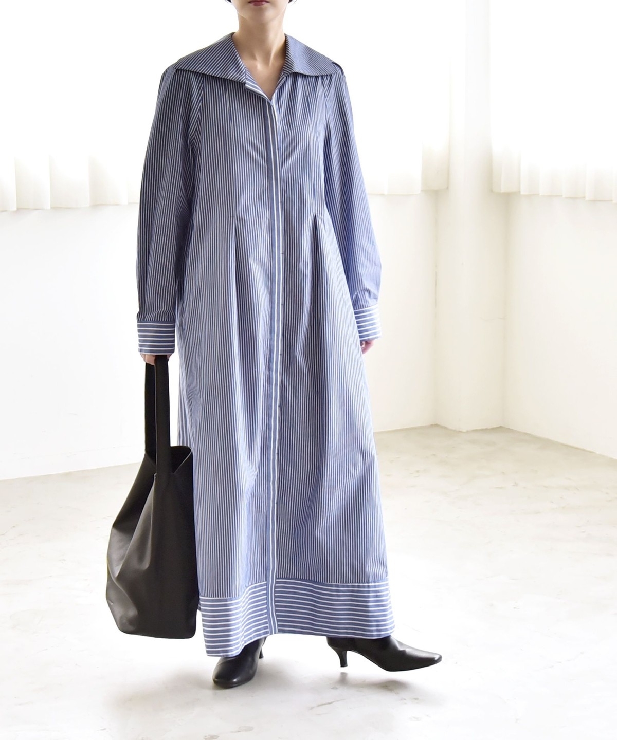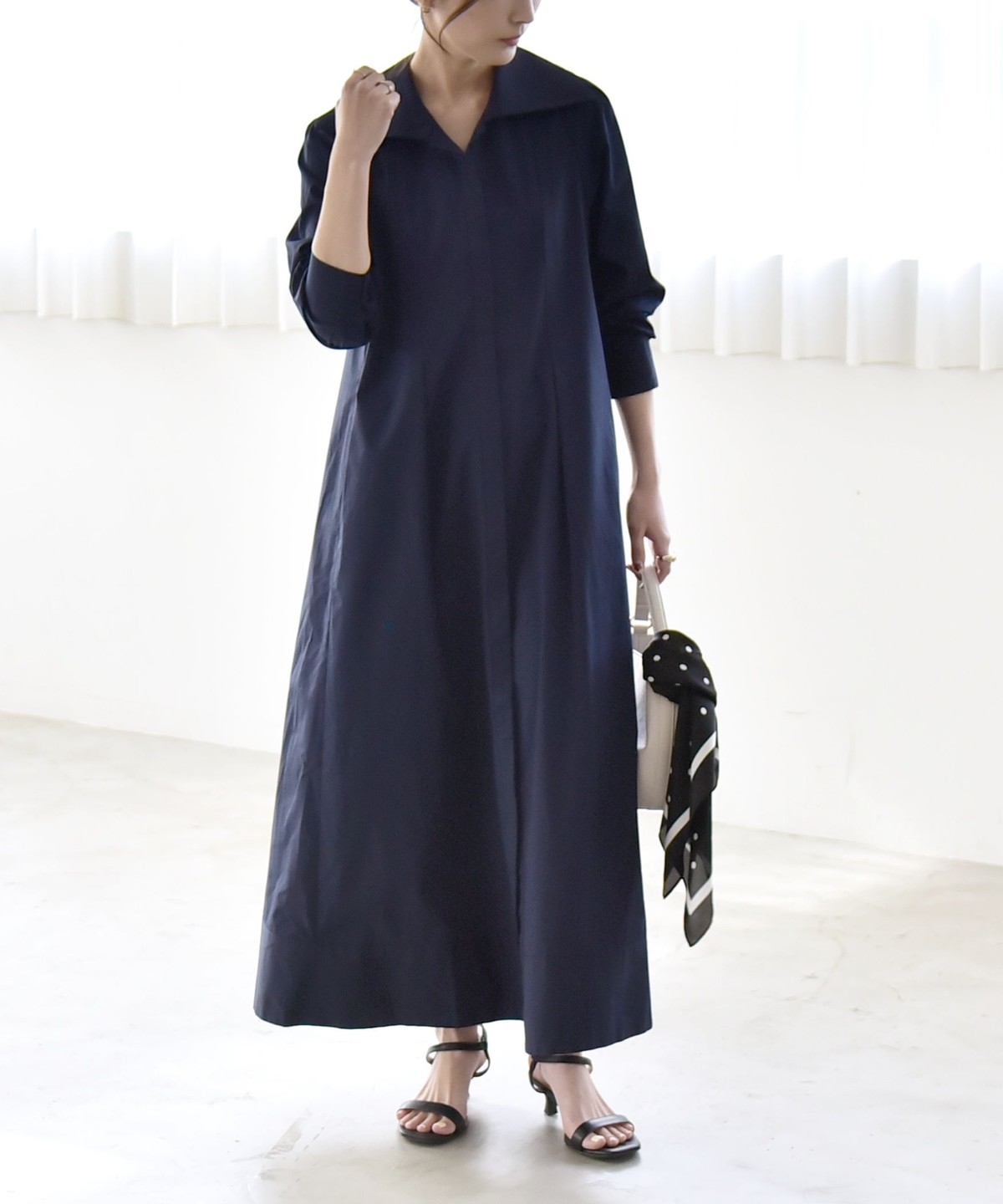 サイズ感:足首まで来るマキシ丈。フラットシューズでも地面にはつかずバランス良く着られます。袖幅や肩幅は広すぎないですが、身幅はゆったりとしていて窮屈感はありません。