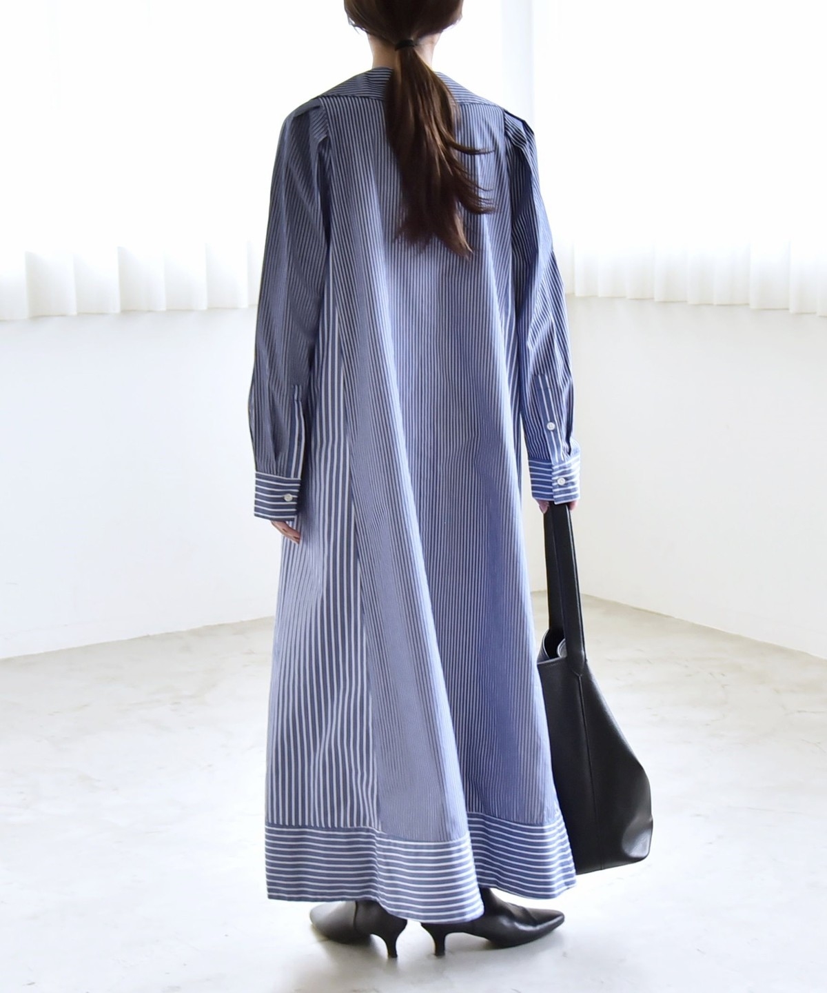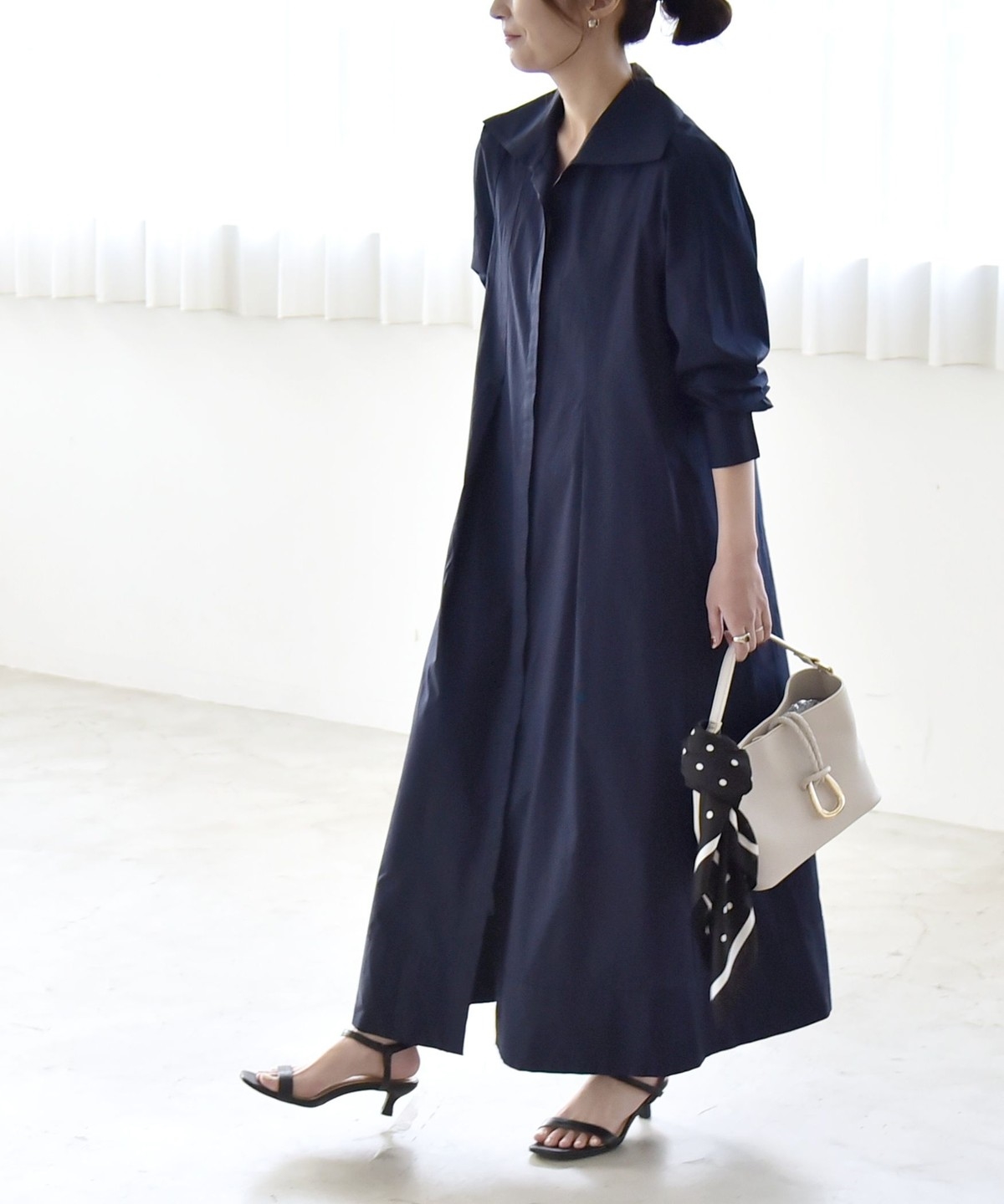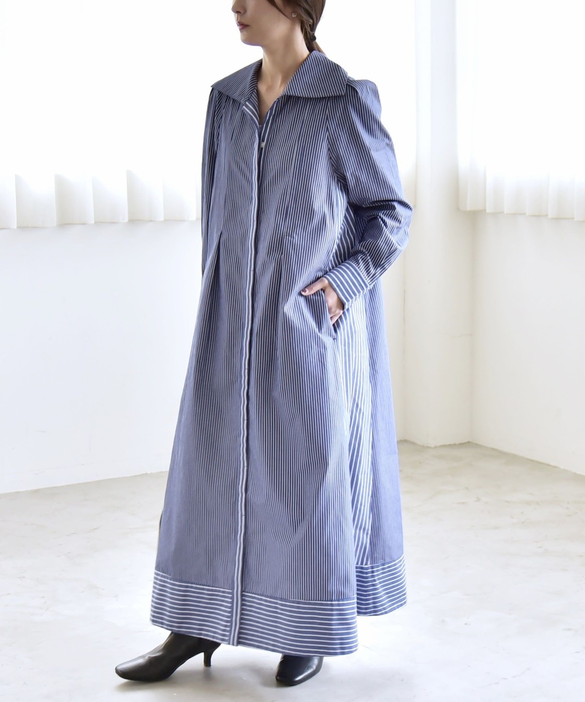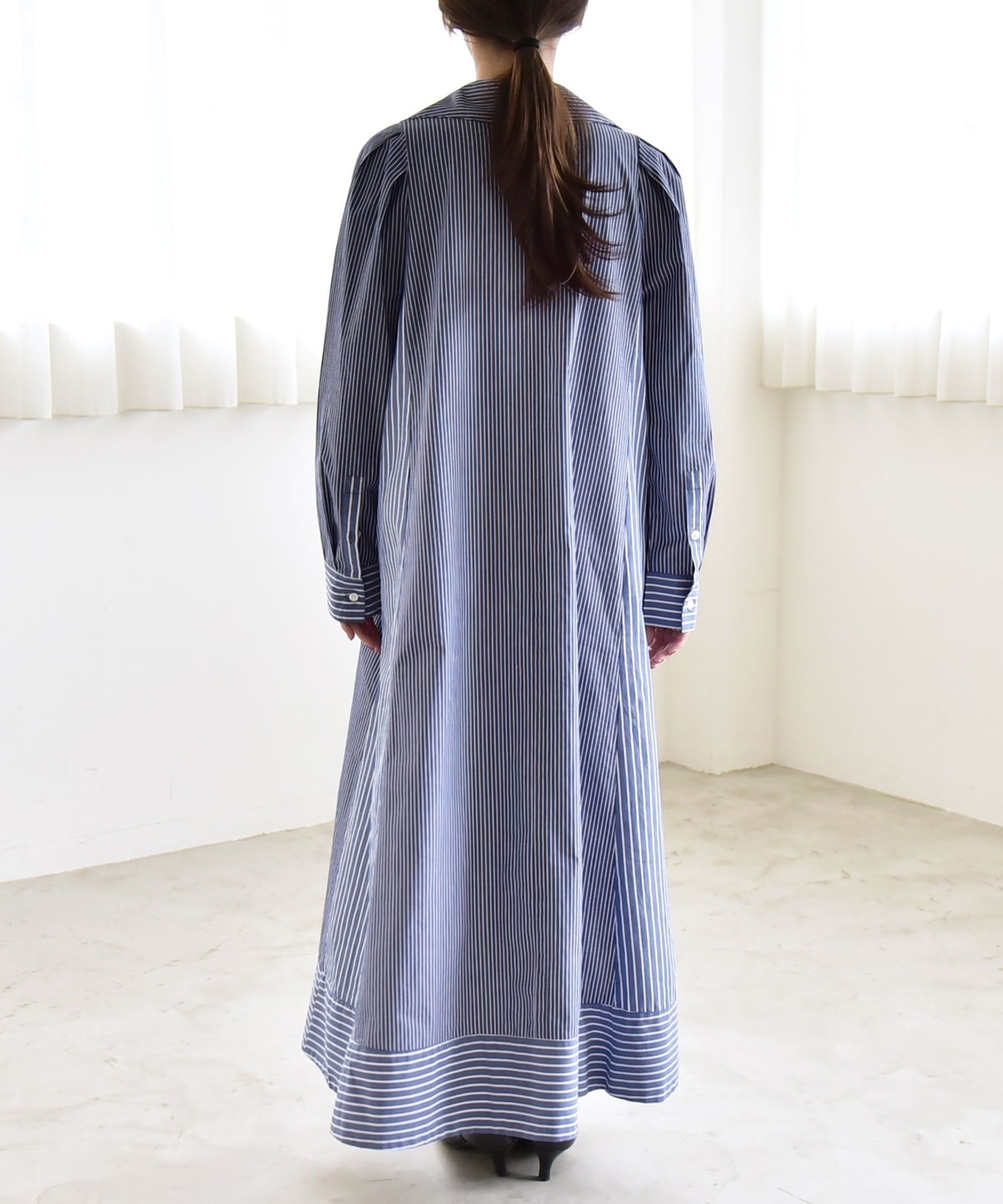 サイズ感:足首まで来るマキシ丈。フラットシューズでも地面にはつかずバランス良く着られます。袖幅や肩幅は広すぎないですが、身幅はゆったりとしていて窮屈感はありません。