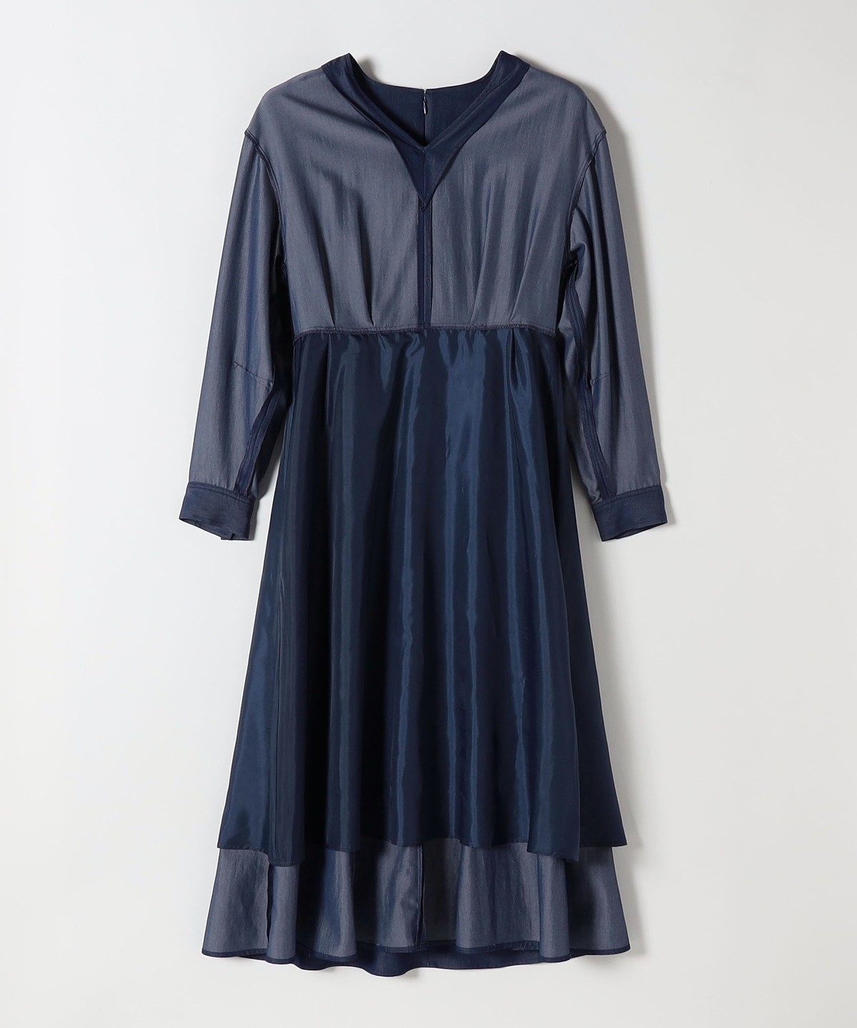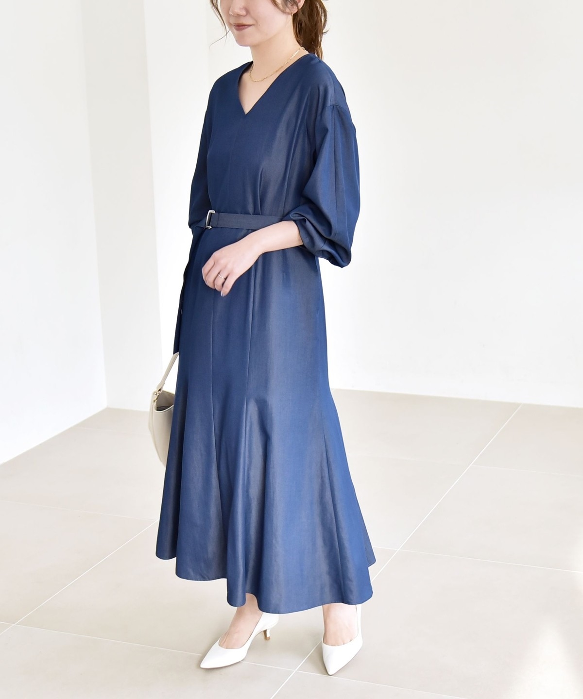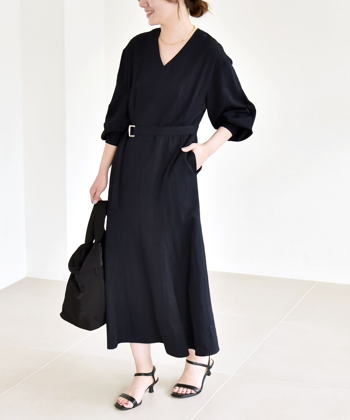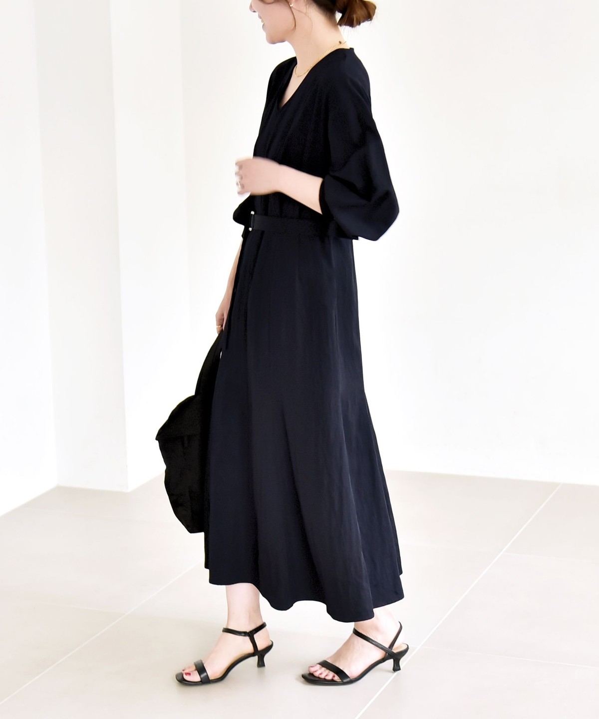 程良い開き具合のVネックと、フィット&フレアのシルエットが上品な印象のロングワンピース。