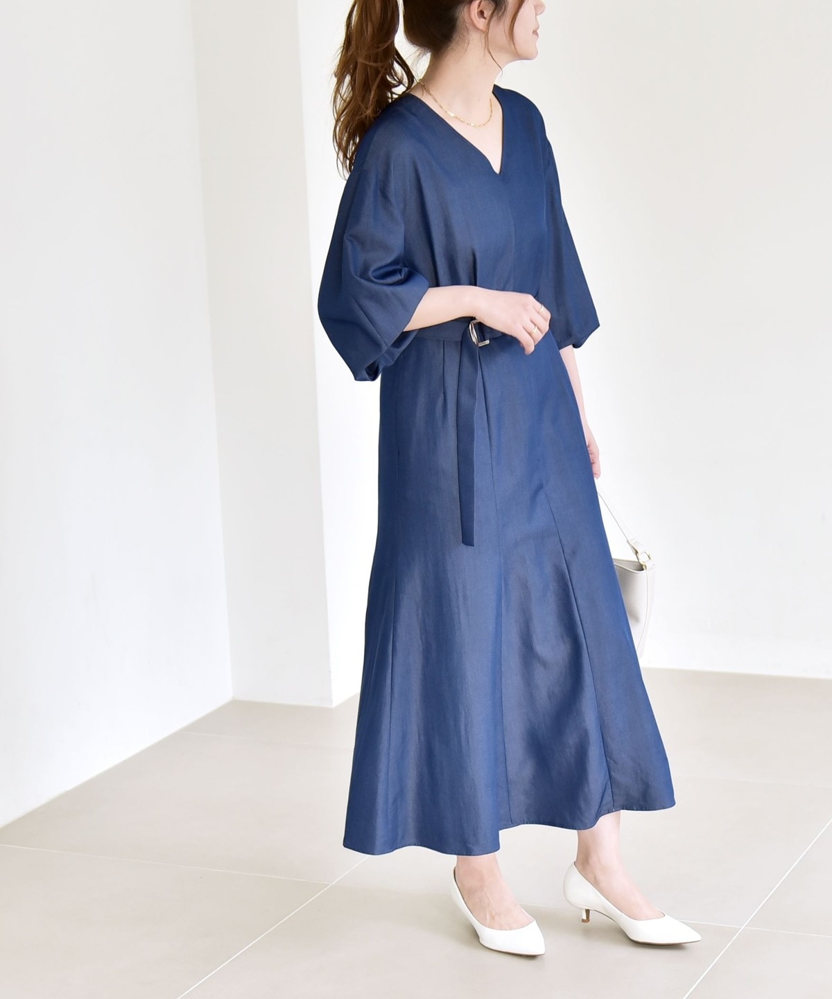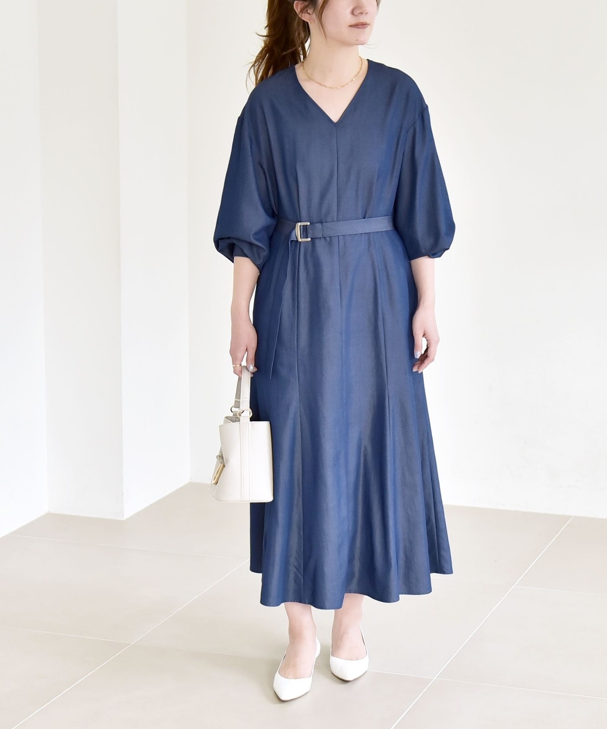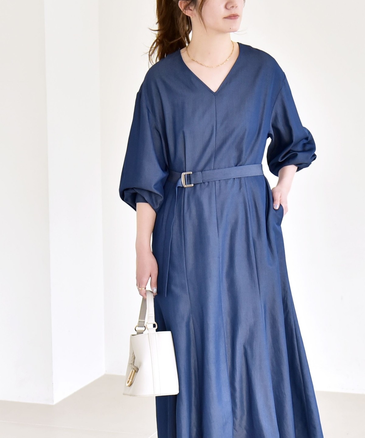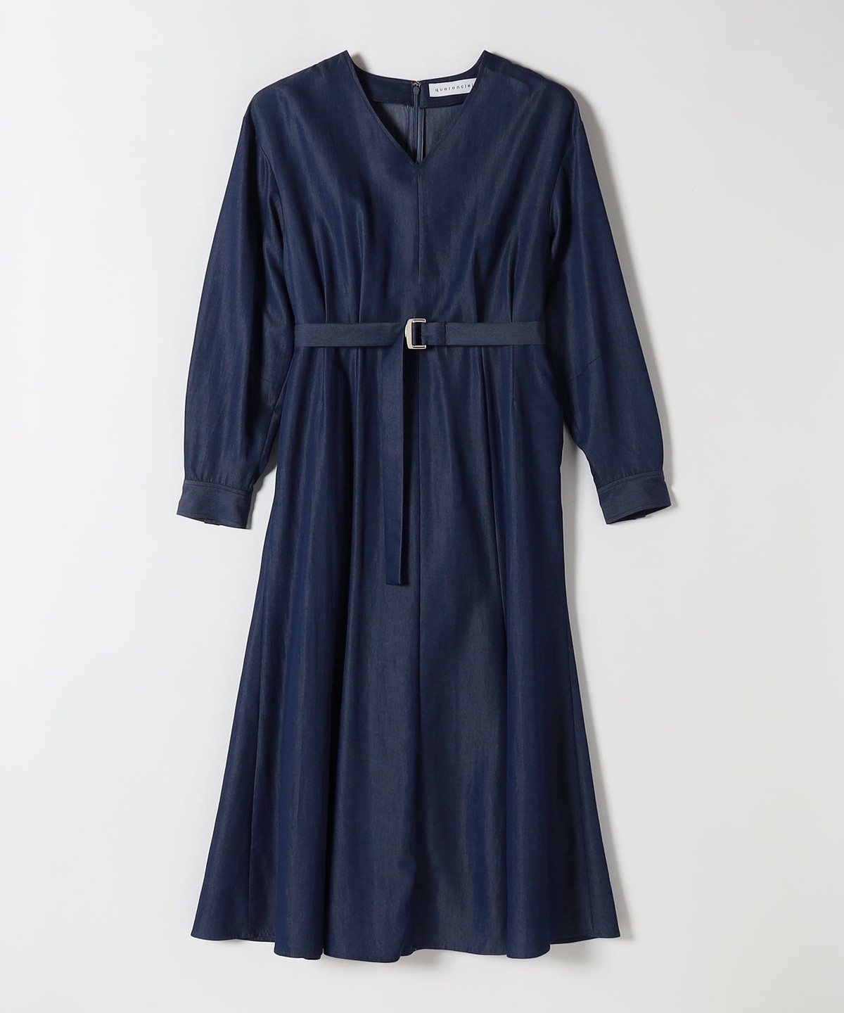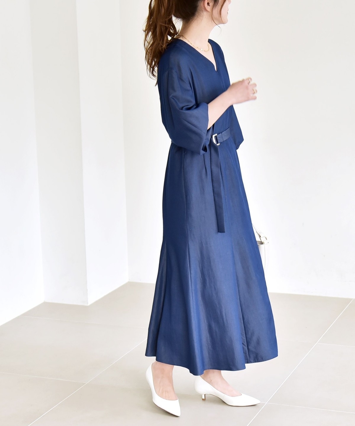 1. 《予約》quaranciel:〈洗濯機可能〉ツイル Vネック ベルト フレア ワンピース ブルー