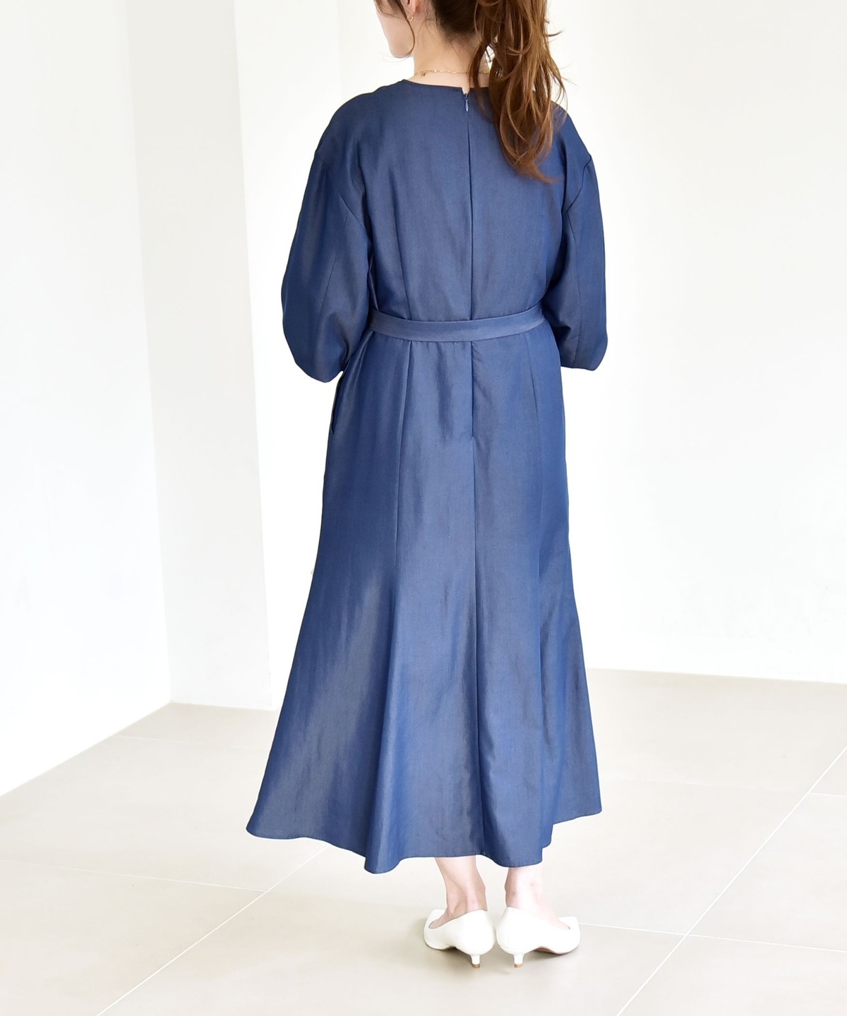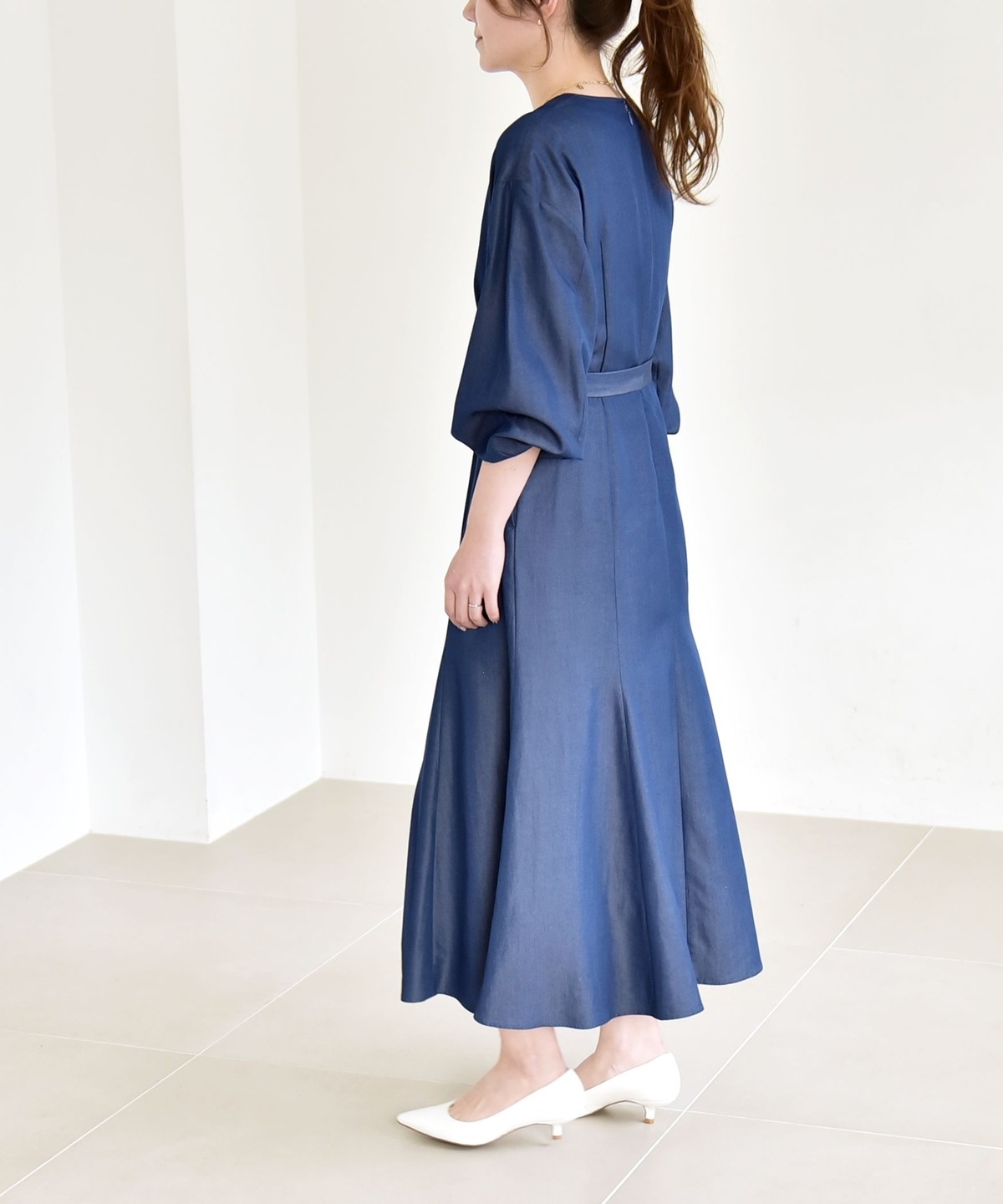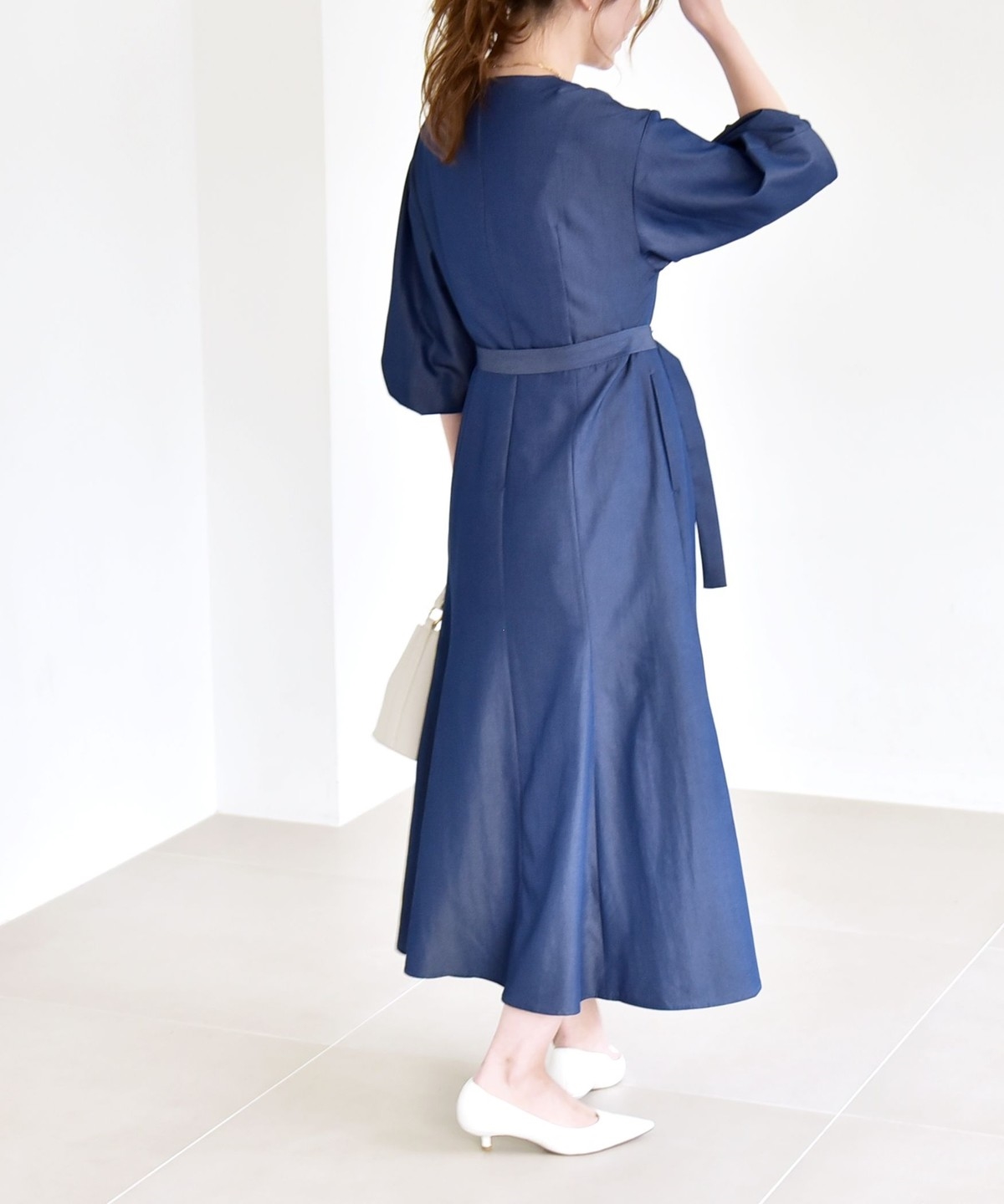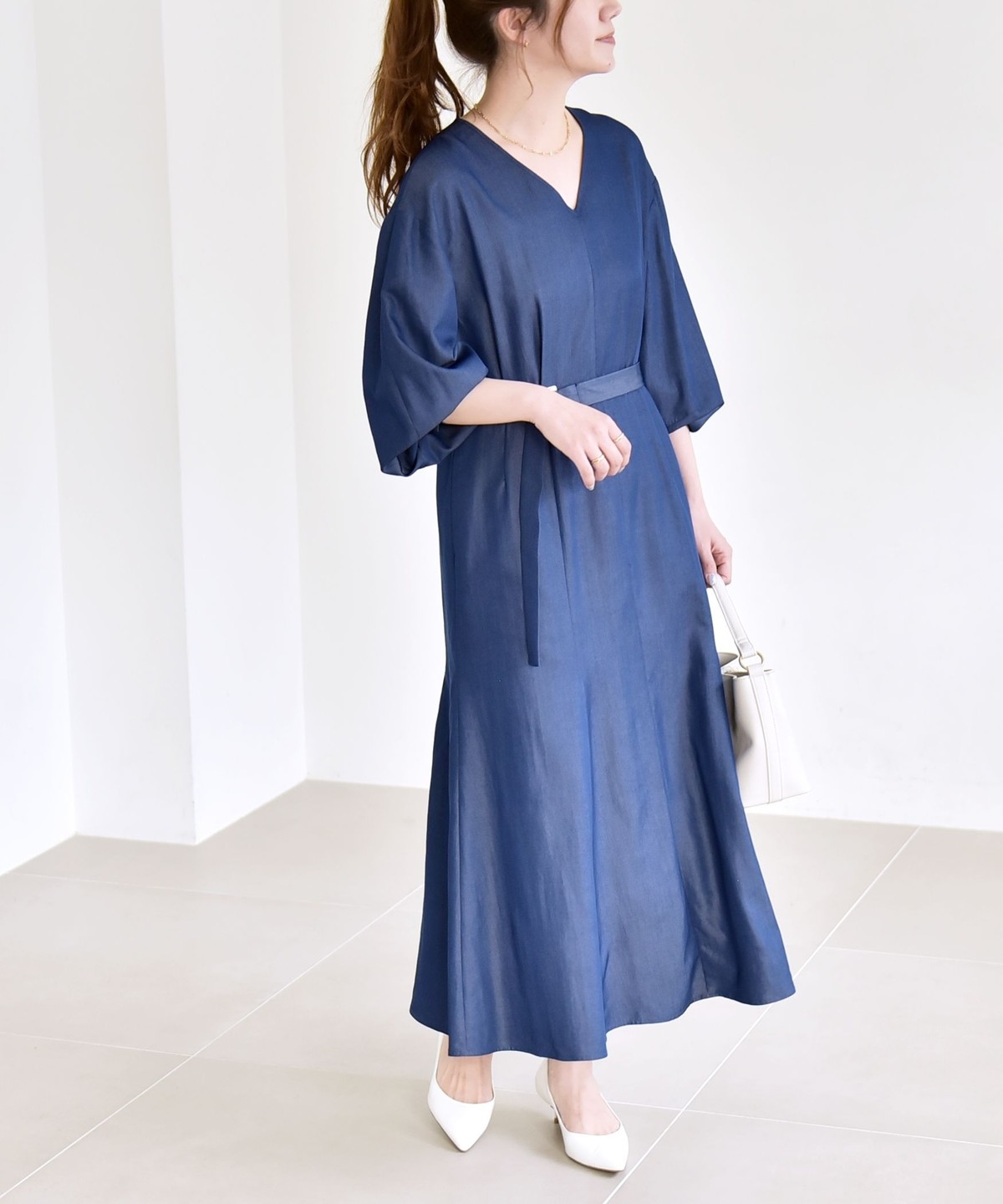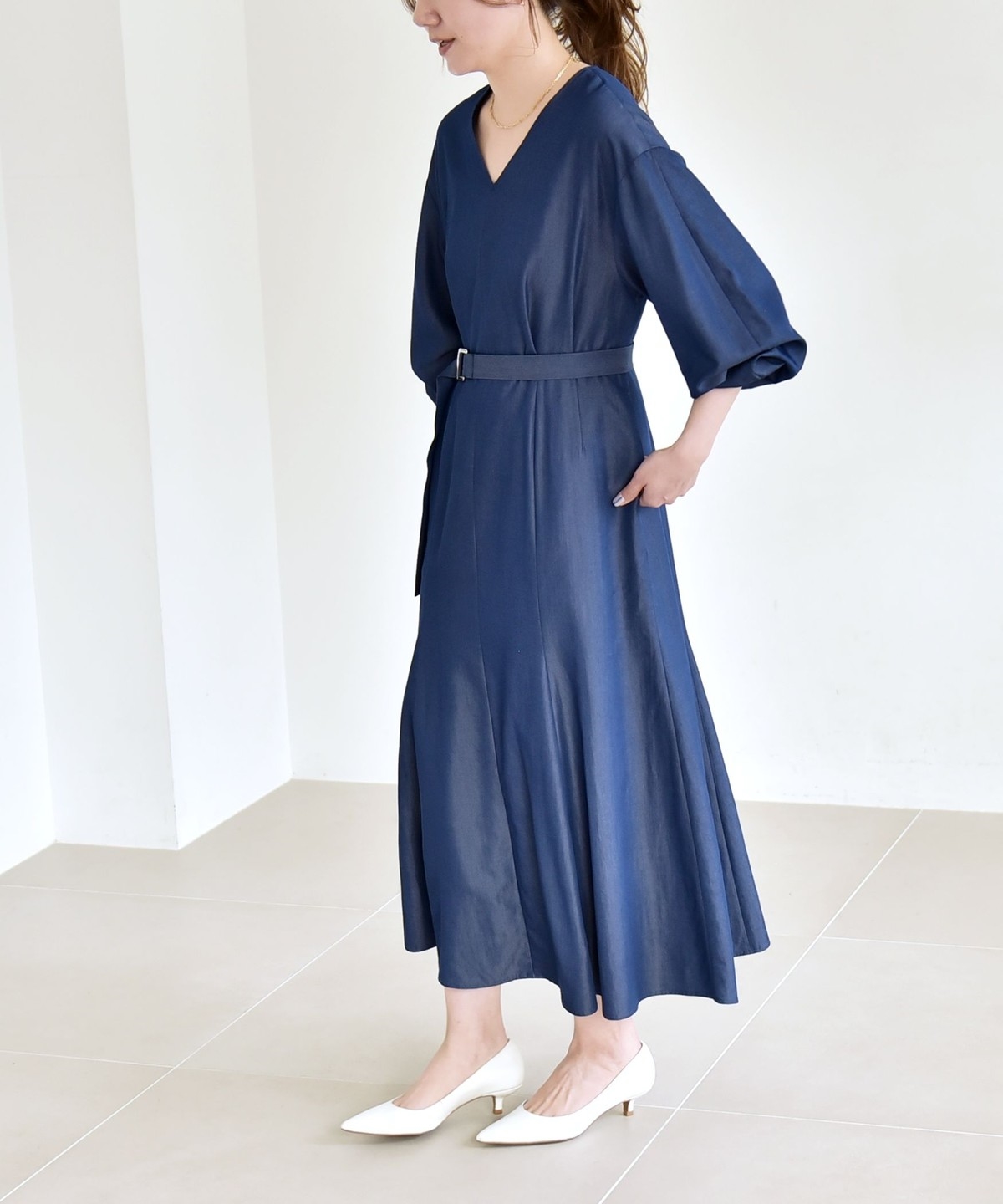 1. 《予約》quaranciel:〈洗濯機可能〉ツイル Vネック ベルト フレア ワンピース ブルー