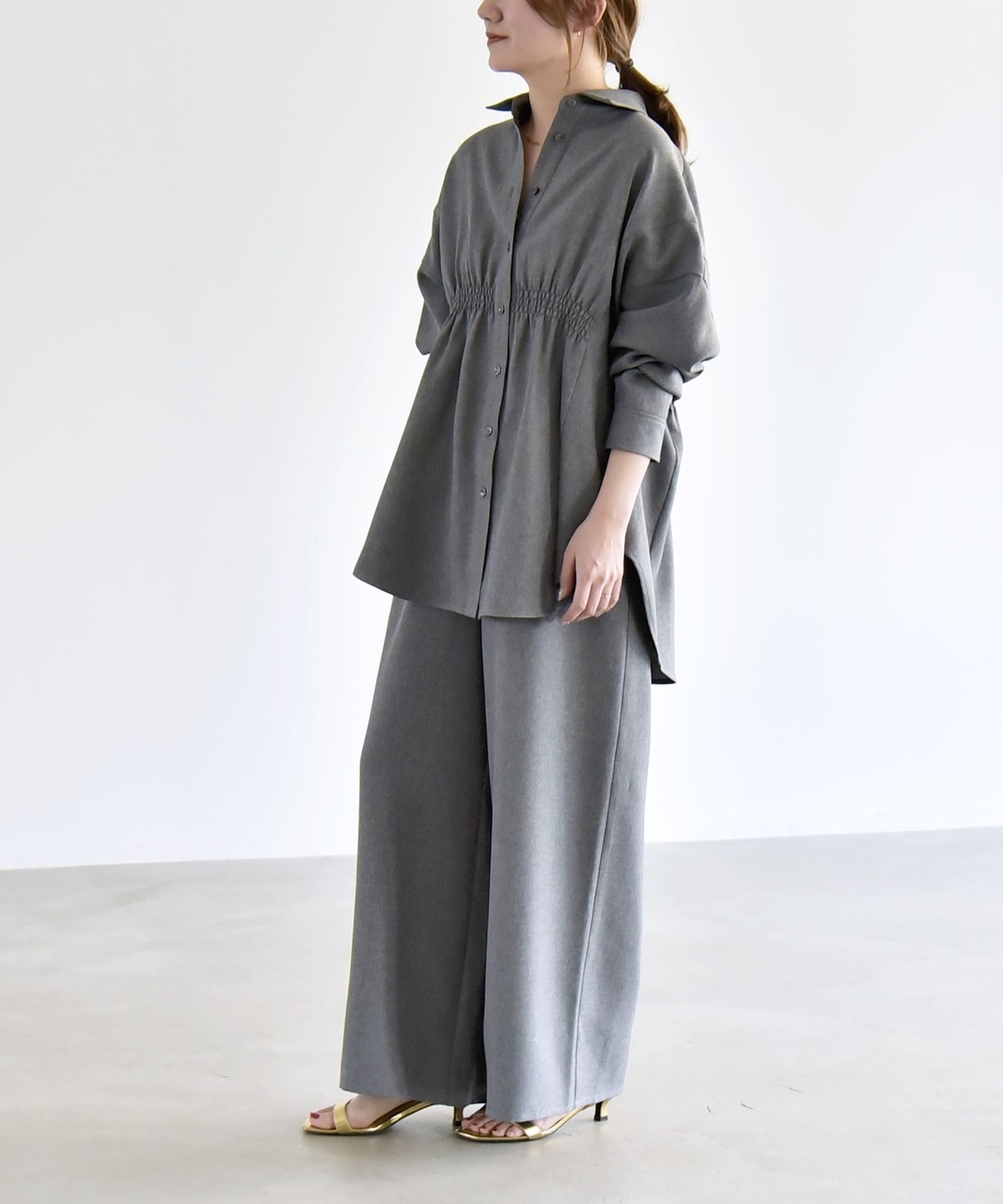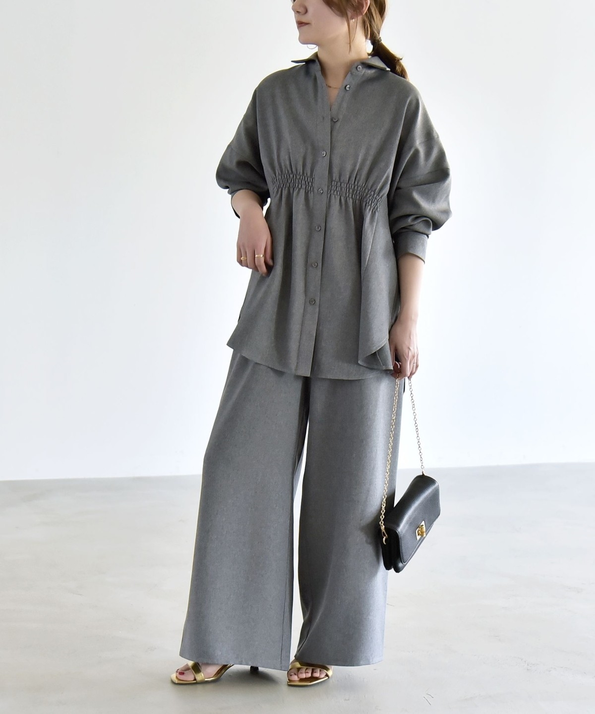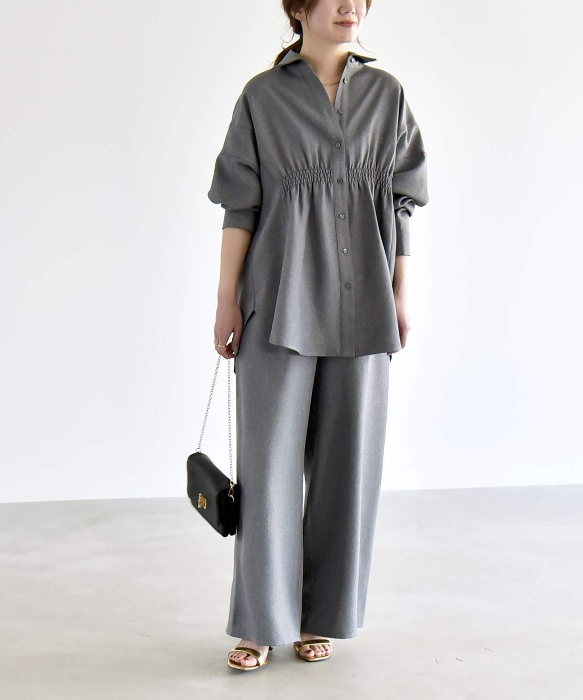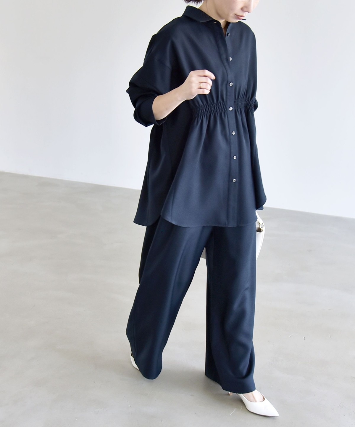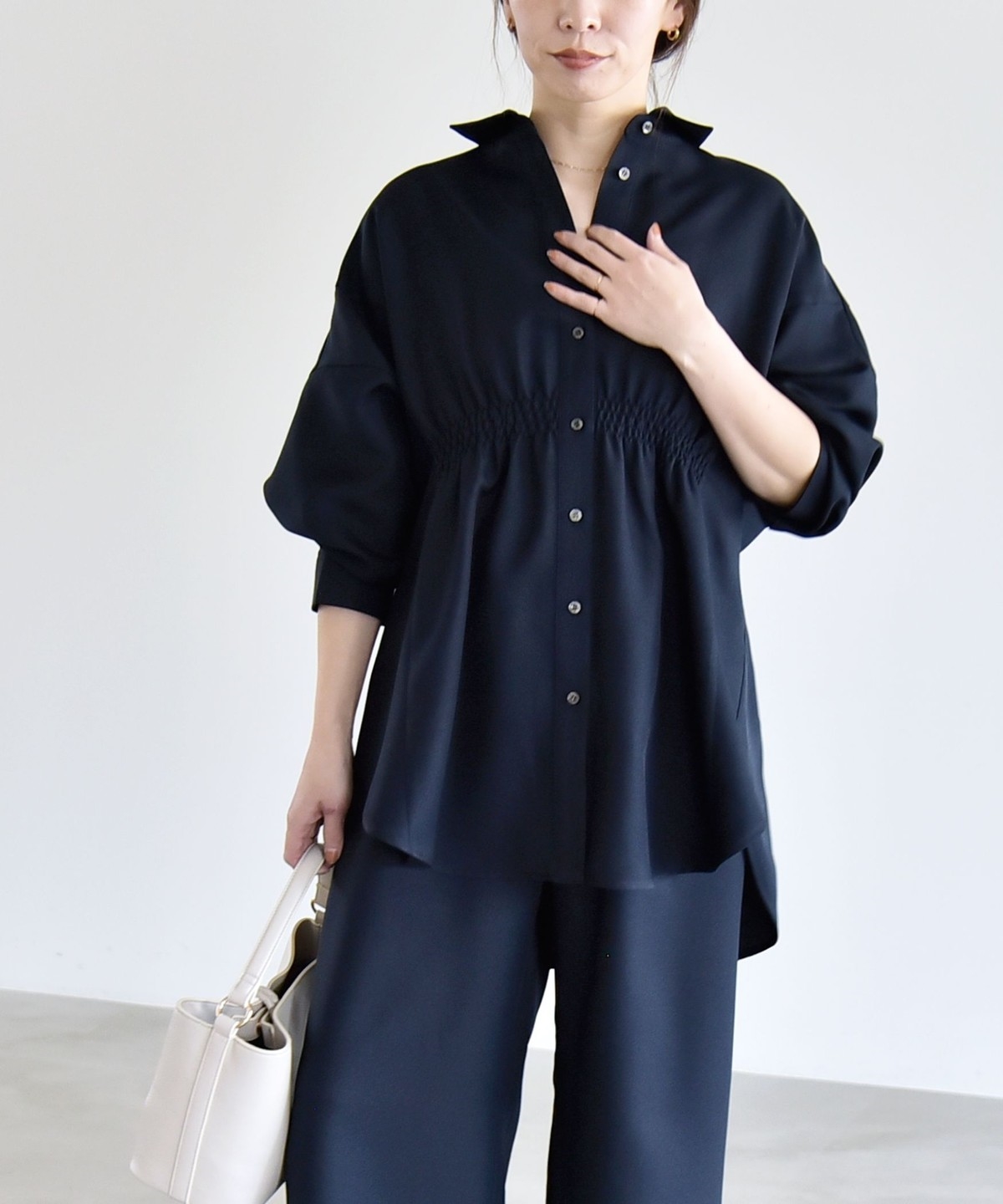 シャツはウエストに細かなシャーリングを施し、自然にくびれを作ってメリハリのあるシルエットを演出。