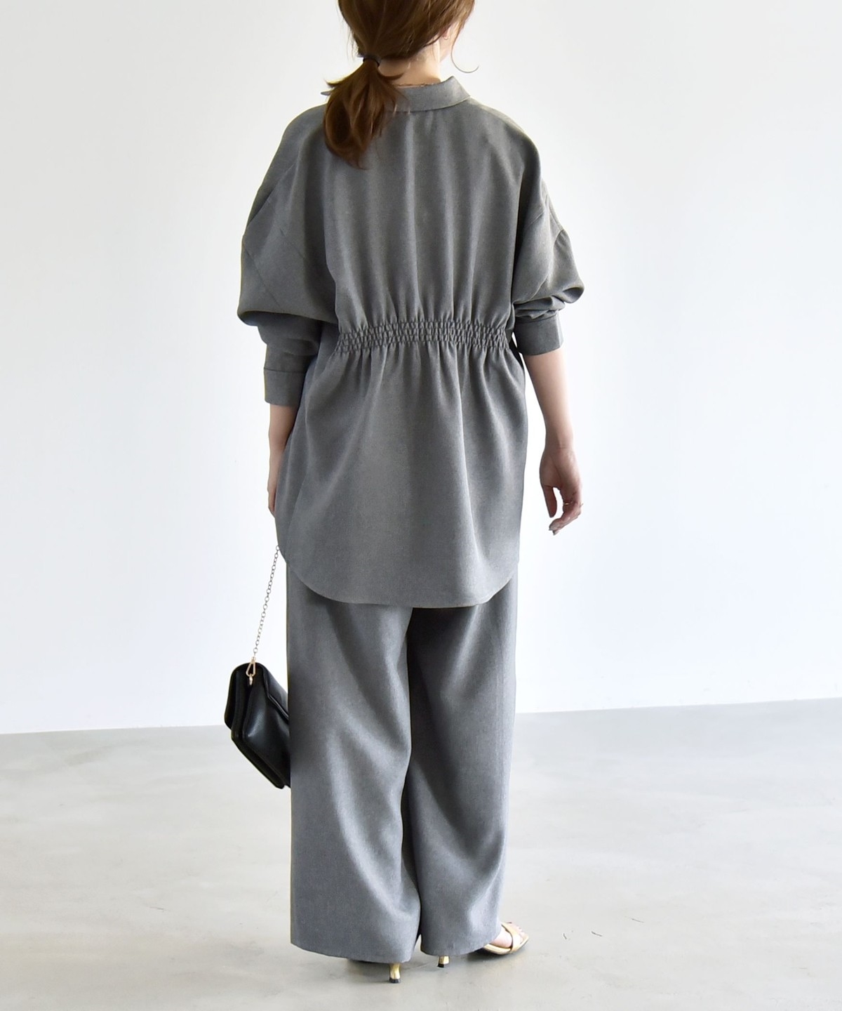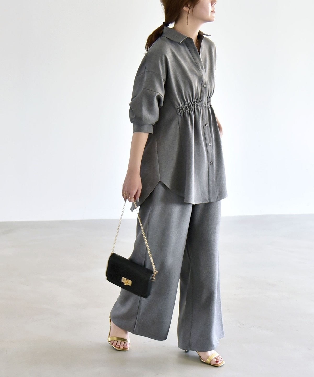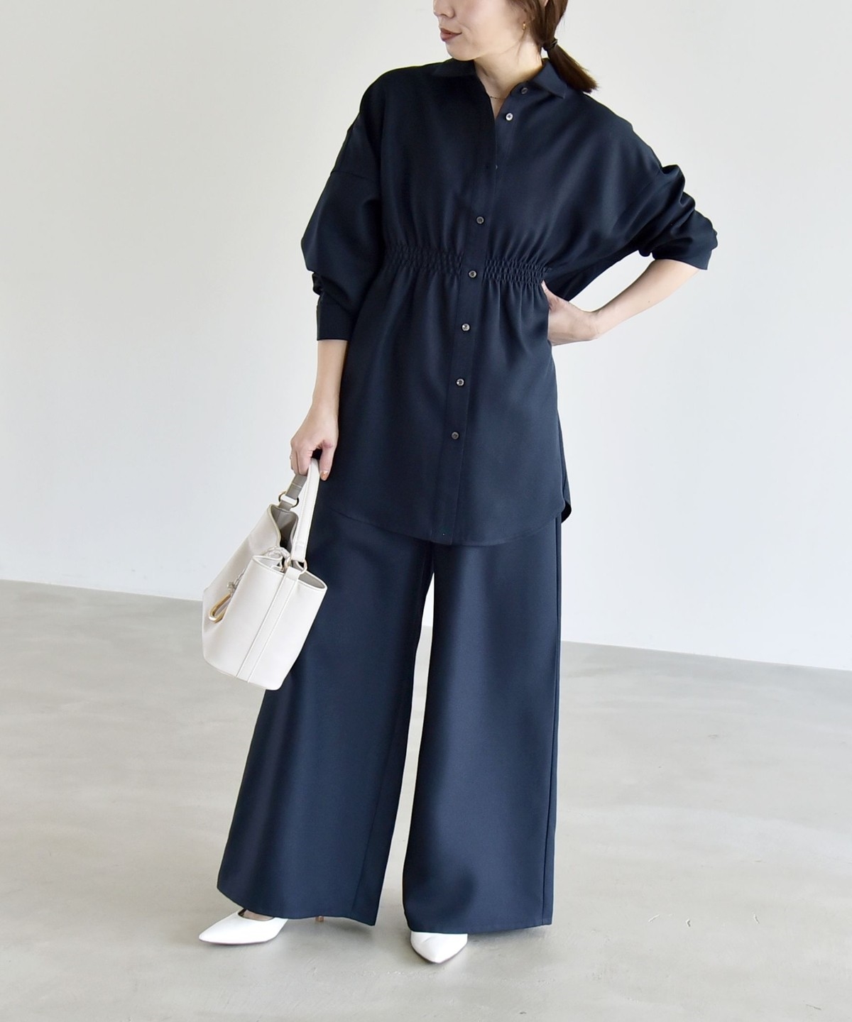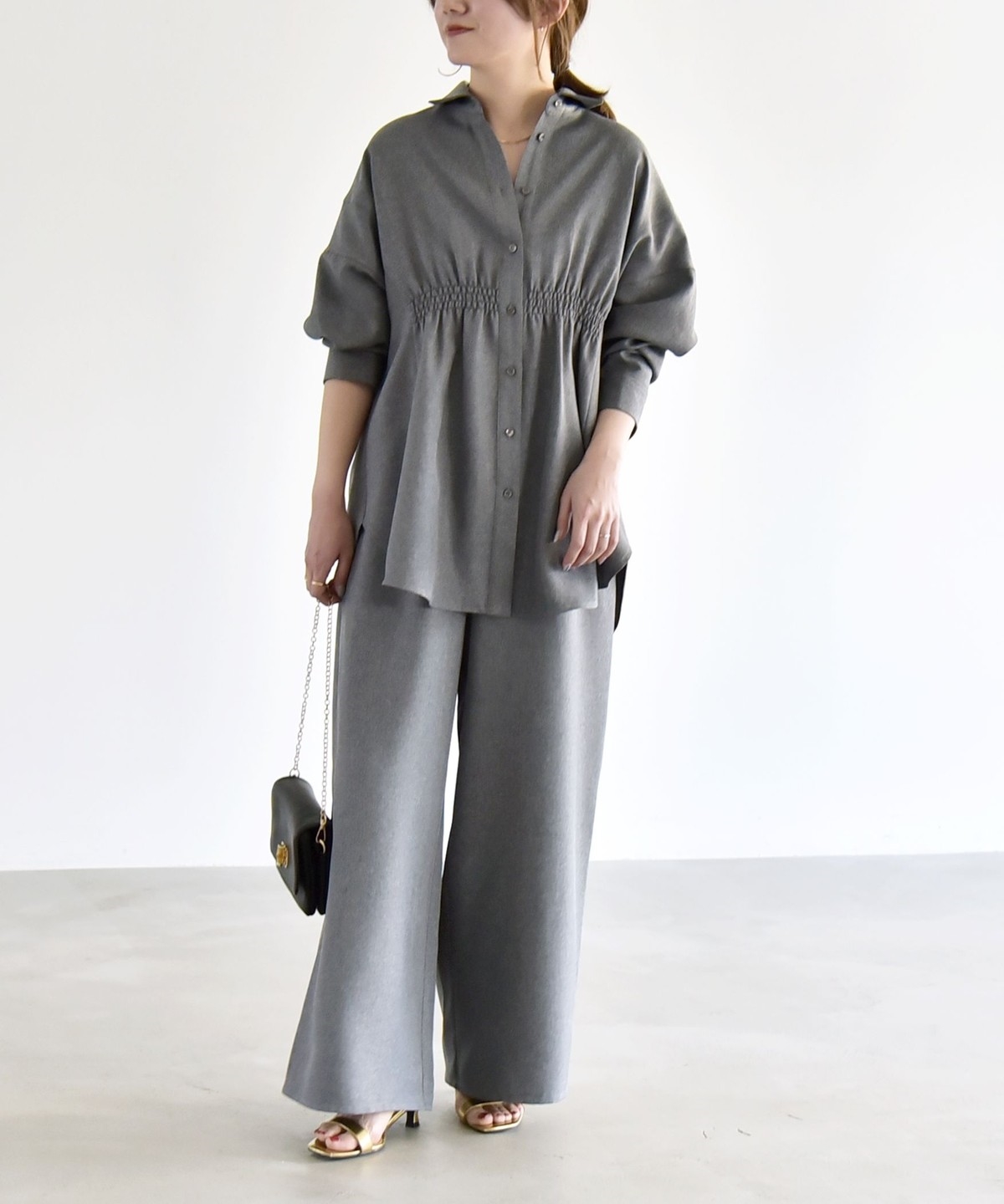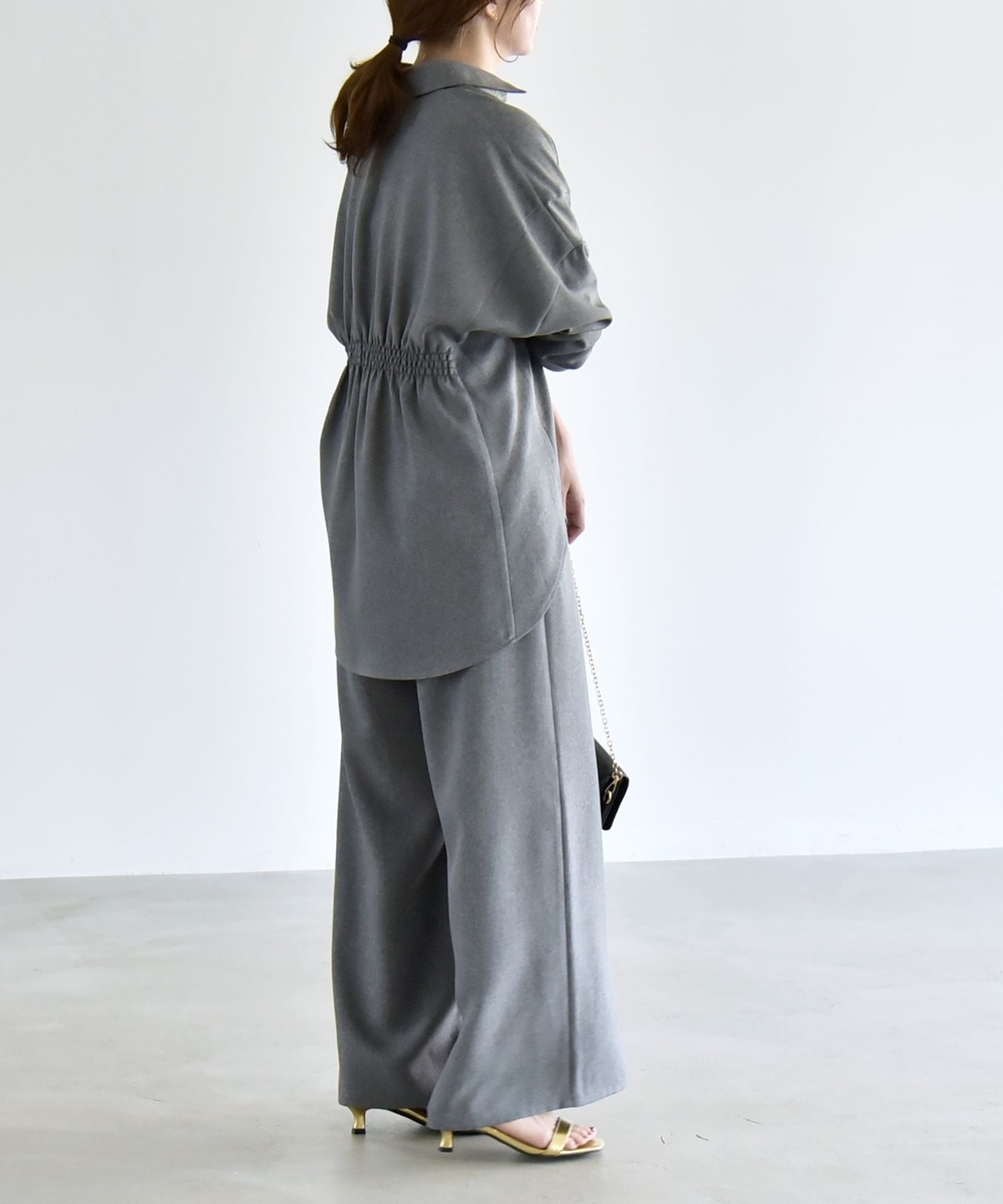 シャツはウエストに細かなシャーリングを施し、自然にくびれを作ってメリハリのあるシルエットを演出。