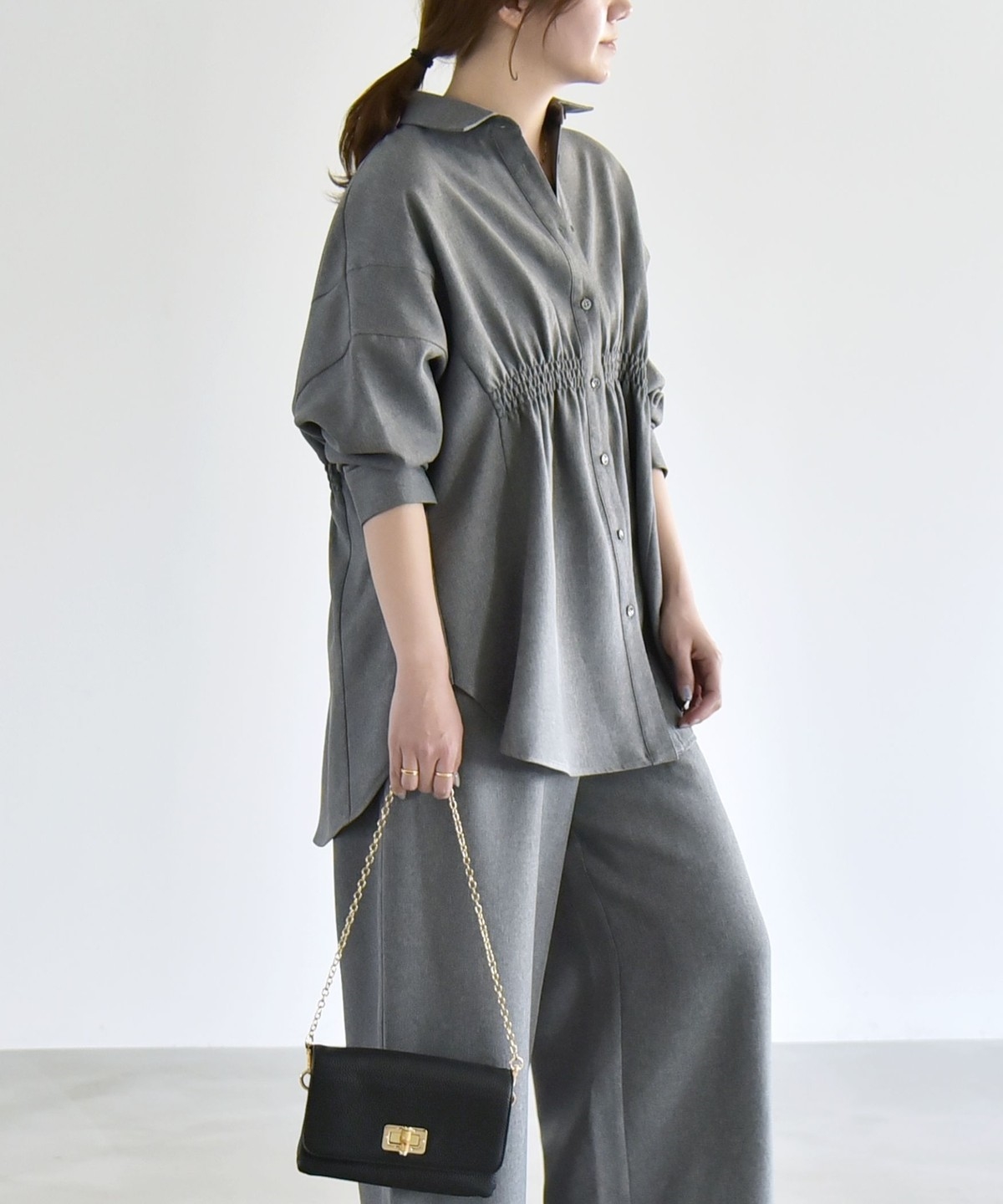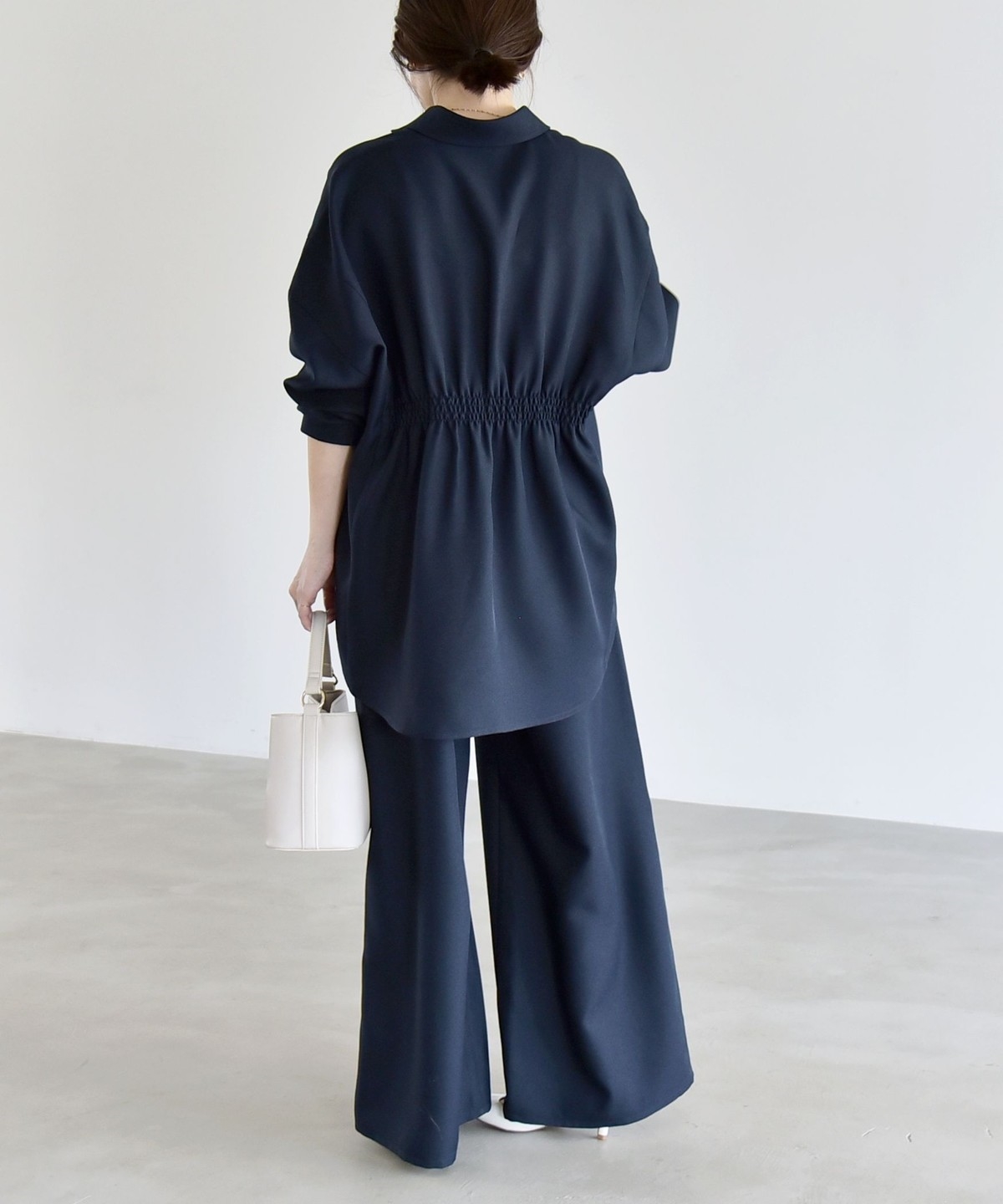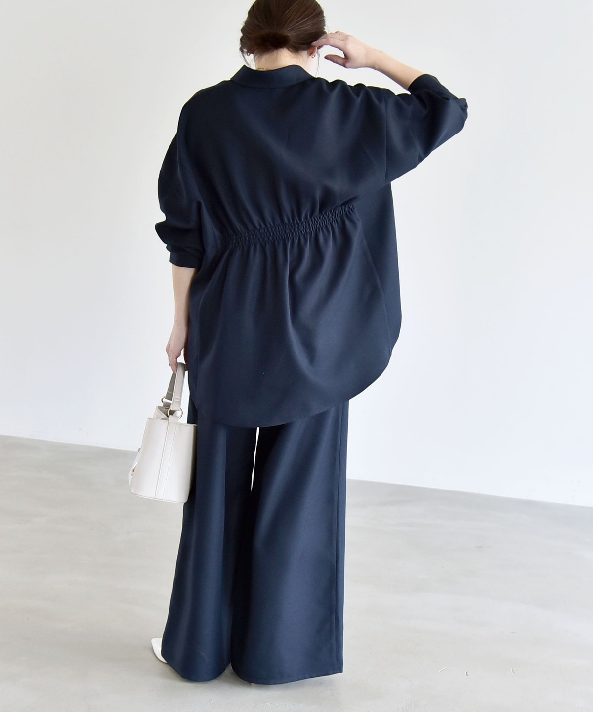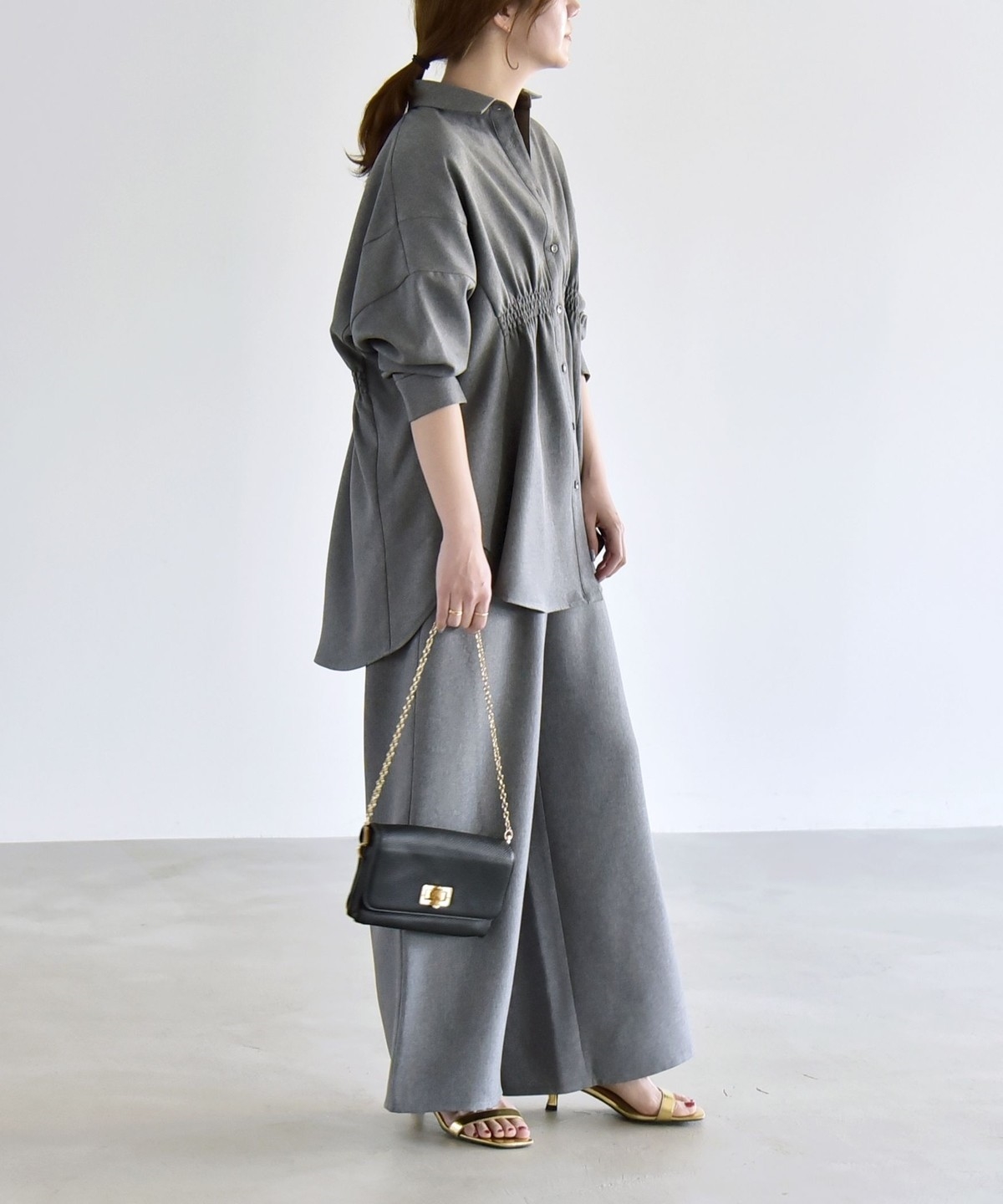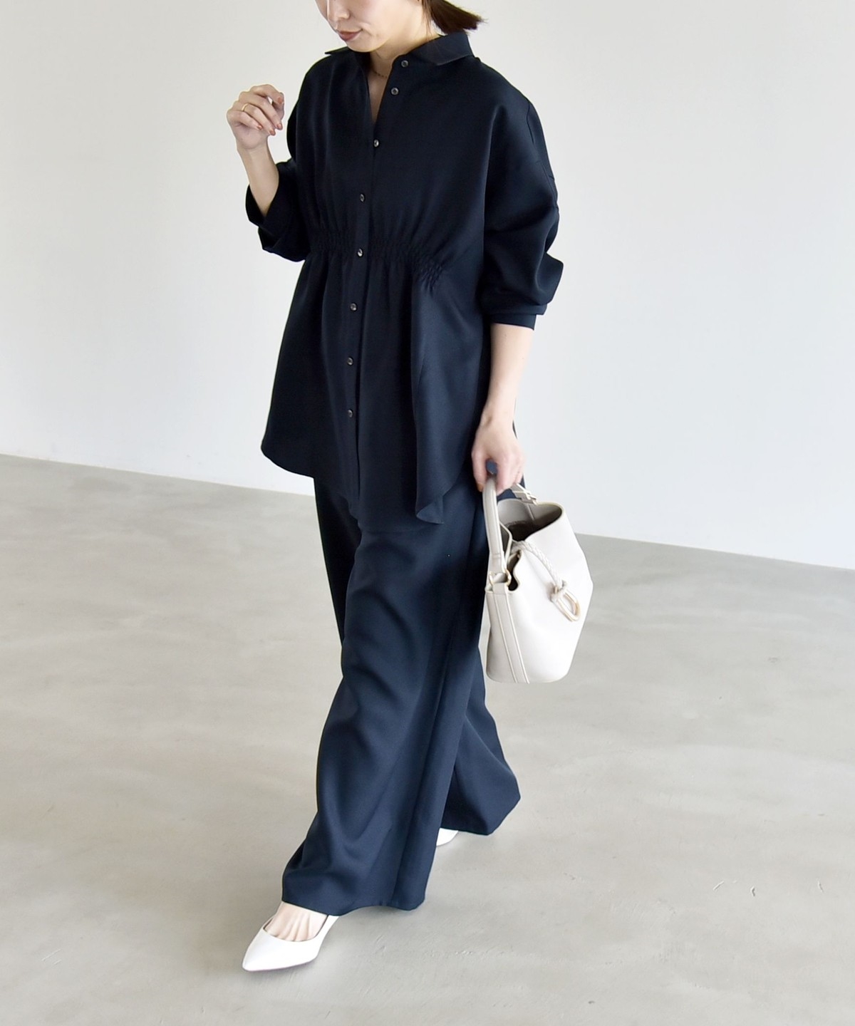 シャツはウエストに細かなシャーリングを施し、自然にくびれを作ってメリハリのあるシルエットを演出。