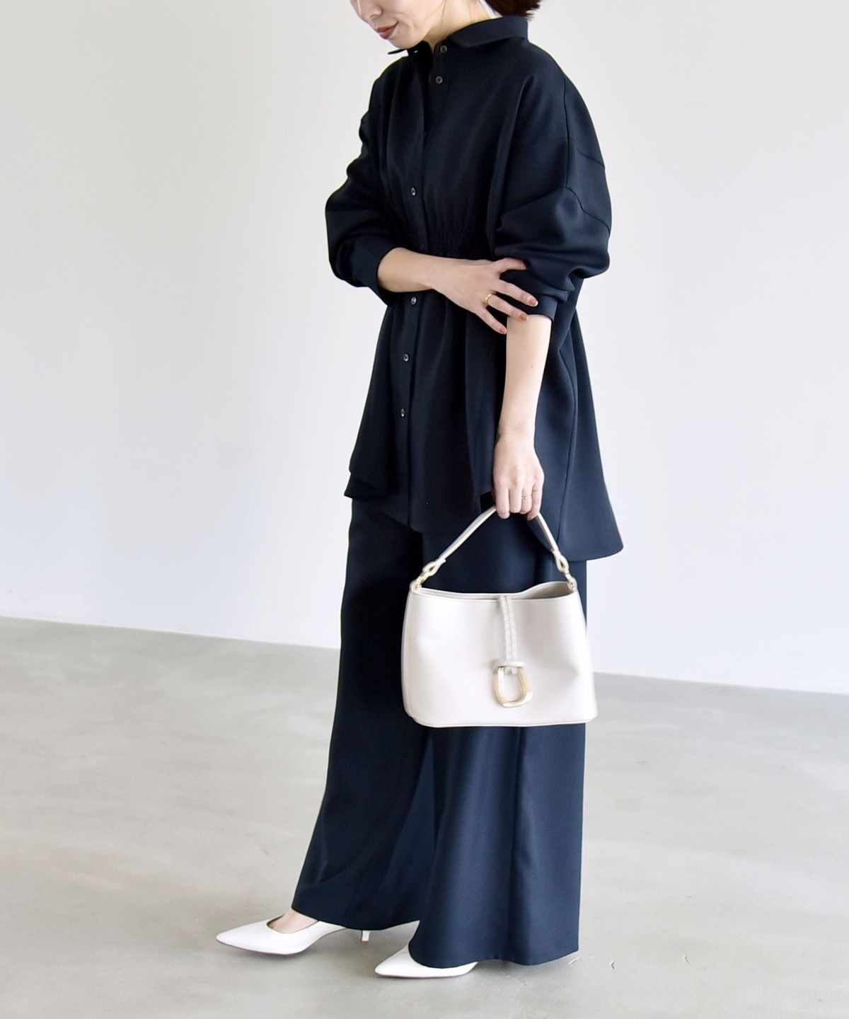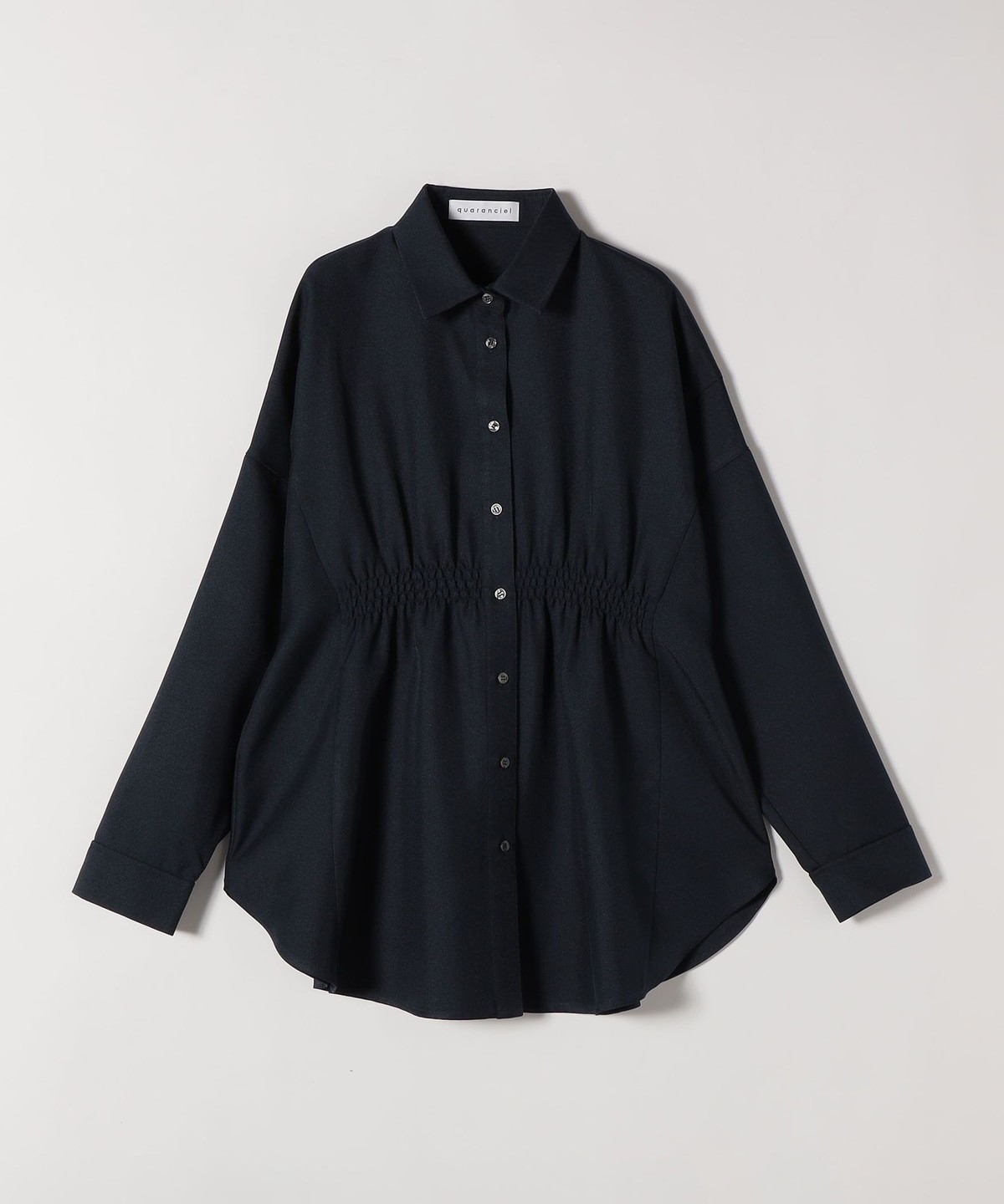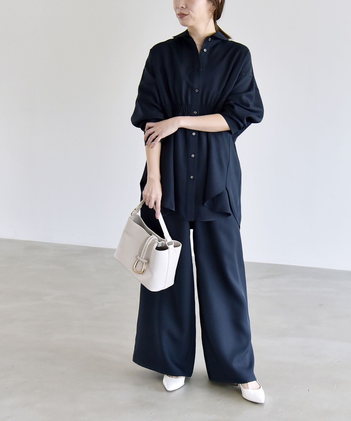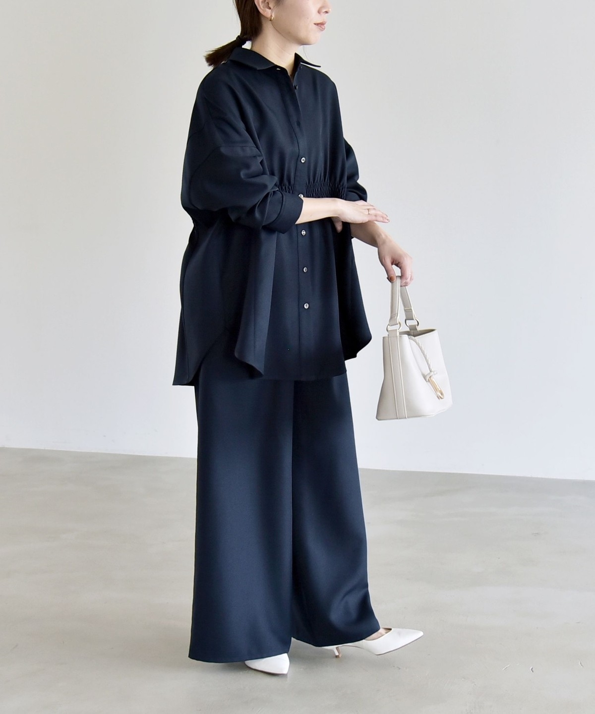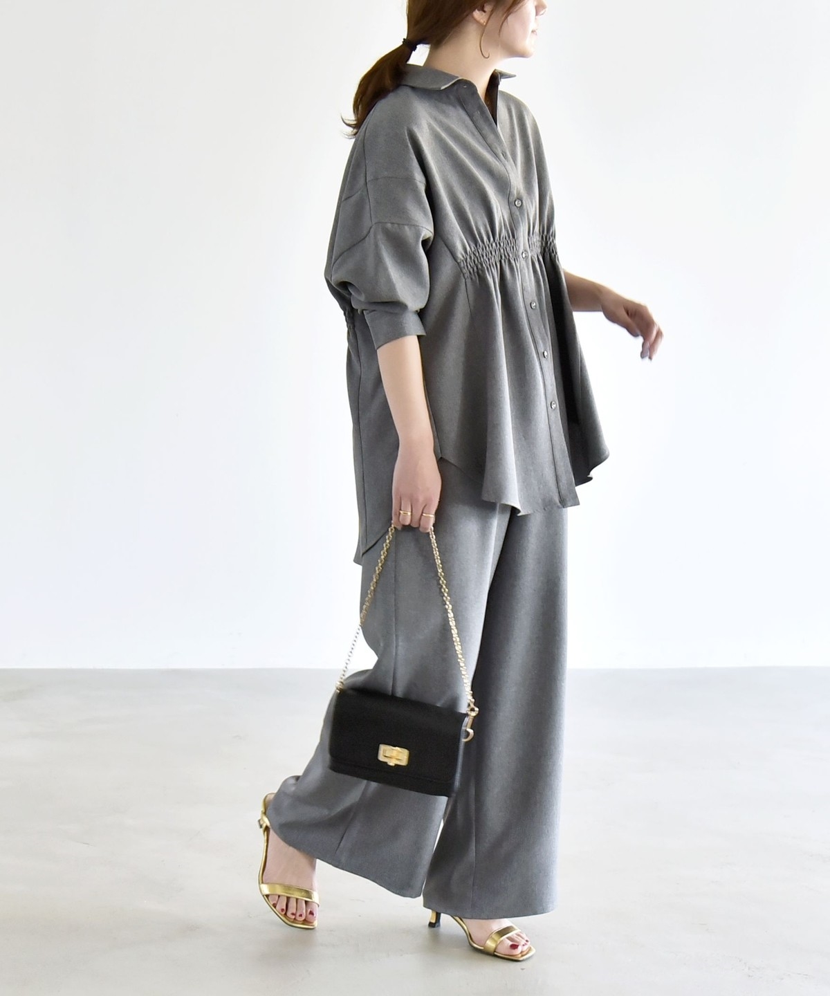 シャツはウエストに細かなシャーリングを施し、自然にくびれを作ってメリハリのあるシルエットを演出。