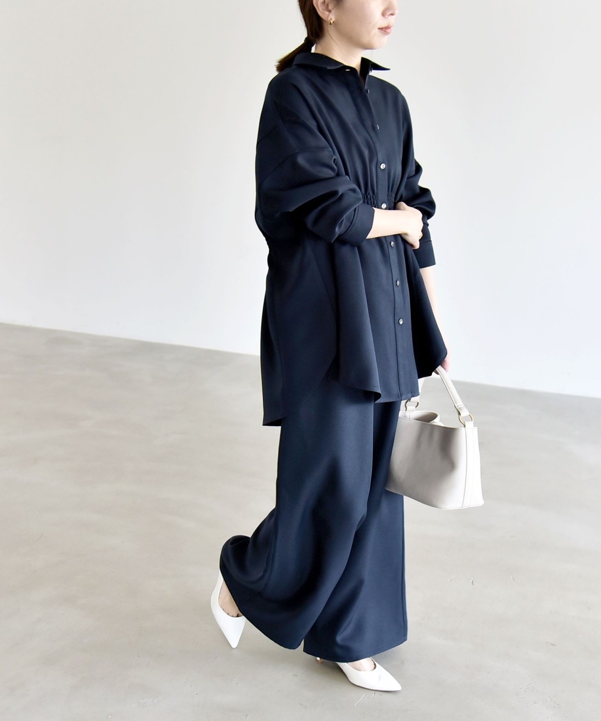 たっぷりとしたオーバーシルエットのシャツと、セミワイドシルエットのイージーパンツのセットアイテム。