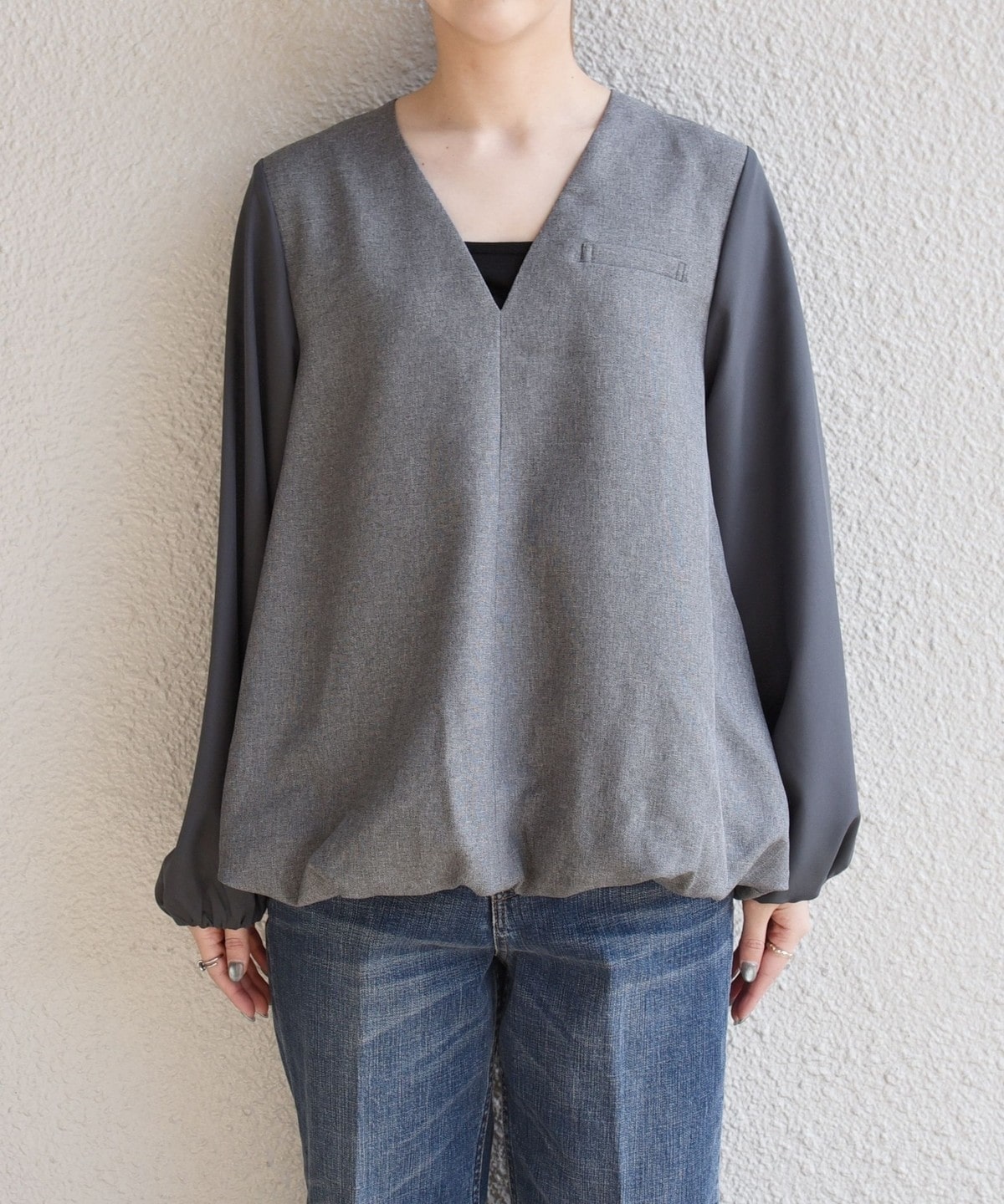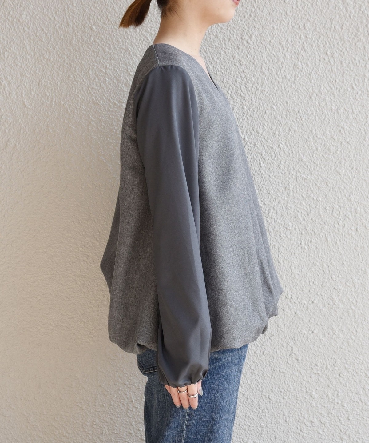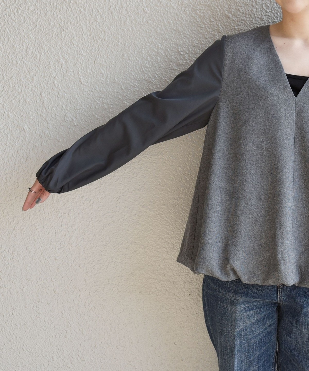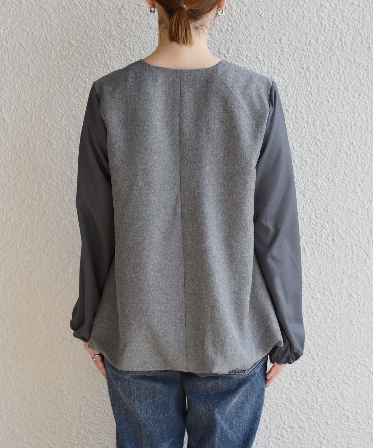 異素材切り替えの袖は、袖口にゴムを施し、きゅっと捲ってパフスリーブのようにボリューム感を出して着こなせます。