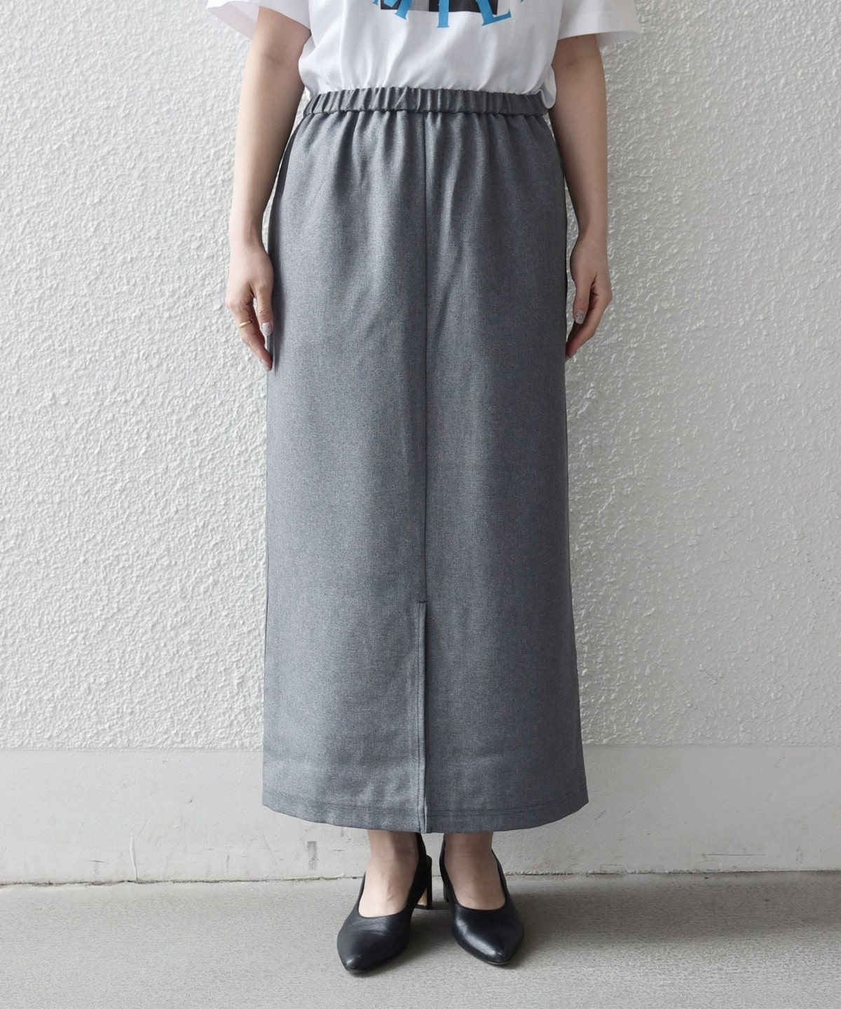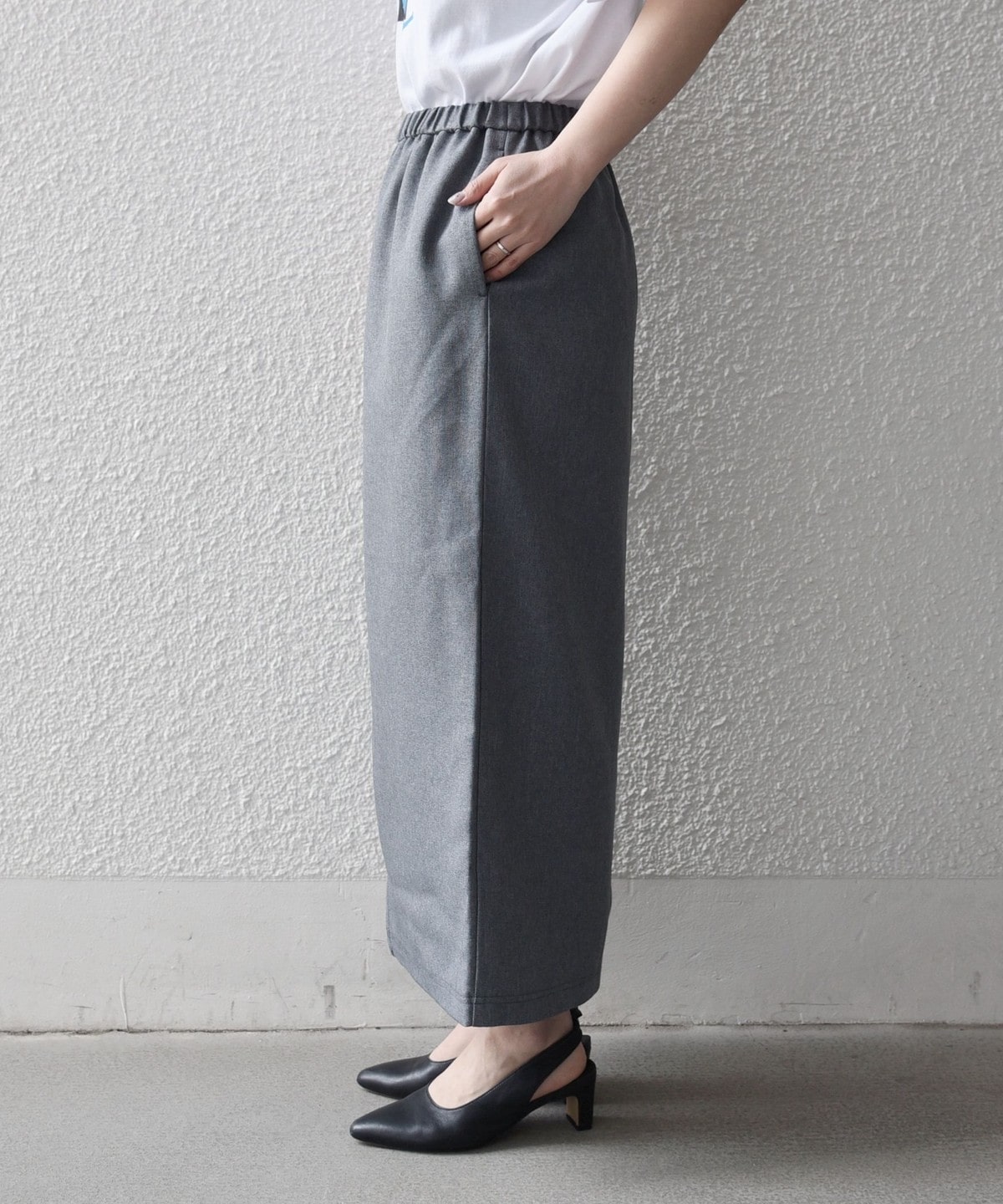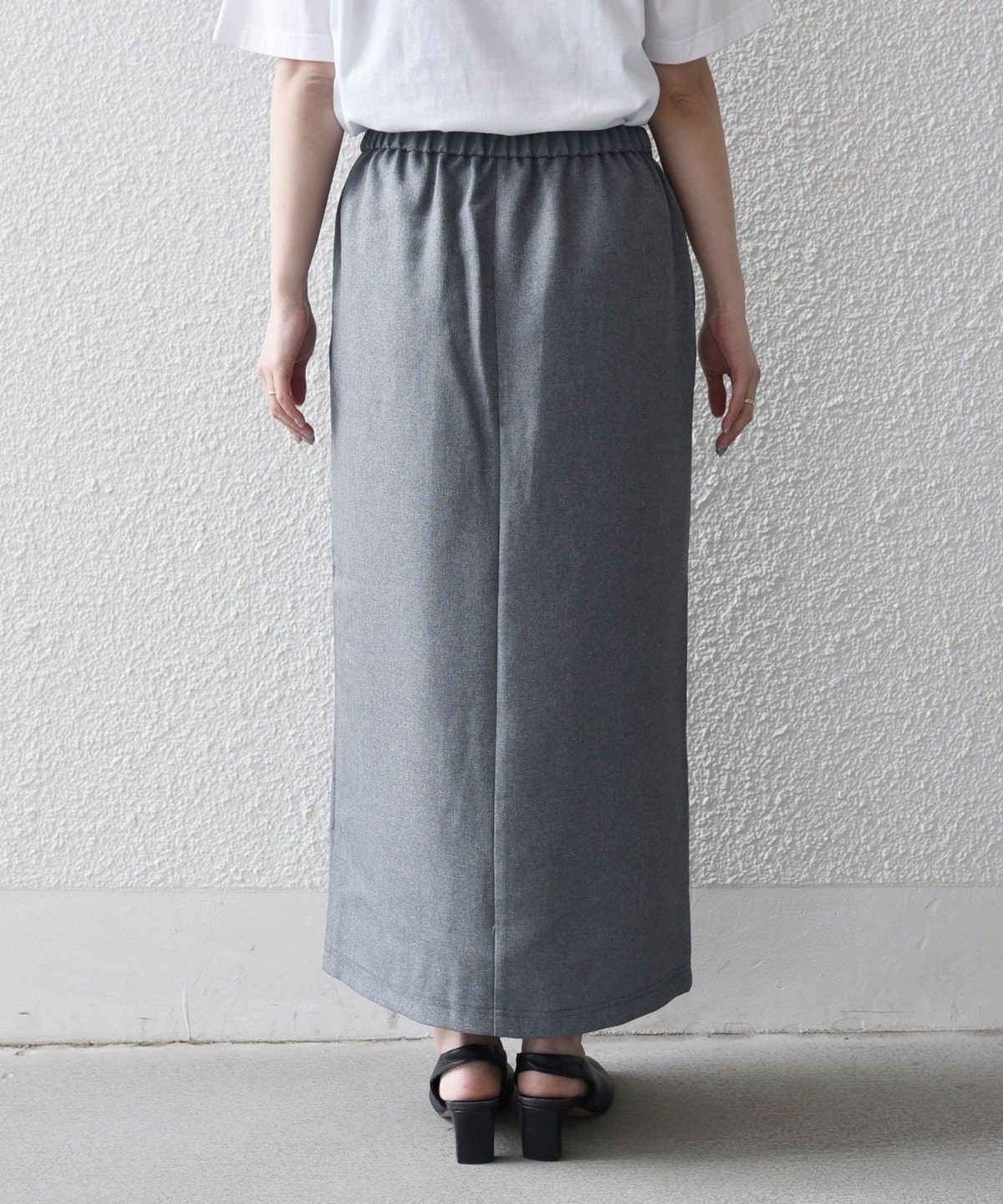 スカートは、ミニマルなデザインで、すとんと落ちるストレートシルエットがポイント。